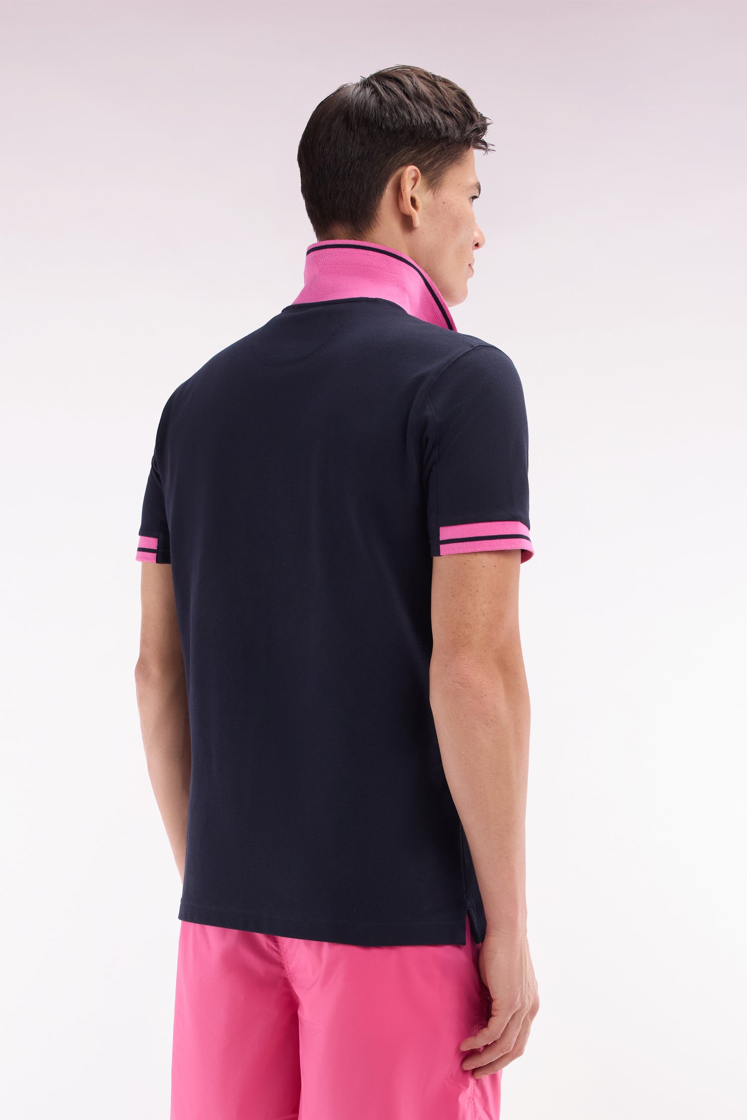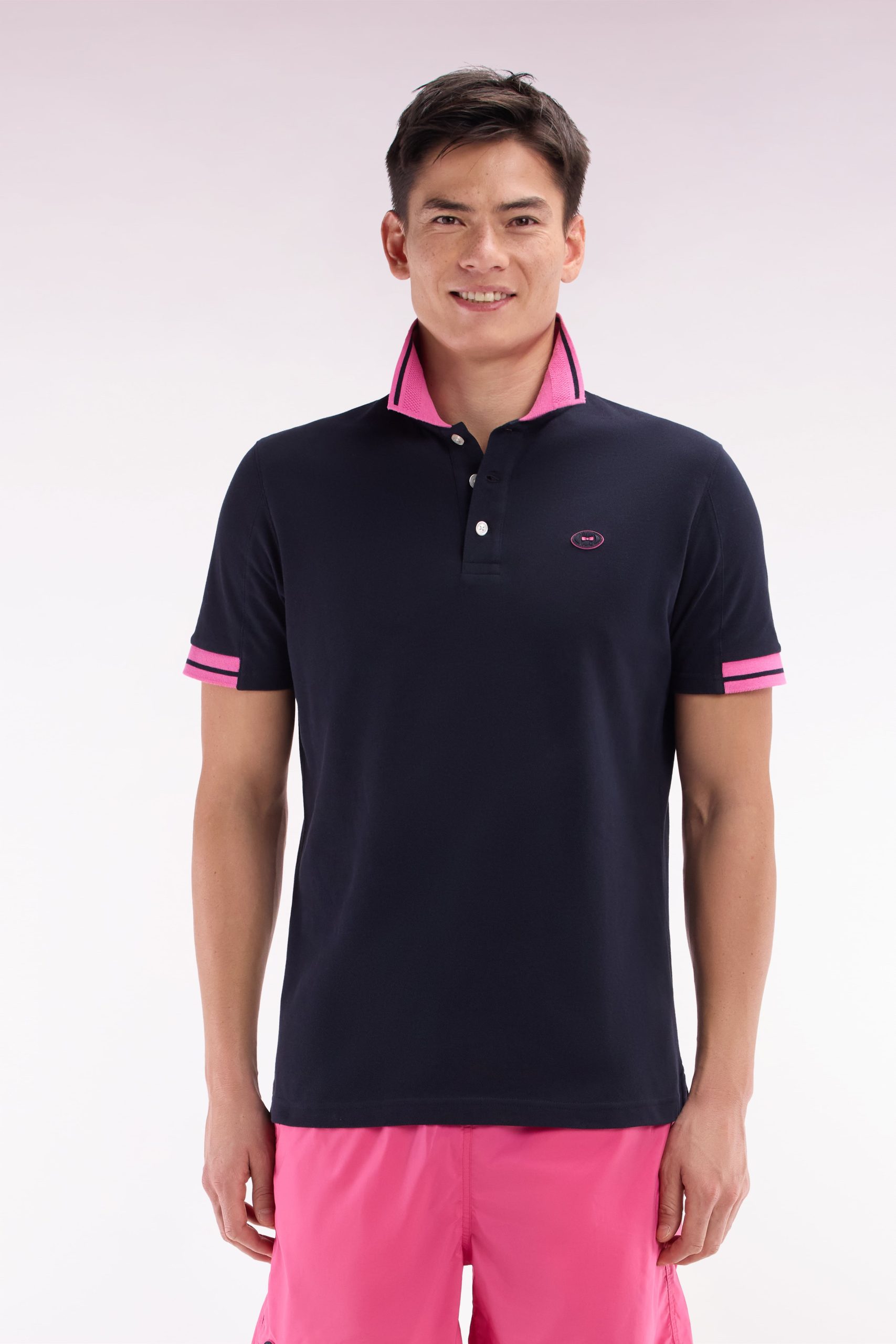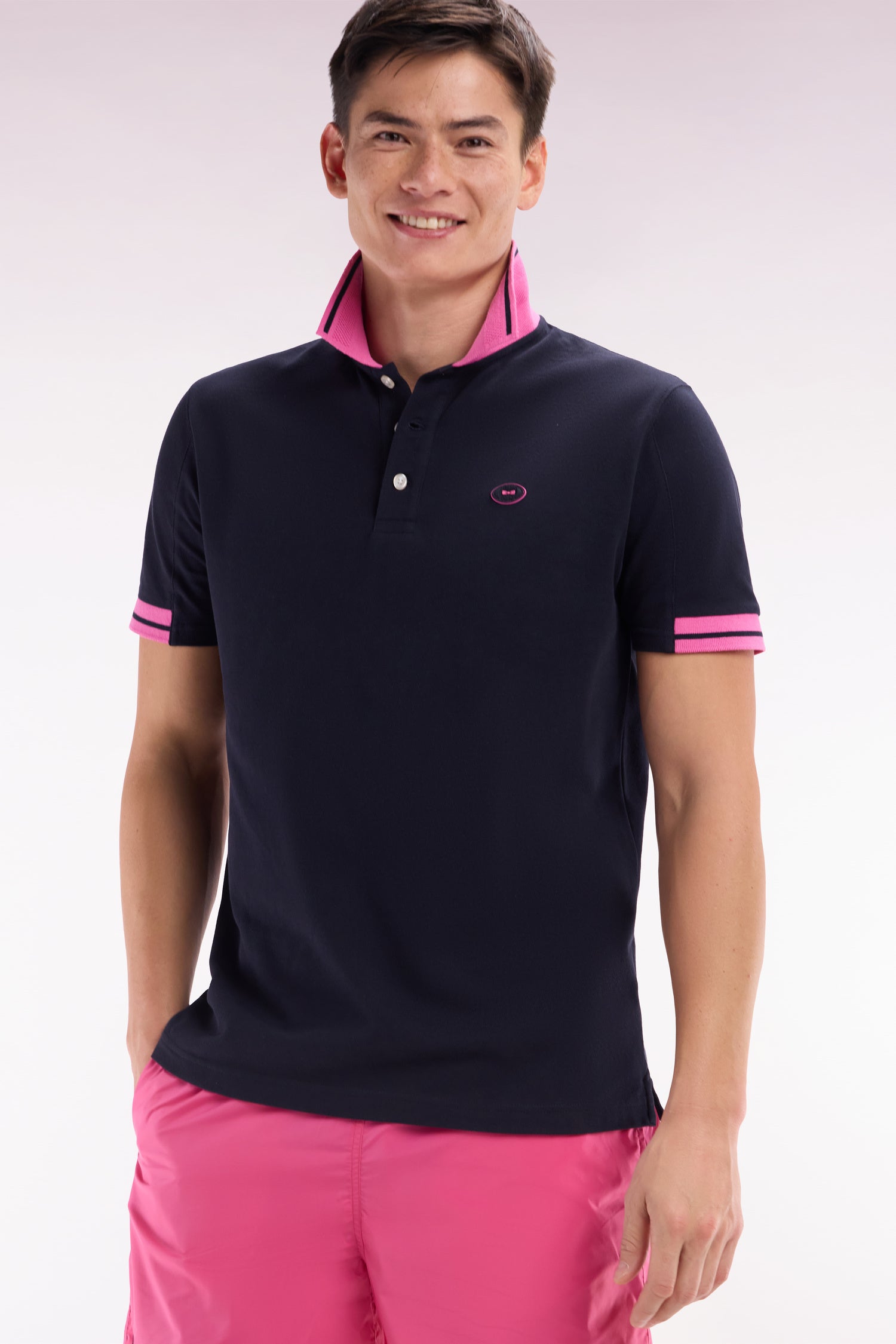 Ce polo en piqué de coton, issu de la collection Beach Rugby, se distingue par son corps uni et ses touches de couleurs sur le col et les bordures des manches. Disponible en bleu, jaune, rose ou rouge, il présente des manches contrastées avec un effet texturé. Des rayures contrastées agrémentent le col et les manches, tandis qu’un badge en silicône en forme de ballon de rugby, assorti d’un nœud papillon coloré, vient compléter cette pièce ludique et estivale.
