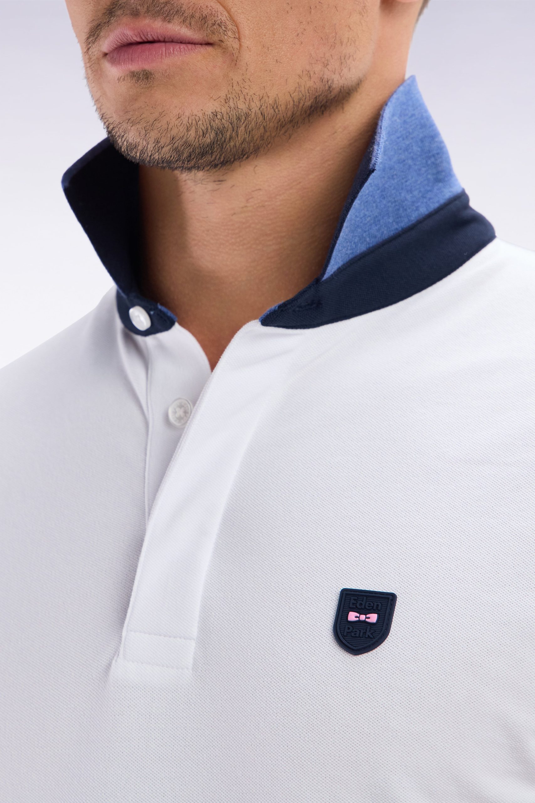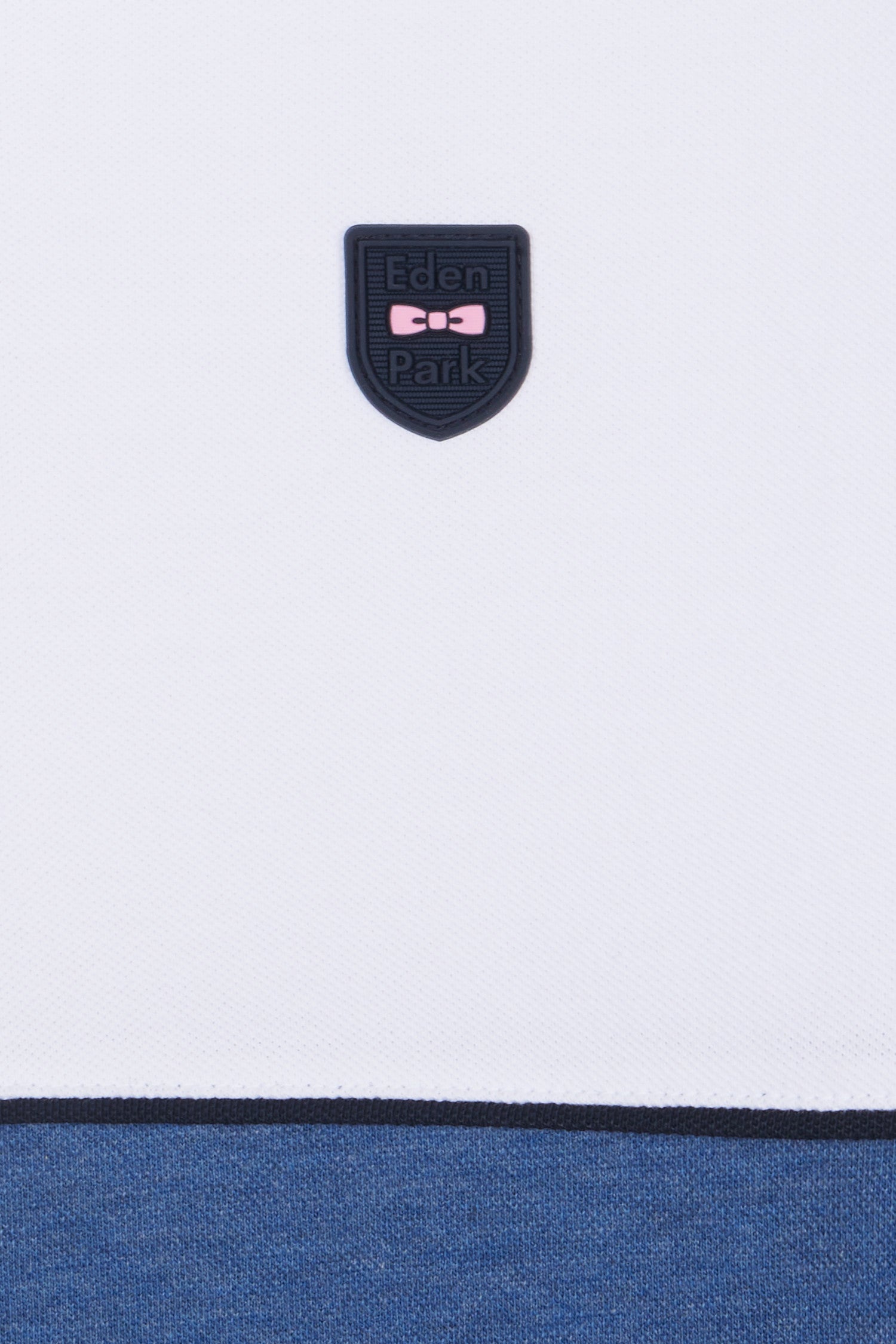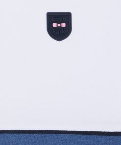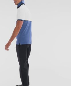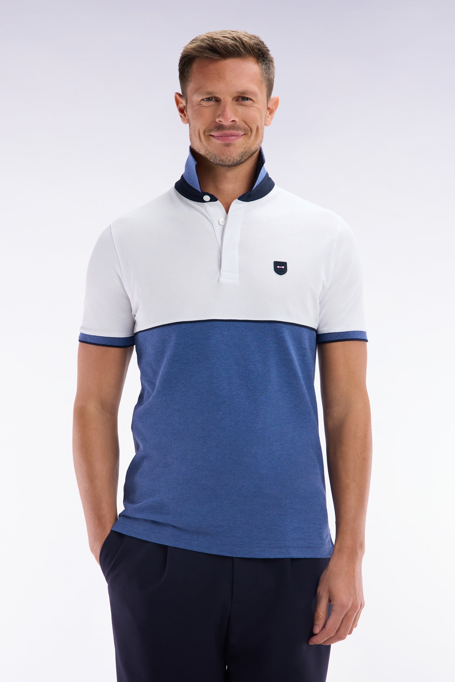 Ce polo à manches courtes en maille piquée stretch, décliné en gris, bleu, beige ou noir, se distingue par ses découpes contrastées façon coupé-cousu. Son col bord-côtes double face avec pied de col contrasté évoque les maillots de rugby. Un passepoil contrasté autour de la poitrine met en valeur le badge silicone figurant notre inimitable nœud papillon en rose. Sa coupe slim ajustée en fait une pièce chic et sportive.