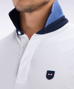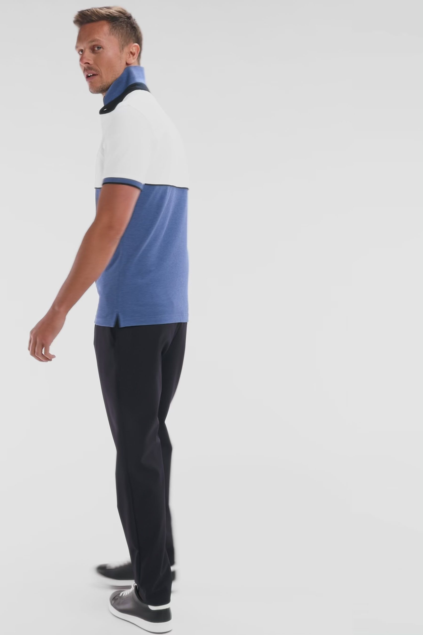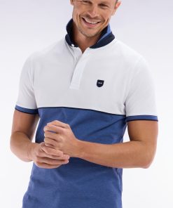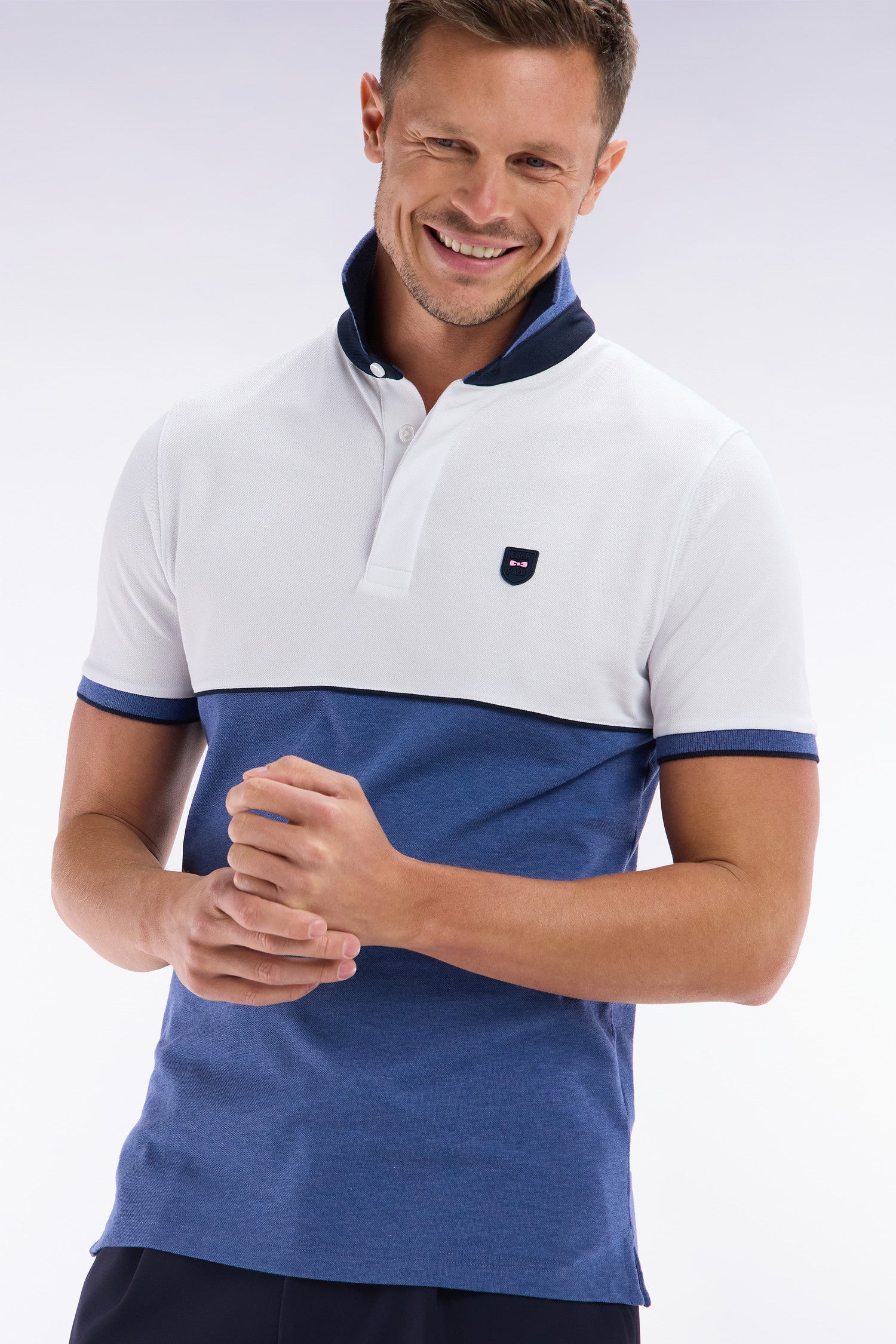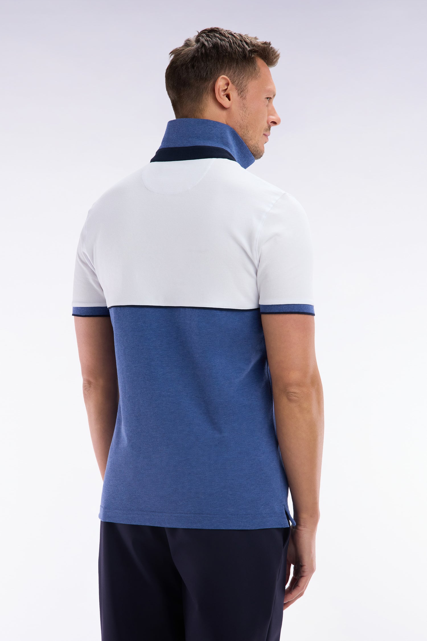 Ce polo à manches courtes en maille piquée stretch, décliné en gris, bleu, beige ou noir, se distingue par ses découpes contrastées façon coupé-cousu. Son col bord-côtes double face avec pied de col contrasté évoque les maillots de rugby. Un passepoil contrasté autour de la poitrine met en valeur le badge silicone figurant notre inimitable nœud papillon en rose. Sa coupe slim ajustée en fait une pièce chic et sportive.