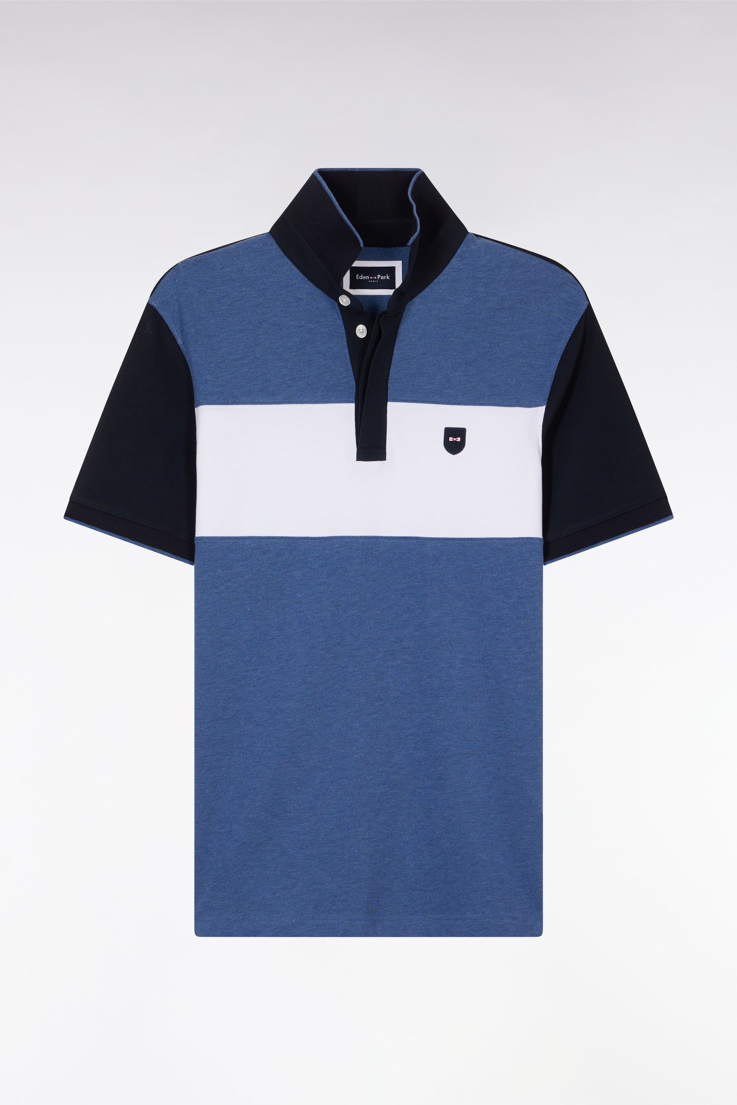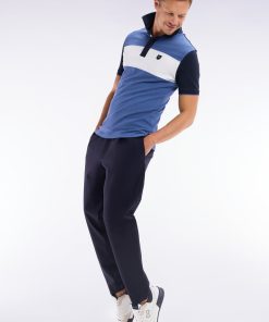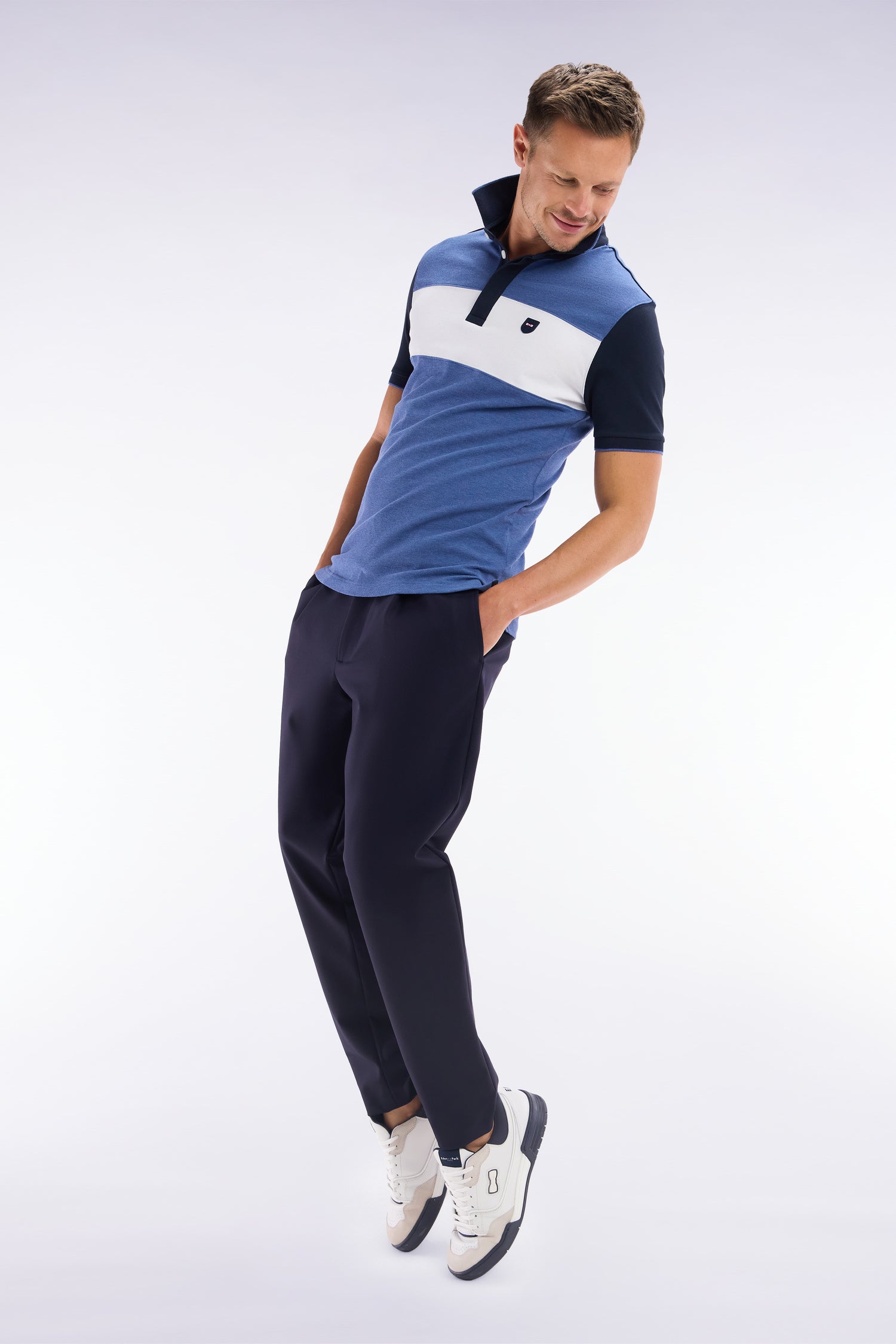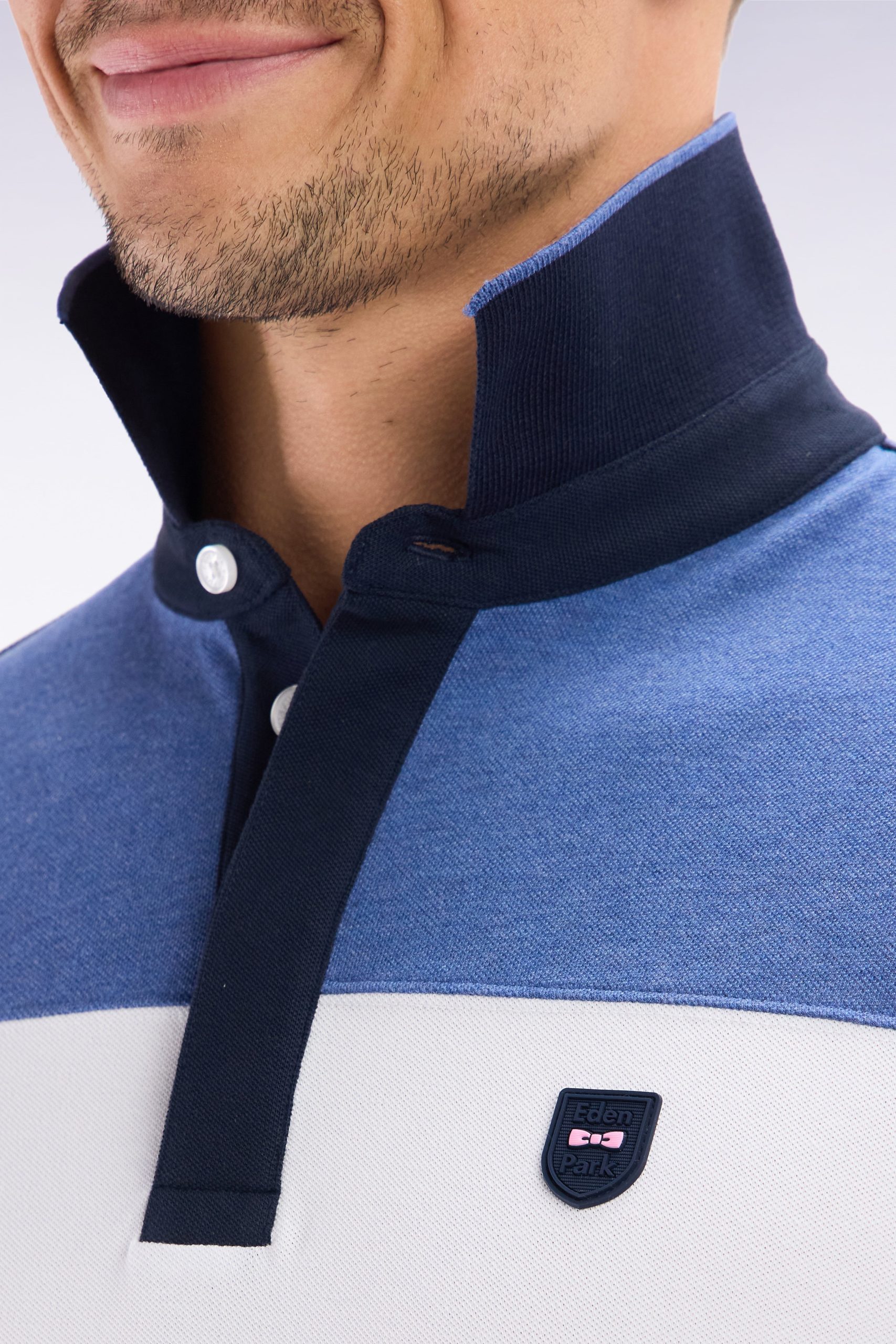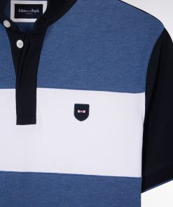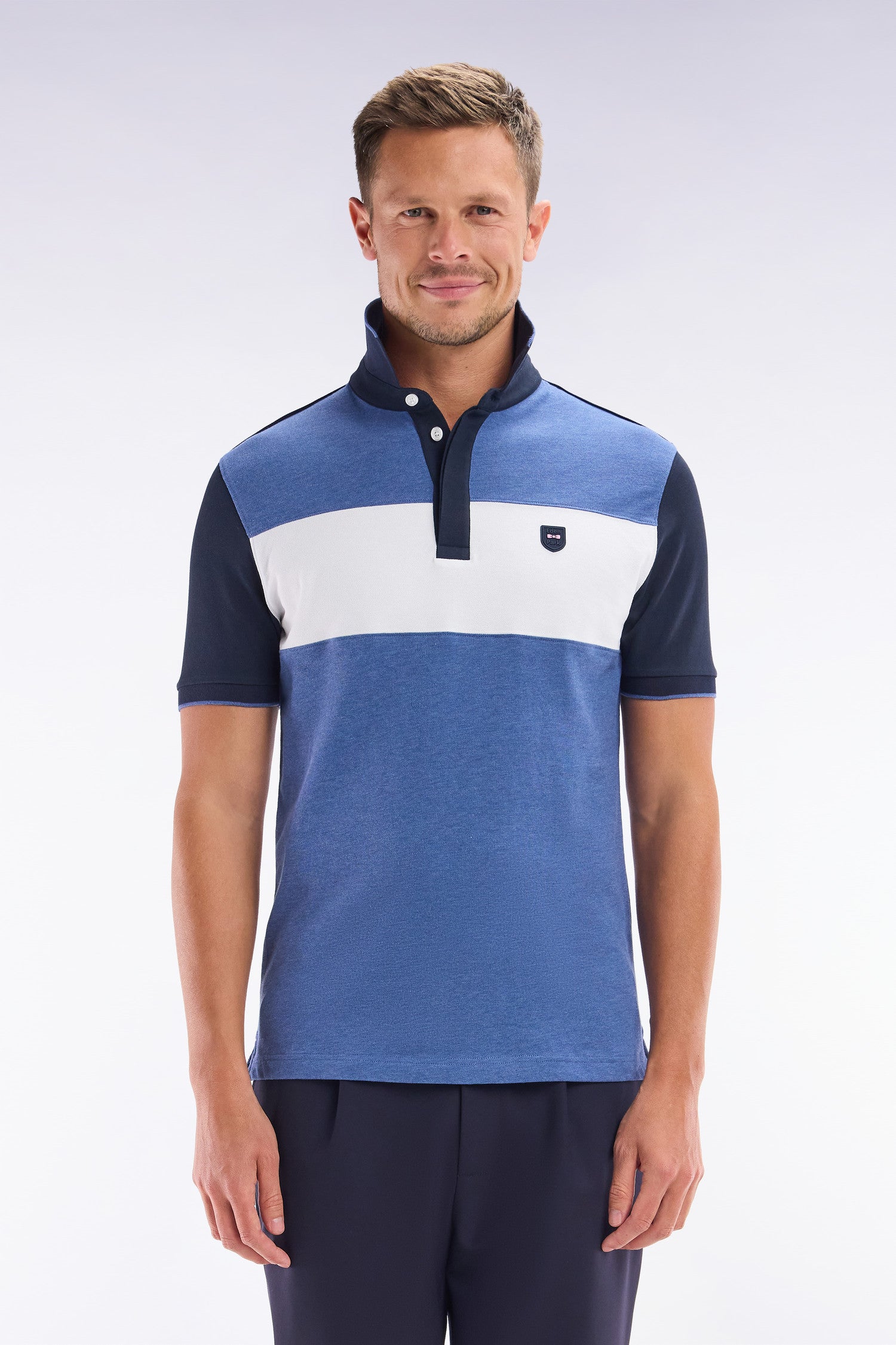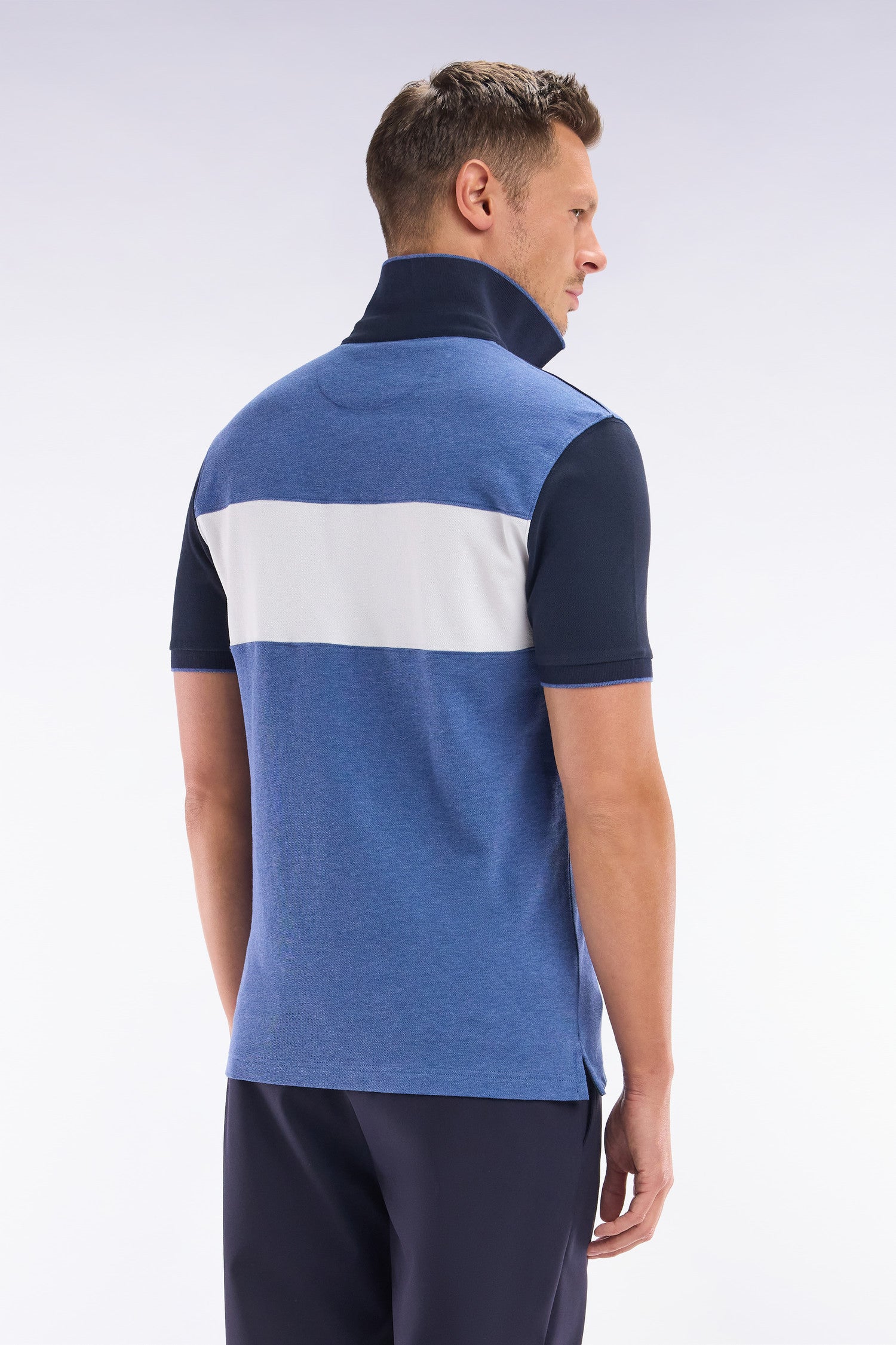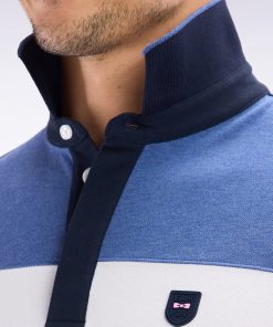 Ce polo masculin en maille de coton piqué stretch présente une large bande contrastée horizontale au milieu de la poitrine, mettant en valeur l’écusson poitrine en gomme. Le col bord-côtes monté sur pied de col et sa coupe slim plus ajustée font de ce polo homme une pièce chic et sportive, idéale pour un style affirmé porté avec un chino ou un jean.