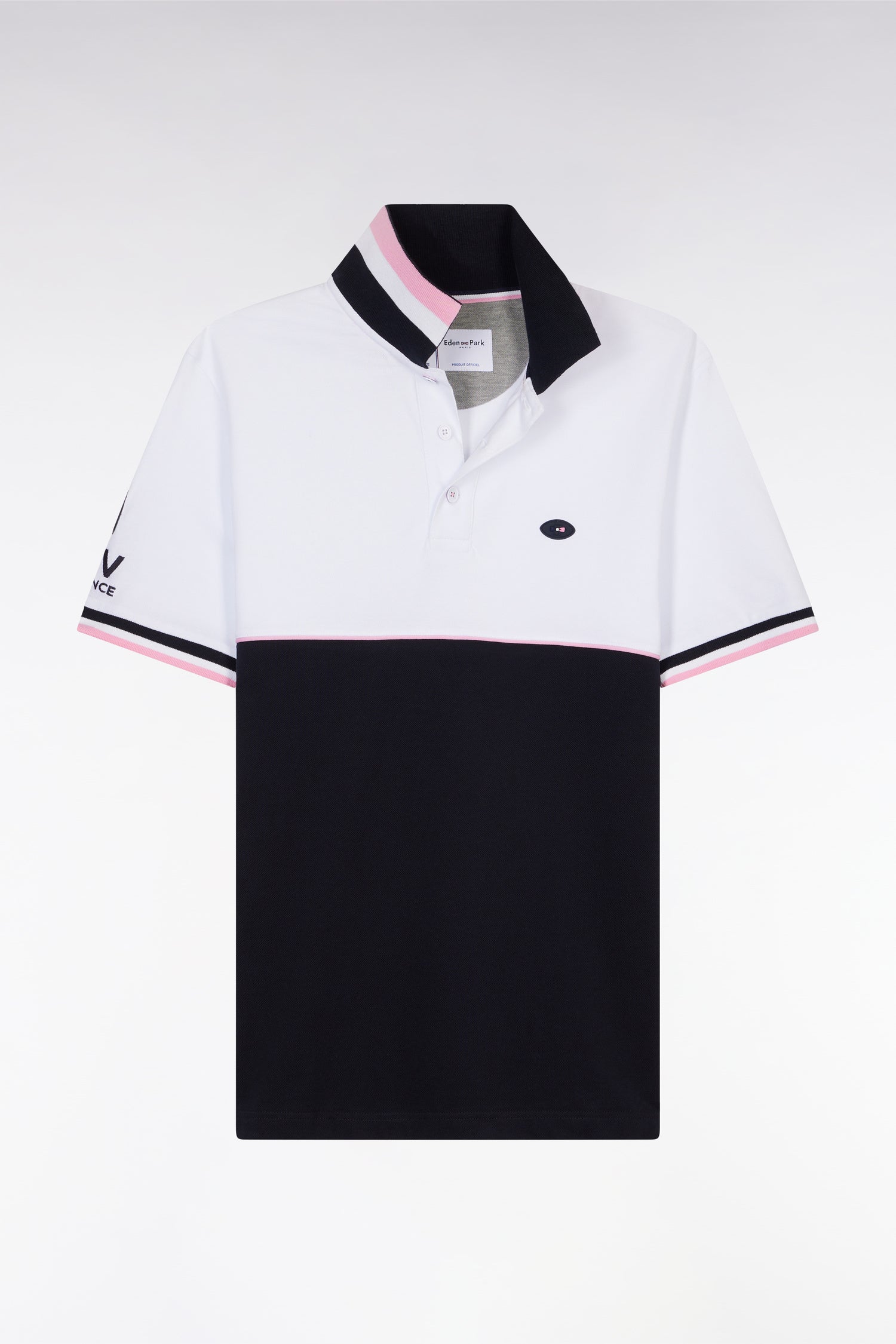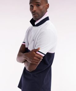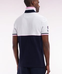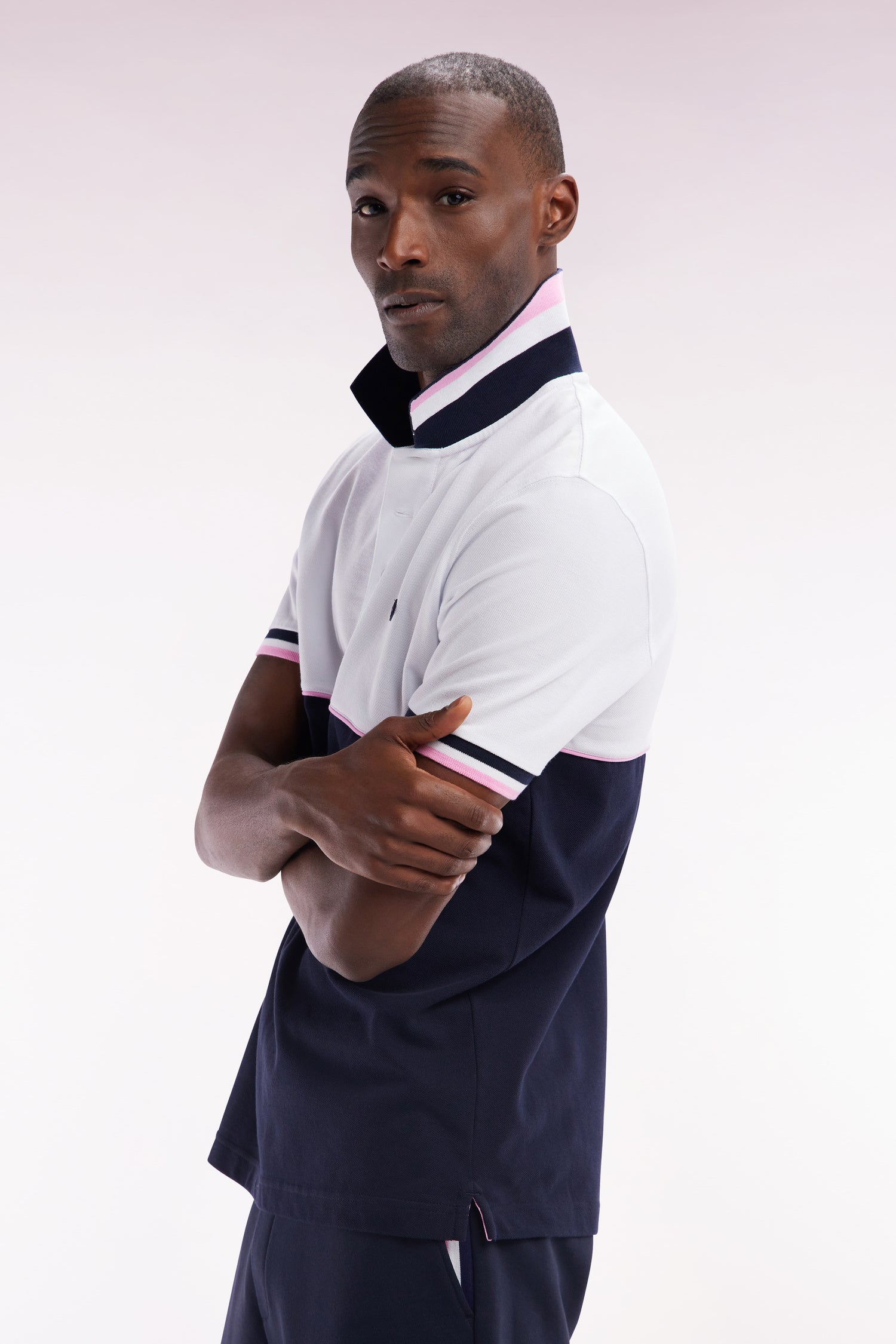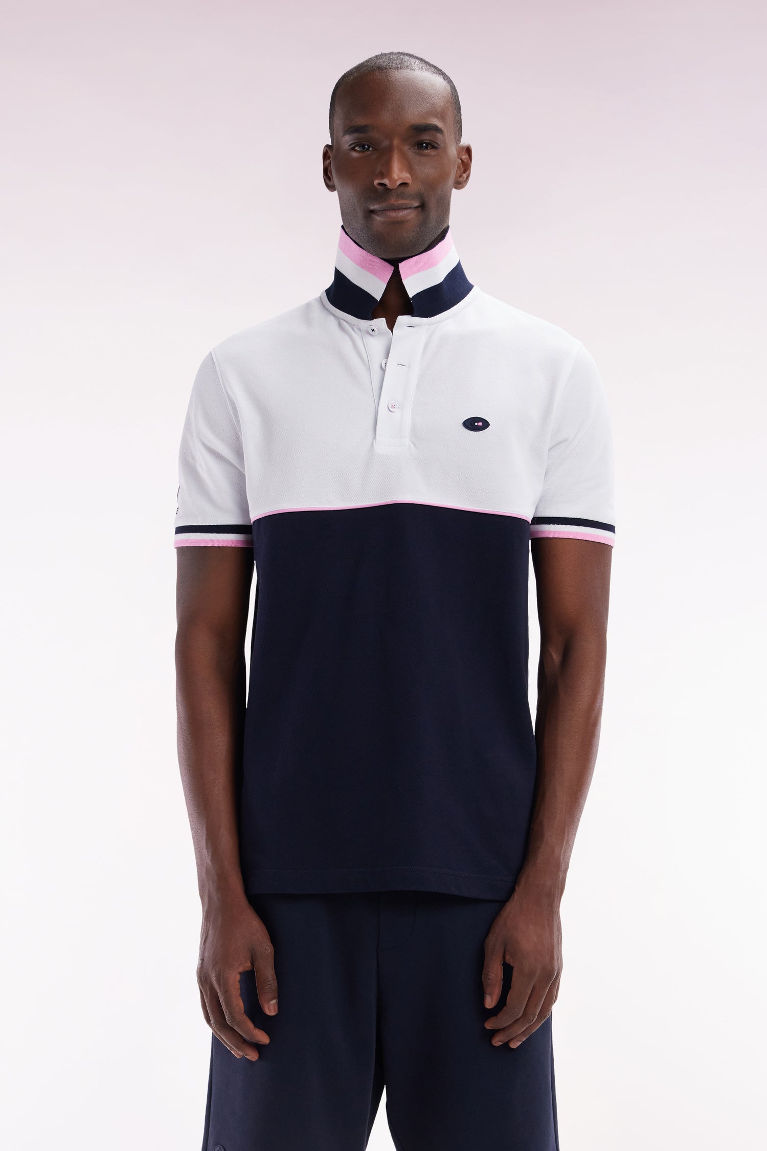 Idéal pour le printemps-été, ce polo bicolore par son design distinctif. La partie inférieure en bleu marine contraste élégamment avec la partie supérieure en blanc. Les bordures en bord-côtes et le dessous de col tricolores bleu-blanc-rose apportent une touche sophistiquée. Des broderies sur la manche ajoutent du caractère à ce modèle, idéal pour une allure décontractée mais soignée en toutes occasions.