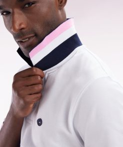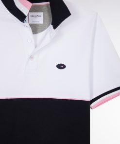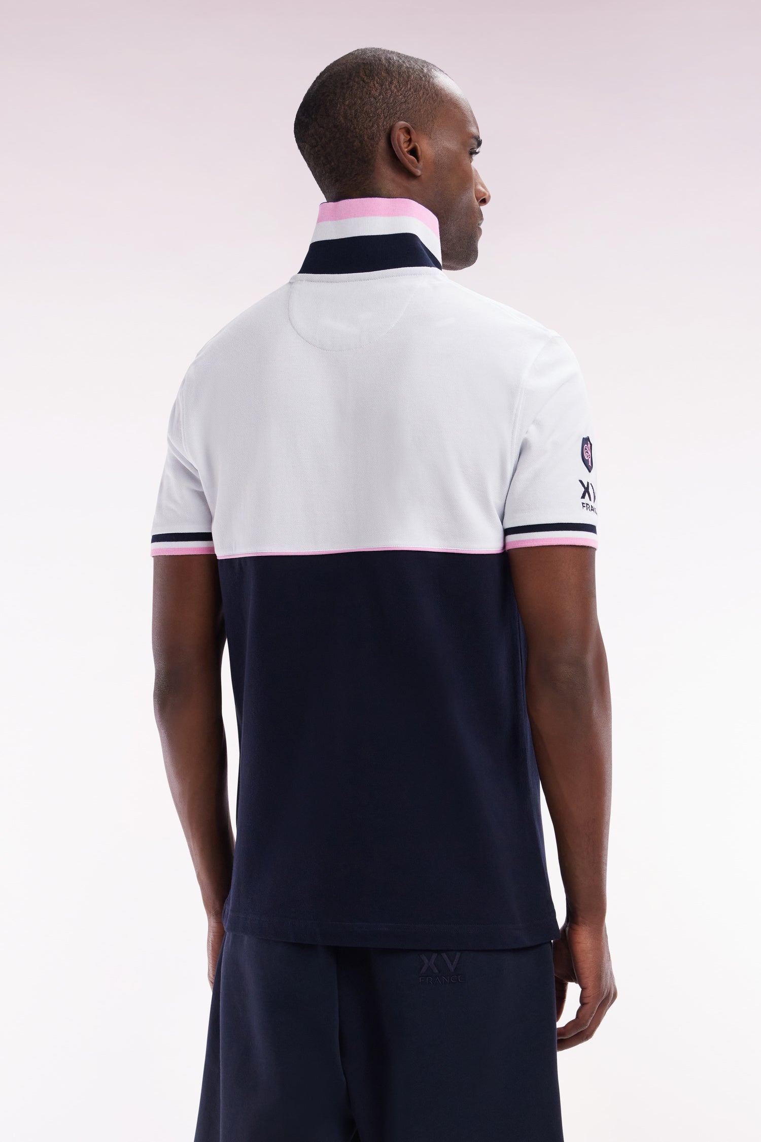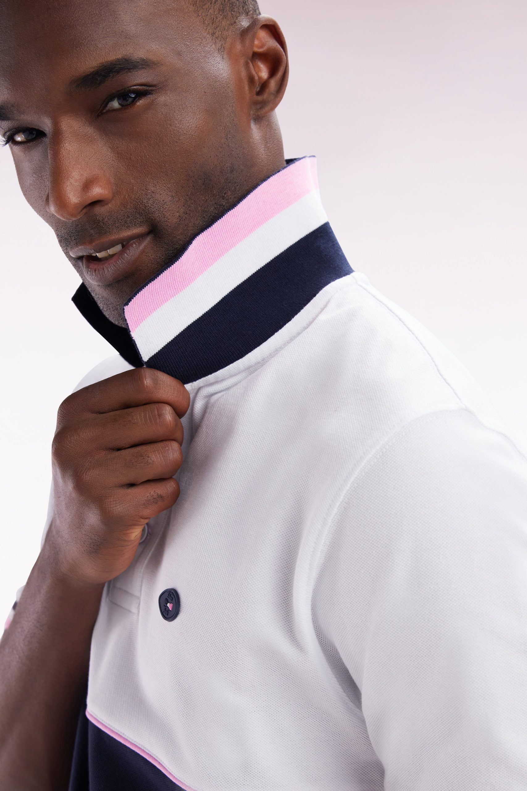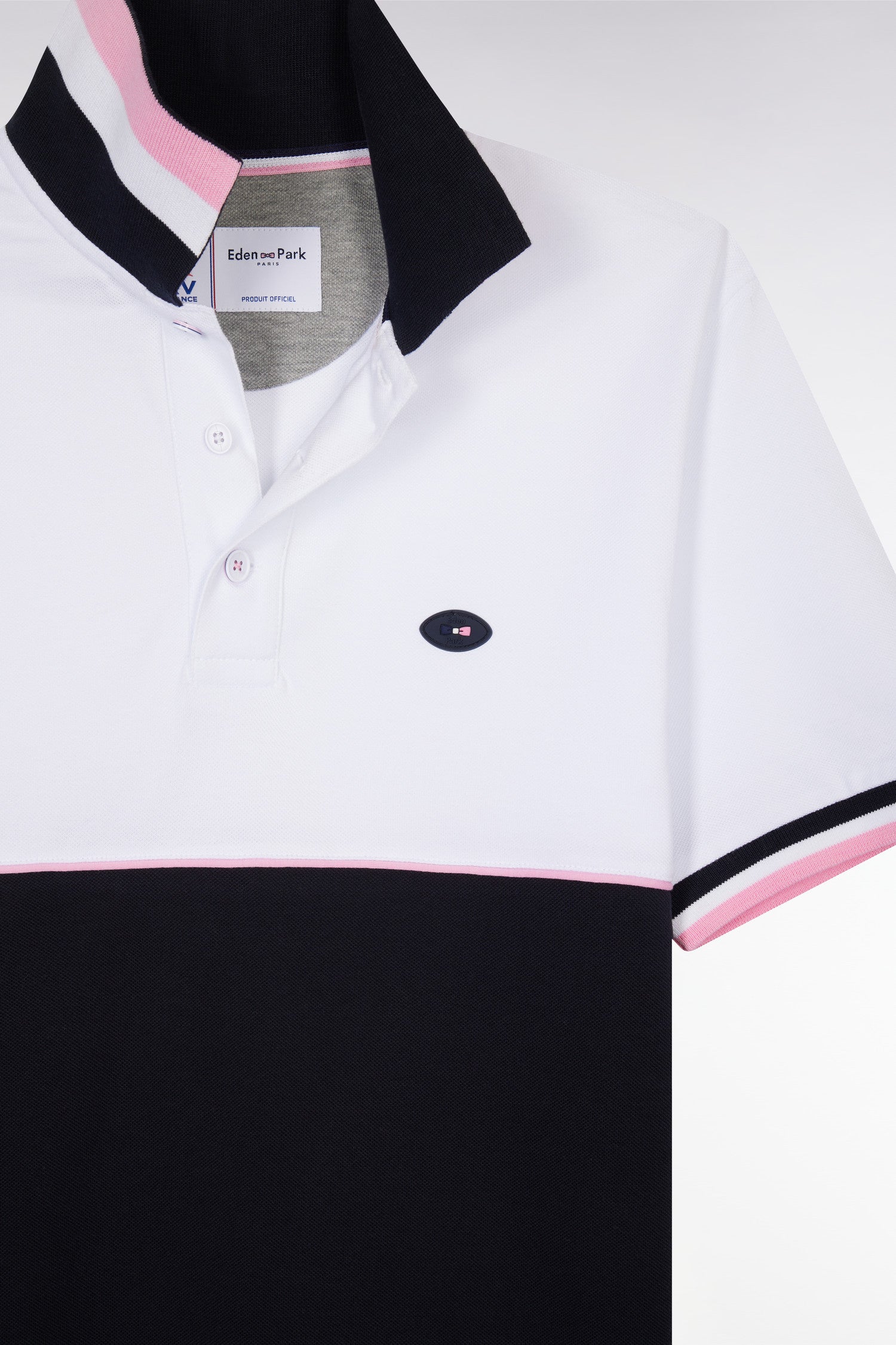 Idéal pour le printemps-été, ce polo bicolore par son design distinctif. La partie inférieure en bleu marine contraste élégamment avec la partie supérieure en blanc. Les bordures en bord-côtes et le dessous de col tricolores bleu-blanc-rose apportent une touche sophistiquée. Des broderies sur la manche ajoutent du caractère à ce modèle, idéal pour une allure décontractée mais soignée en toutes occasions.