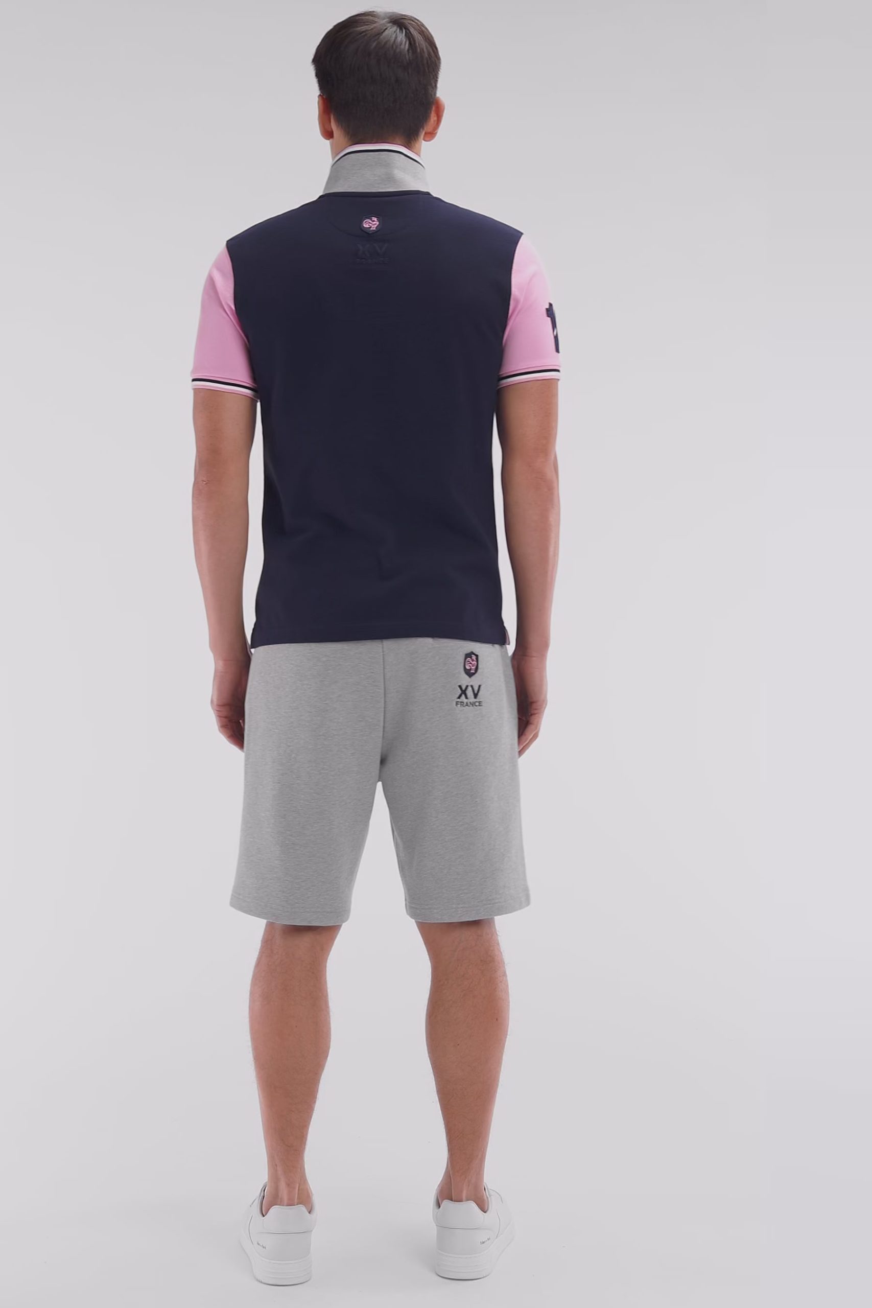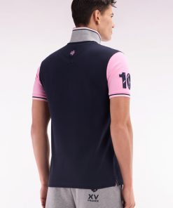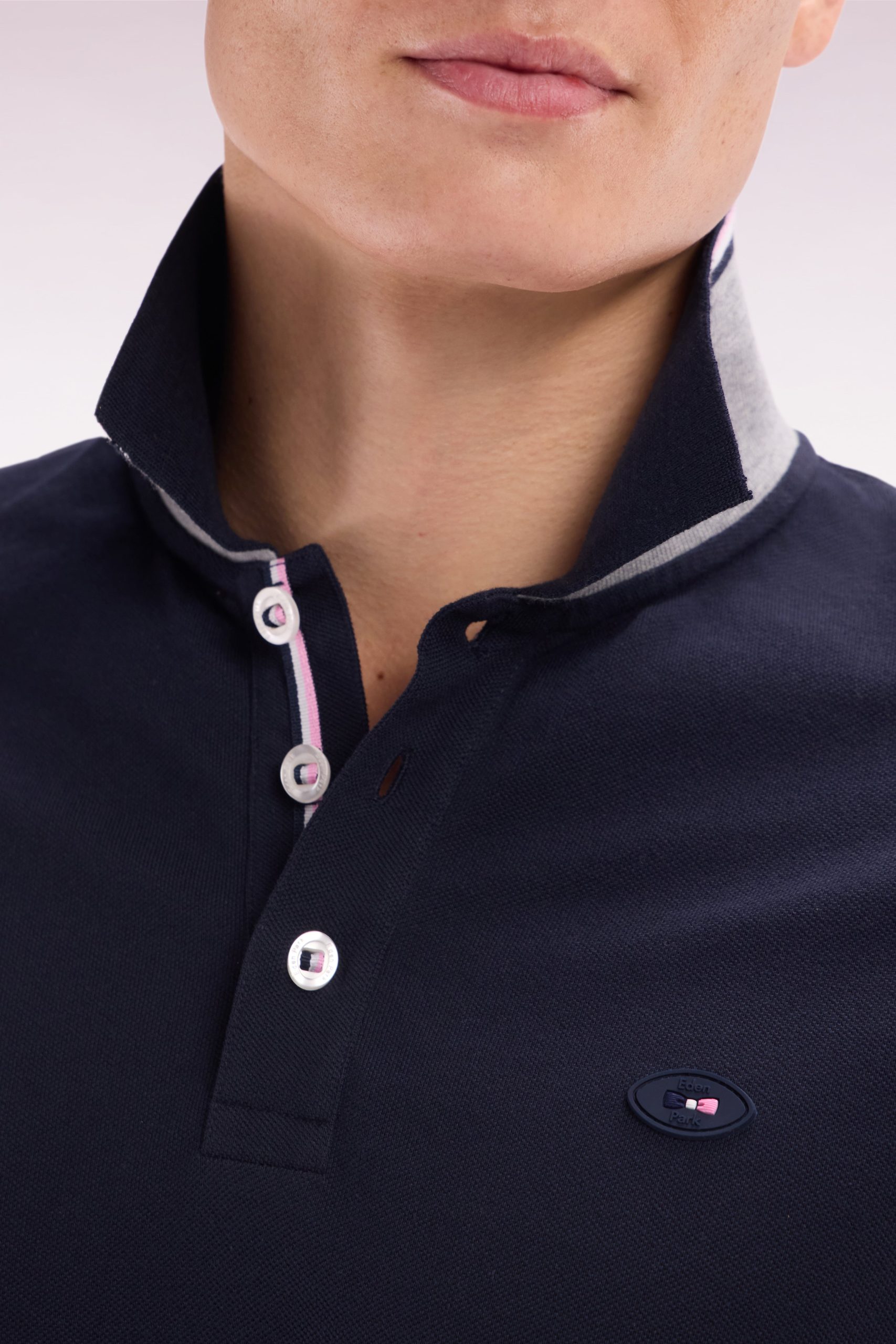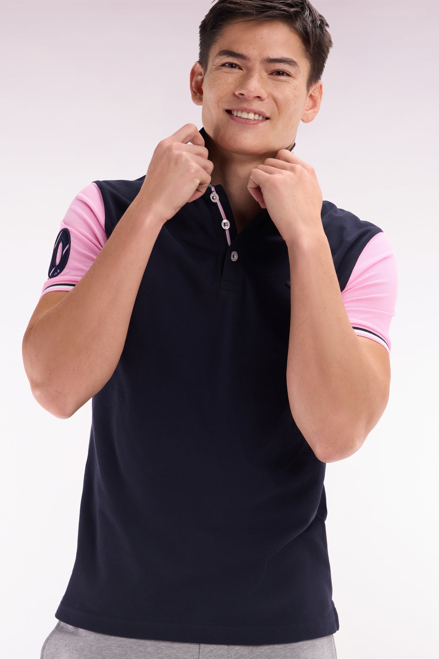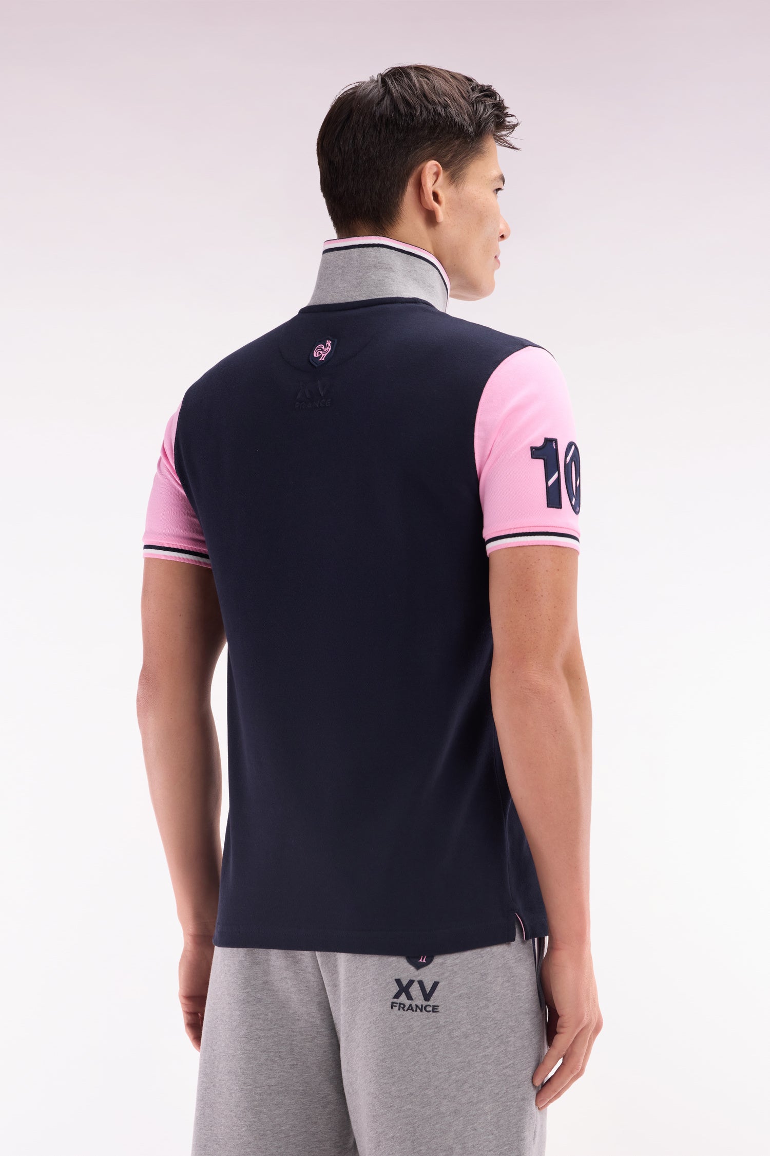 Notre polo en piqué coton pour homme décliné dans deux versions bleu marine et rose, joue sur l’harmonie des couleurs. Sa broderie numéro 10 sur la manche, contrastée ou ton sur ton selon le modèle, apporte une touche sportive discrète. Le col polo, avec un dessous gris, et les bordures de manches en bords-côtes rayée rehaussent son allure sport-chic .