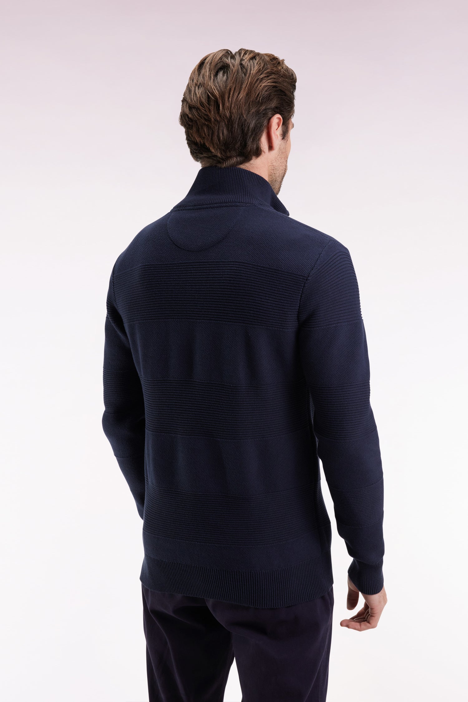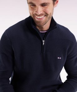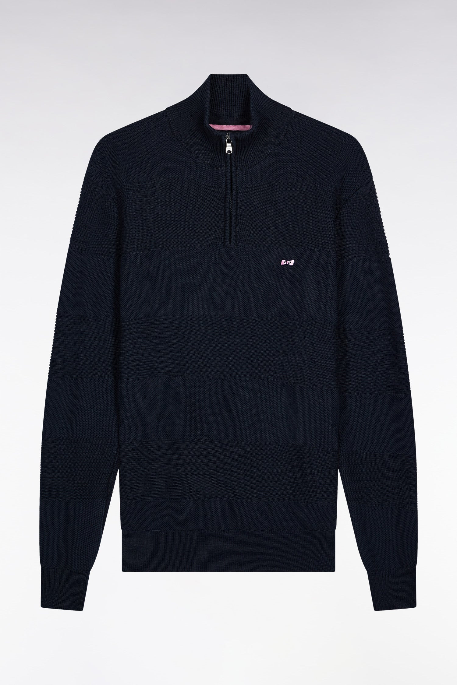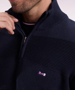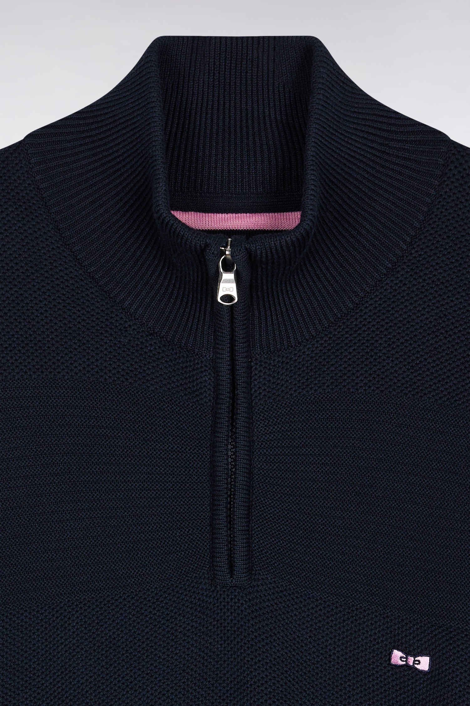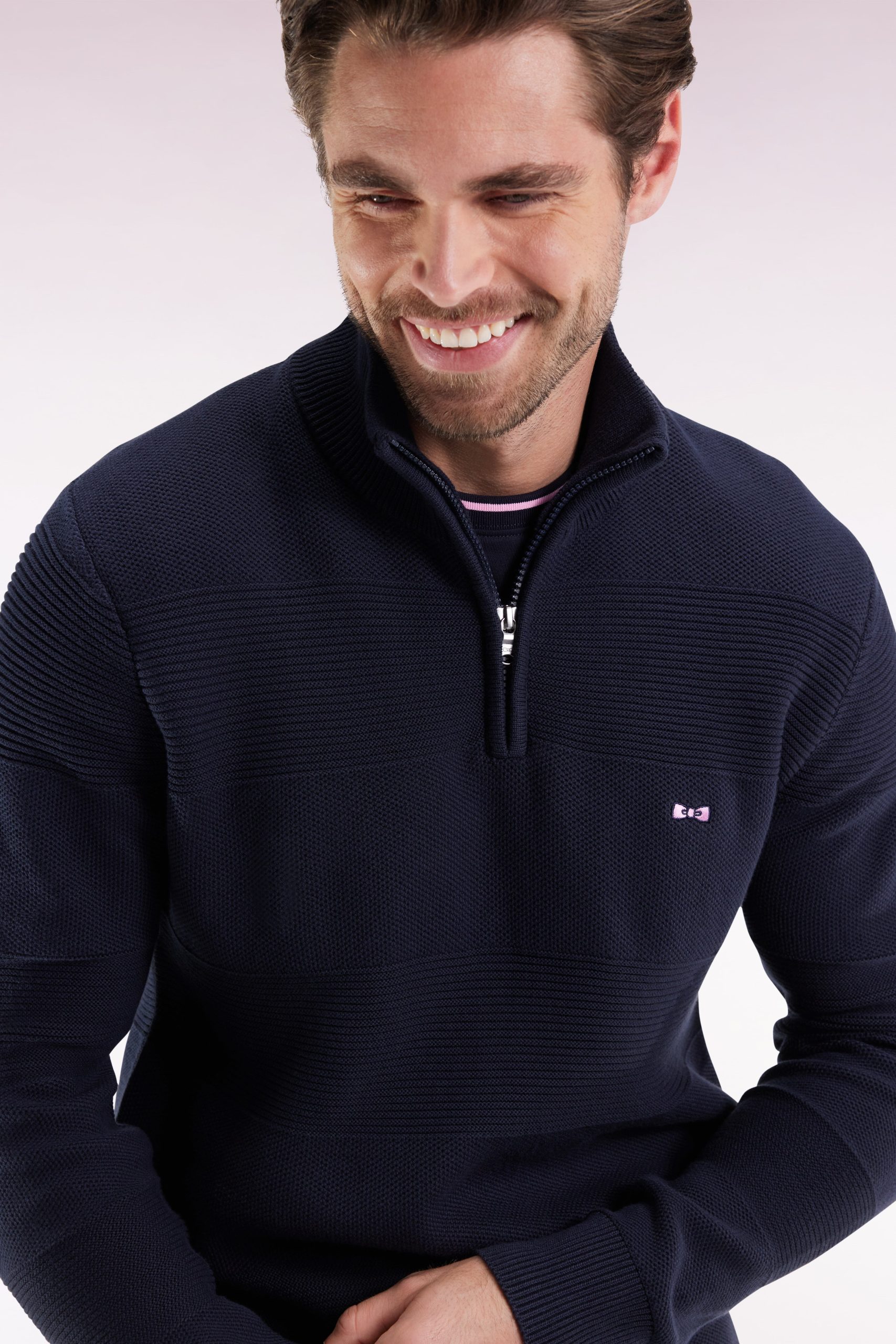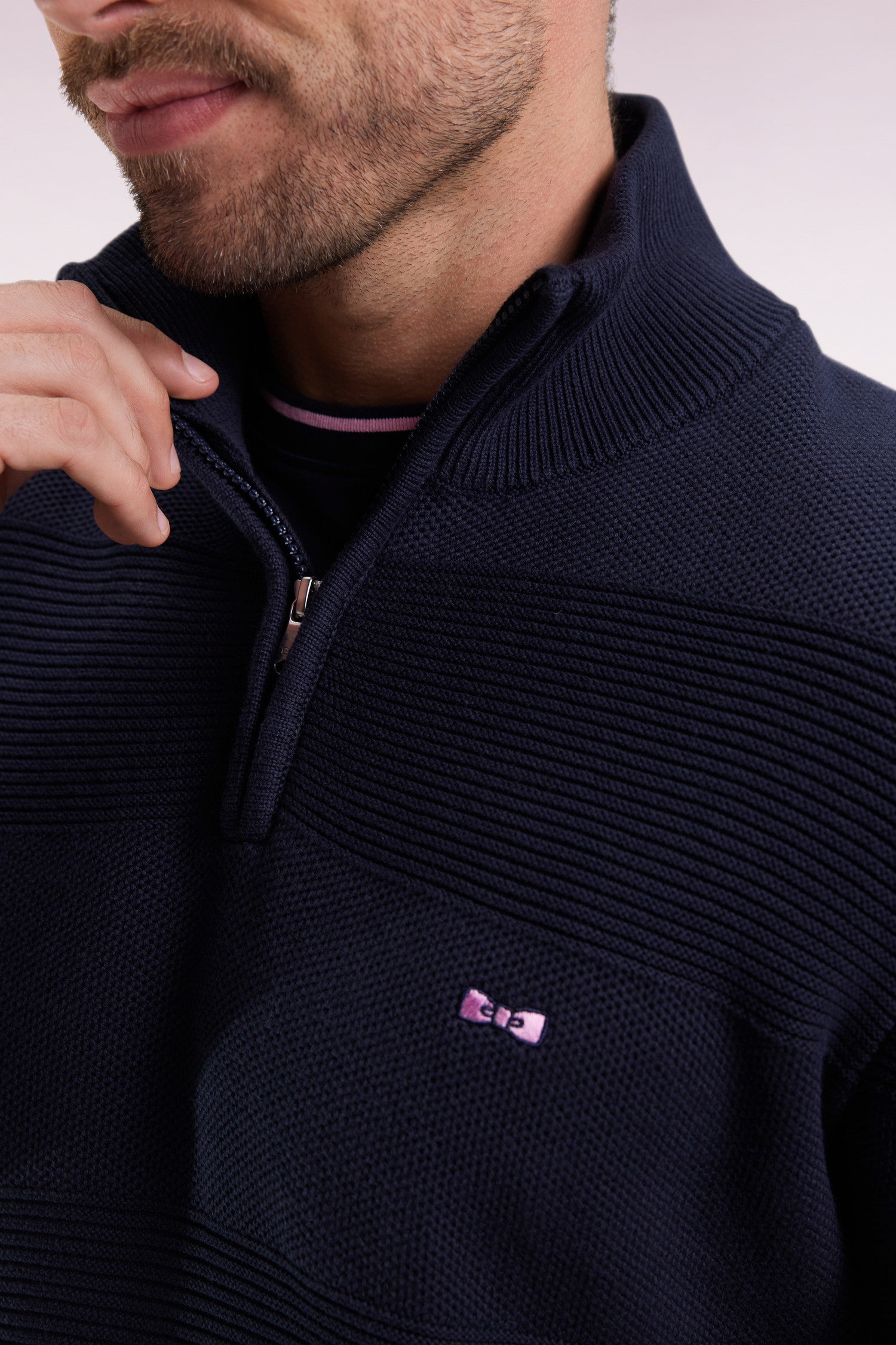 Fier de son héritage sportif, ce pull à camionneur zippé réalisé en pur coton présente un tricotage double tout en vous garantissant une sensation de confort durable. Son jeu de textures permet de recréer, en ton sur ton, les rayures emblématiques des maillots de rugby. Sa coupe droite confortable, son col montant zippé et sa broderie nœud papillon rose sur la poitrine signent cette pièce à la fois graphique et intemporelle, parfaite pour conjuguer style et décontraction au quotidien. Ce modèle devenu un classique du vestiaire masculin Eden Park est proposé dans 4 teintes intemporelles