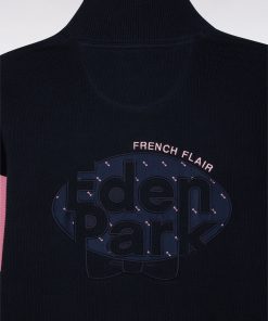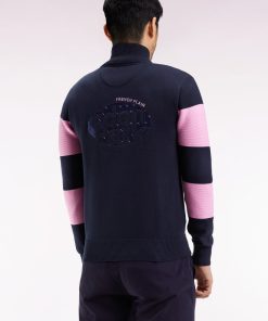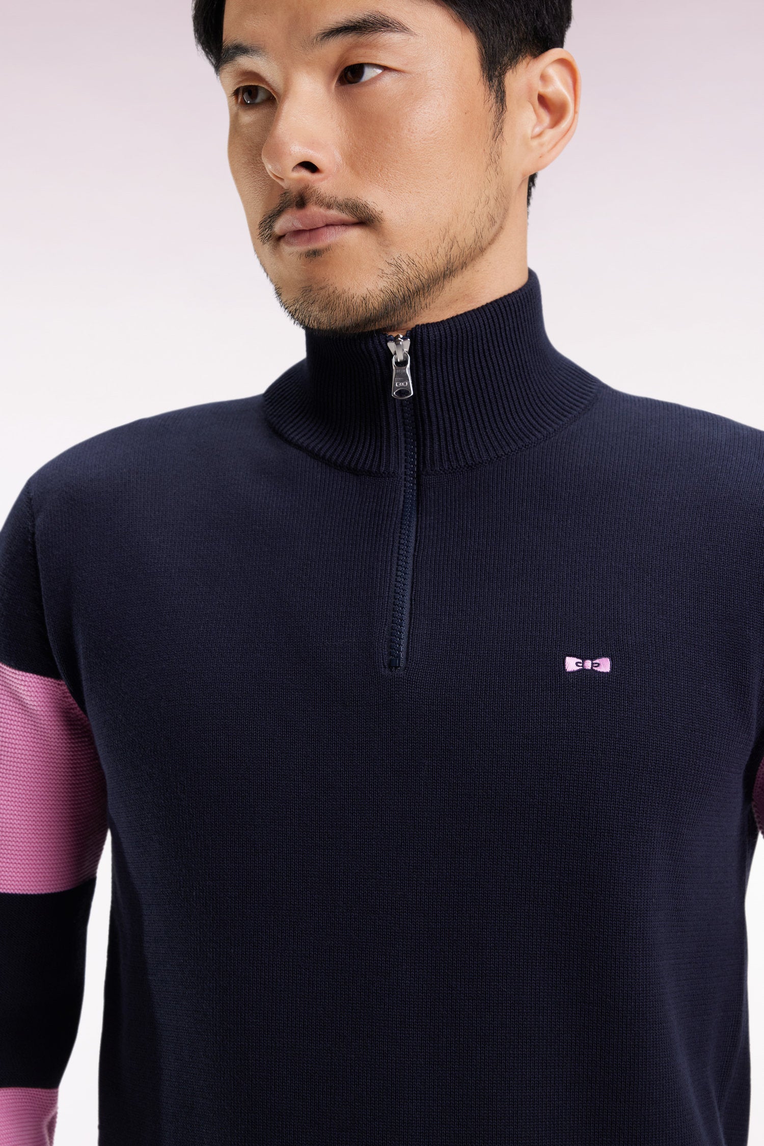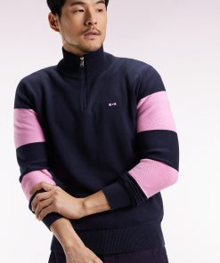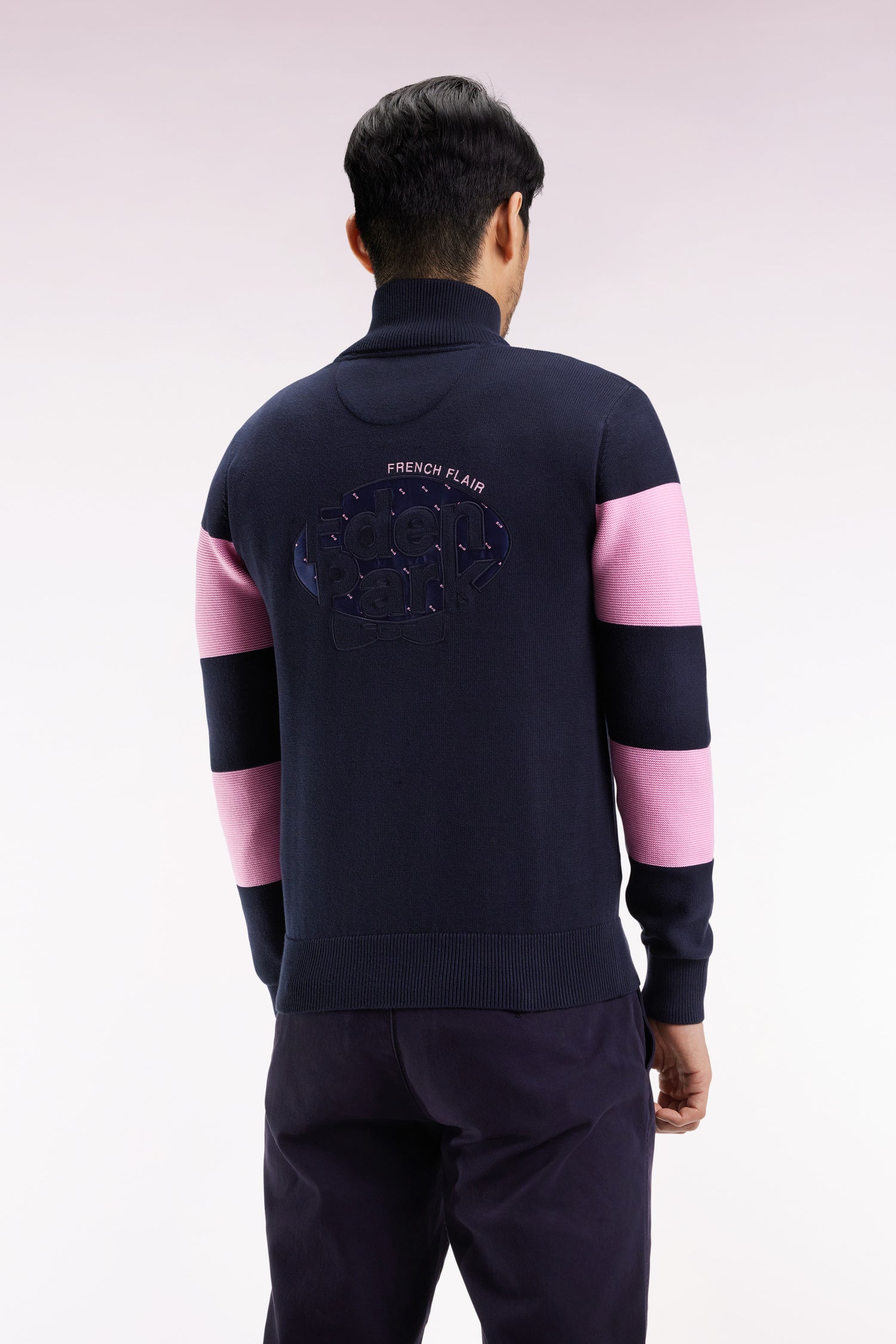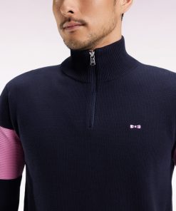 Inspiré des maillots de rugby historiques dit “cerclés”, ce pull col montant semi-zippé revisite la rayure rugby par ses jeux de contrastes tricotés sur les manches rose ou ciel selon le modèle choisi. Réalisé en 100% coton, ce pull mise sur un intérieur de col contrasté et une large broderie dans le dos pour affirmer son caractère sport-chic. Une pièce forte, pensée pour conjuguer héritage et modernité sans jamais sacrifier le style ou le confort. Un ajout précieux au vestiaire masculin pour cet hiver comme les suivants