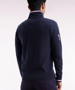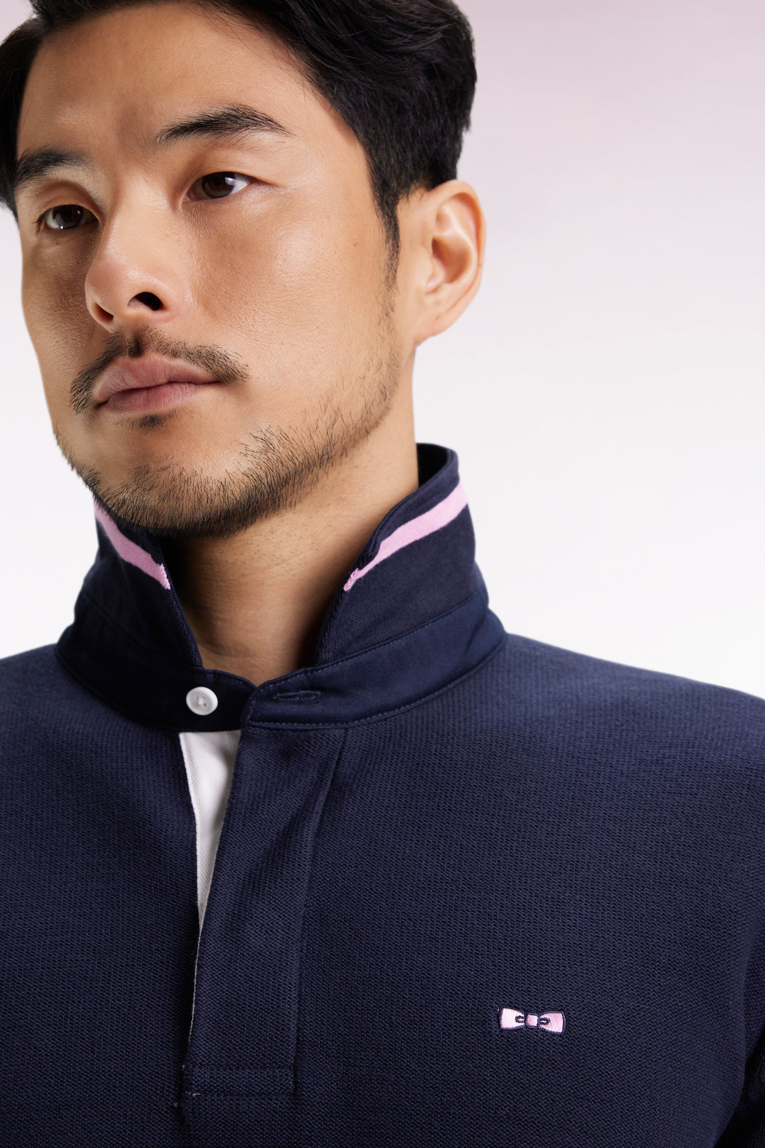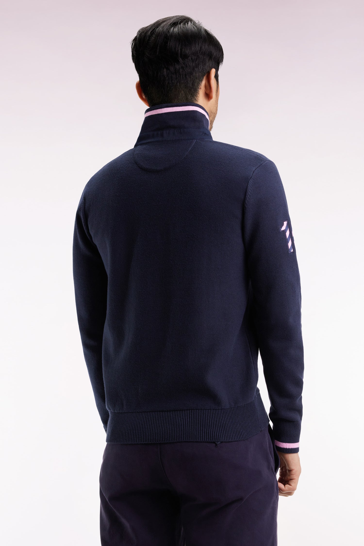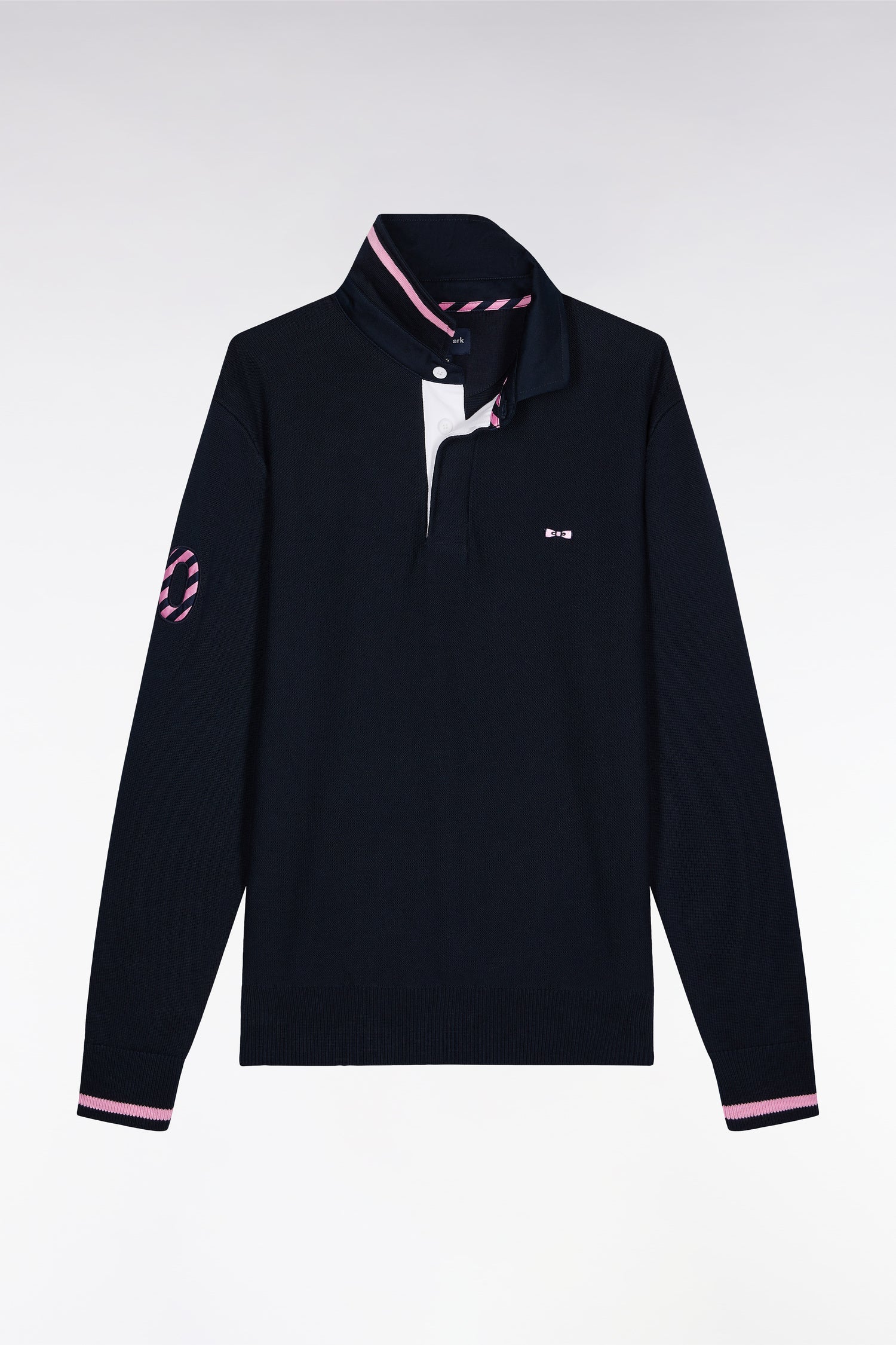 Hommage assumé à l’univers rugby, ce pull à col maillot joue sur les codes sport-chic chers à Eden Park. Dessous de col tricoté souligné d’un liseré, construction soignée avec bande de propreté en tissu cravate, rappel de sa broderie 10 sur la manche : chaque détail reflète le savoir-faire de la maison et l’amour porté au rugby. Ce pull présente une alternance de points de tricotage sur le corps et les manches pour une silhouette graphique et dynamique