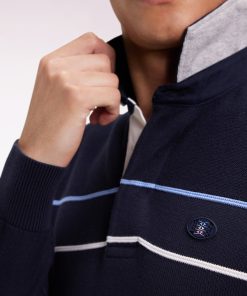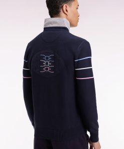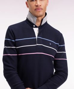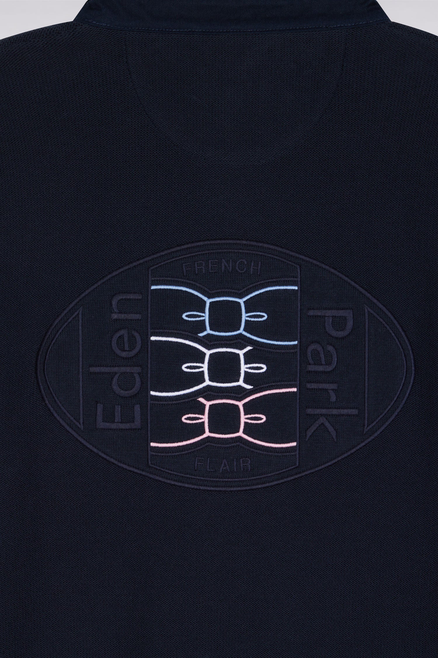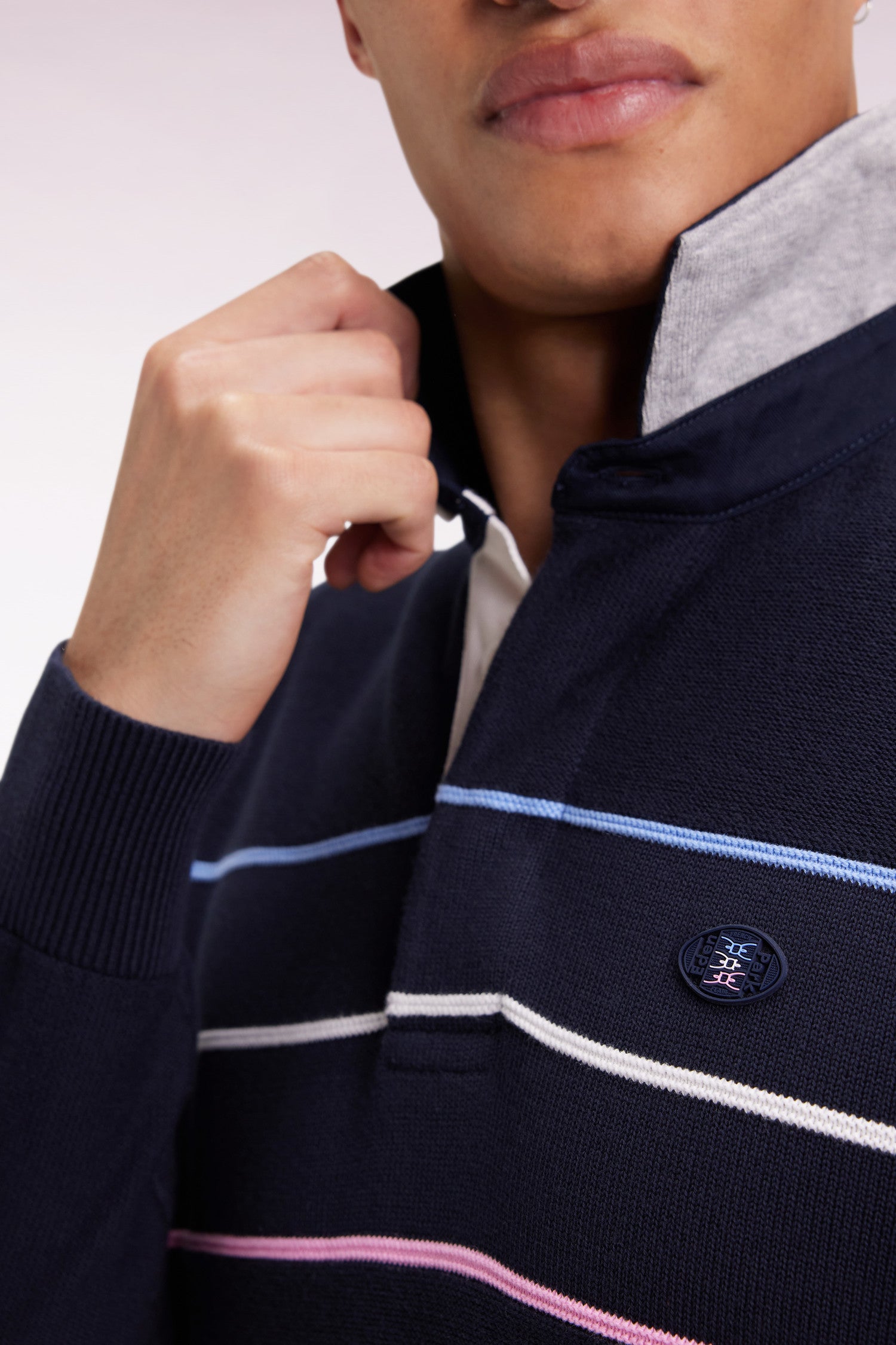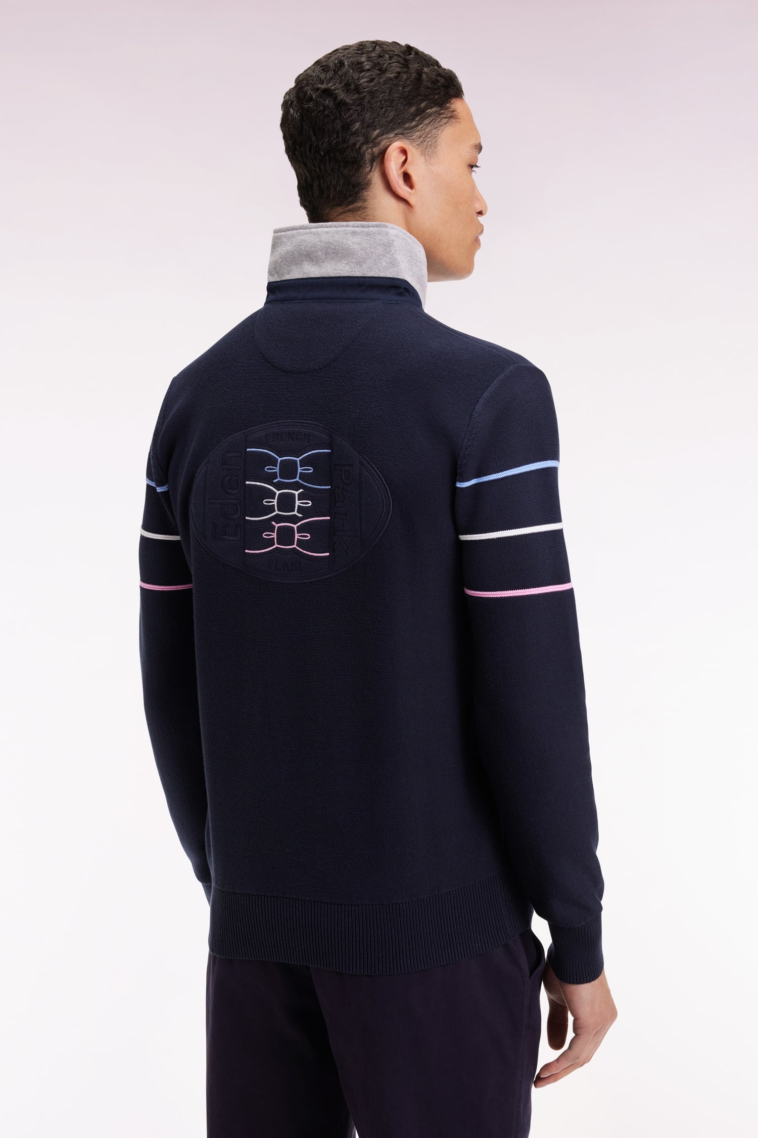 Inspiré du vestiaire rugby, ce pull pour homme à col maillot réalisé en coton mise sur une construction soignée et des détails graphiques. Son dessous de col est tricoté en contraste, un détail visible porté ouvert. Son col dispose également d’une structure en twill pour un tombé impeccable. Son liseré tricolore raccordé entre la poitrine et les manches, son badge feutre et silicone sur la poitrine et sa large broderie ovale dans le dos signent cette pièce forte, à l’esprit sport-chic assumé