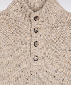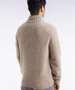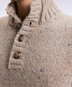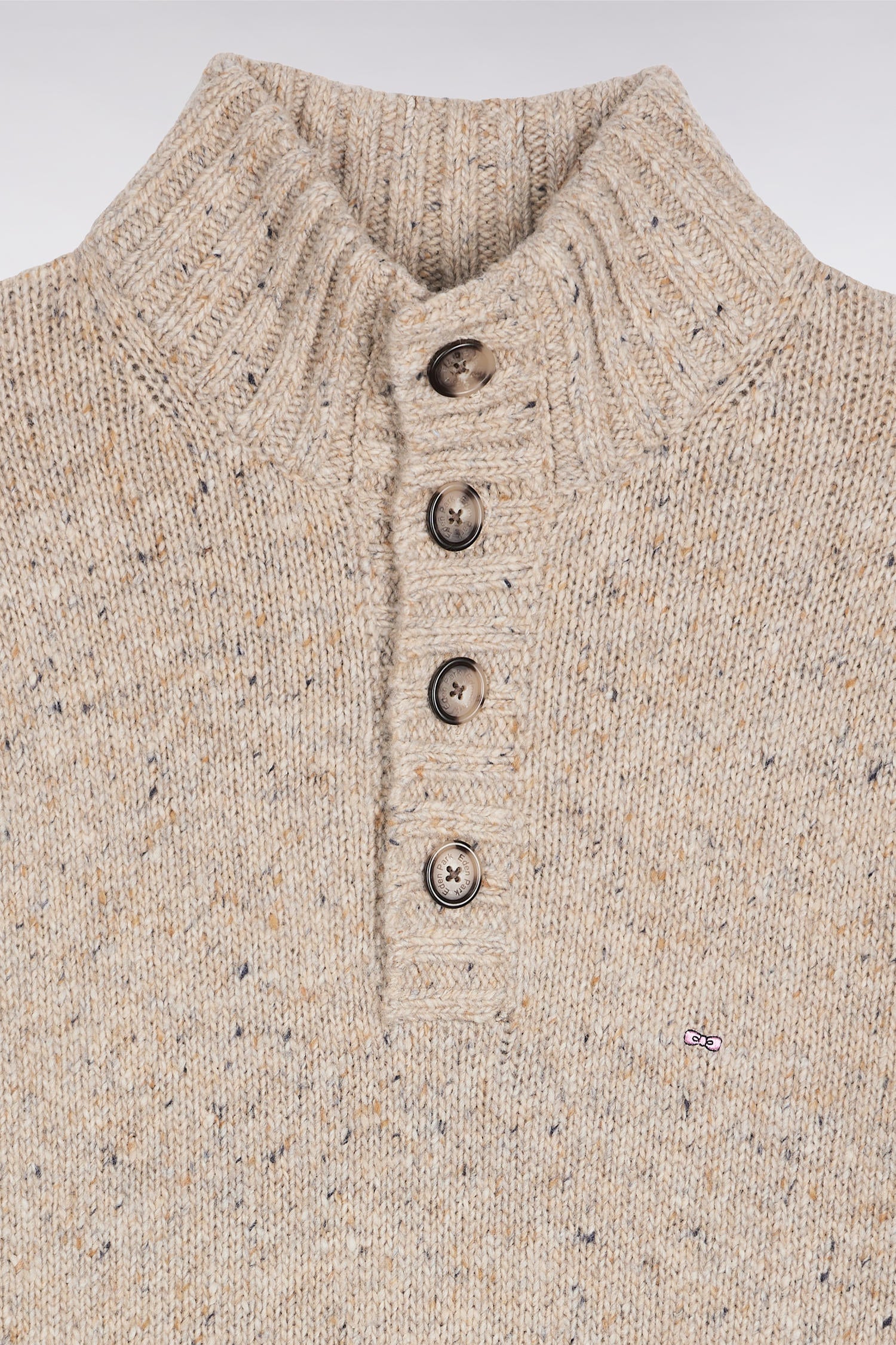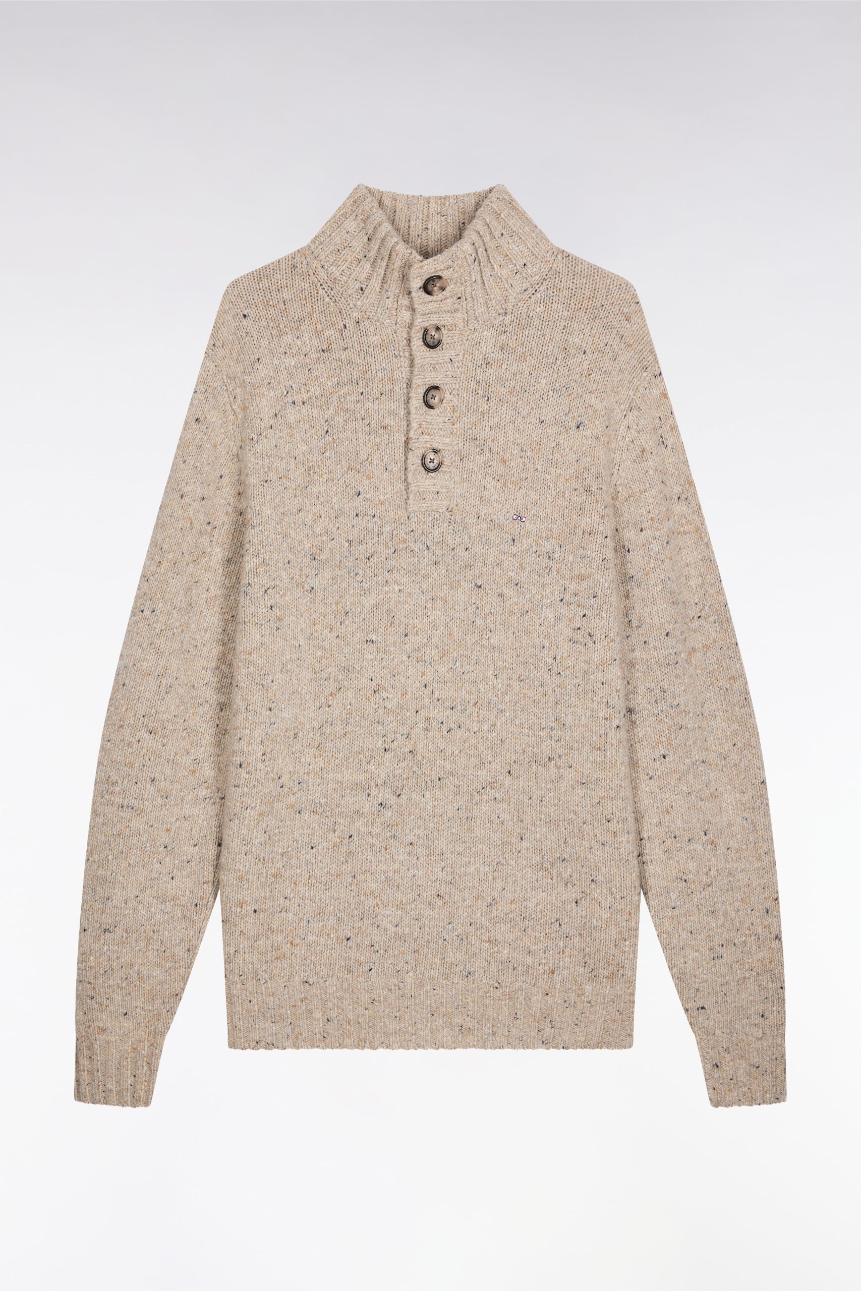 Véritable allié des jours froids, ce pull à col montant se distingue par sa maille épaisse, tricotée dans un mélange d’alpaga et de laine vierge pour une texture riche et authentique. Ce pull épais combine chaleur, douceur et élégance. Fermé par quatre boutons, doté d’un col côtelé et de finitions bords-côtes il atteste du soin porté à chaque détail comme à la sélection de nos matières. Le nœud papillon rose brodé sur la poitrine signe discrètement cette pièce intemporelle déclinée en beige ou en gris
