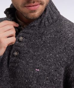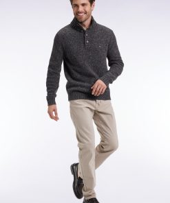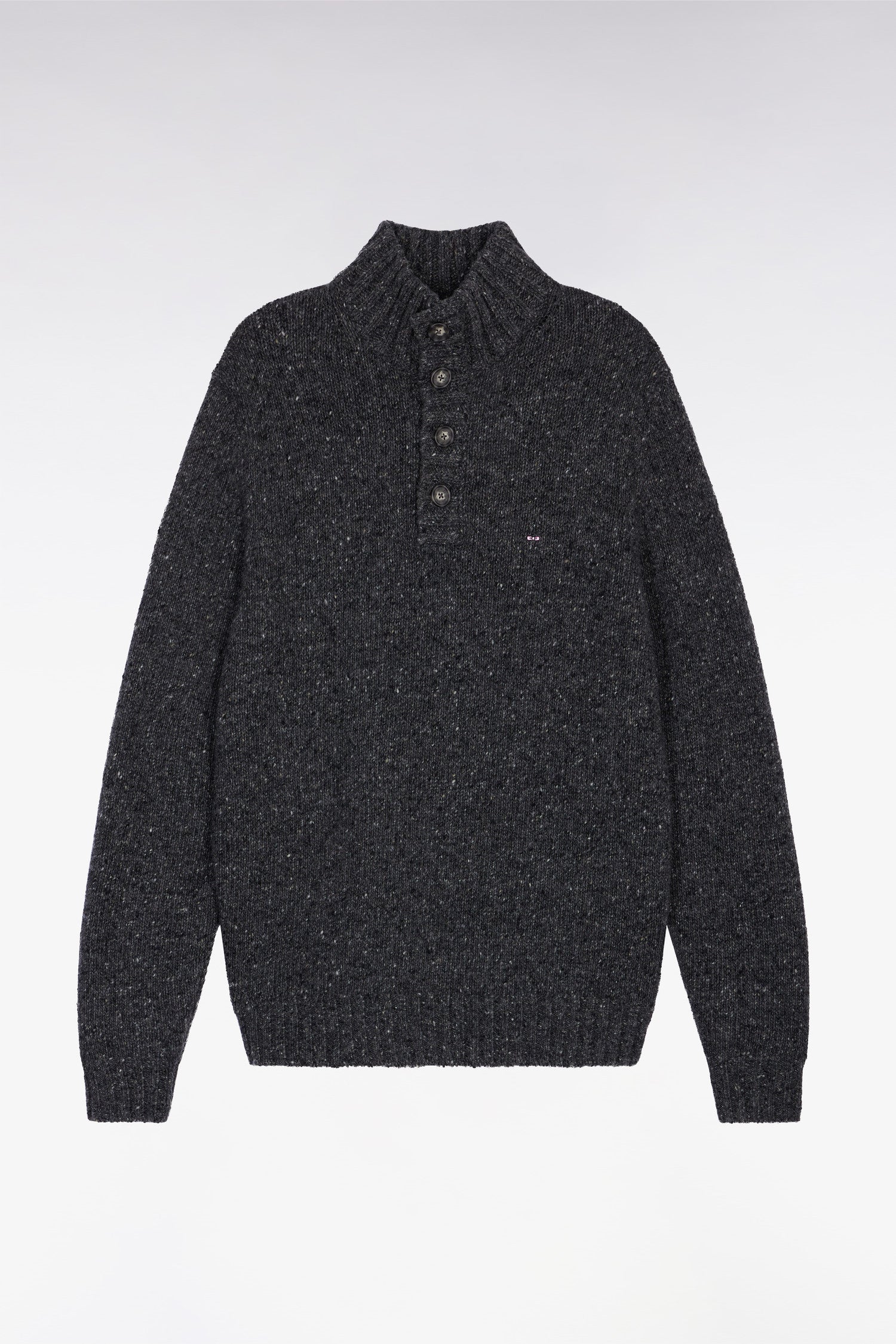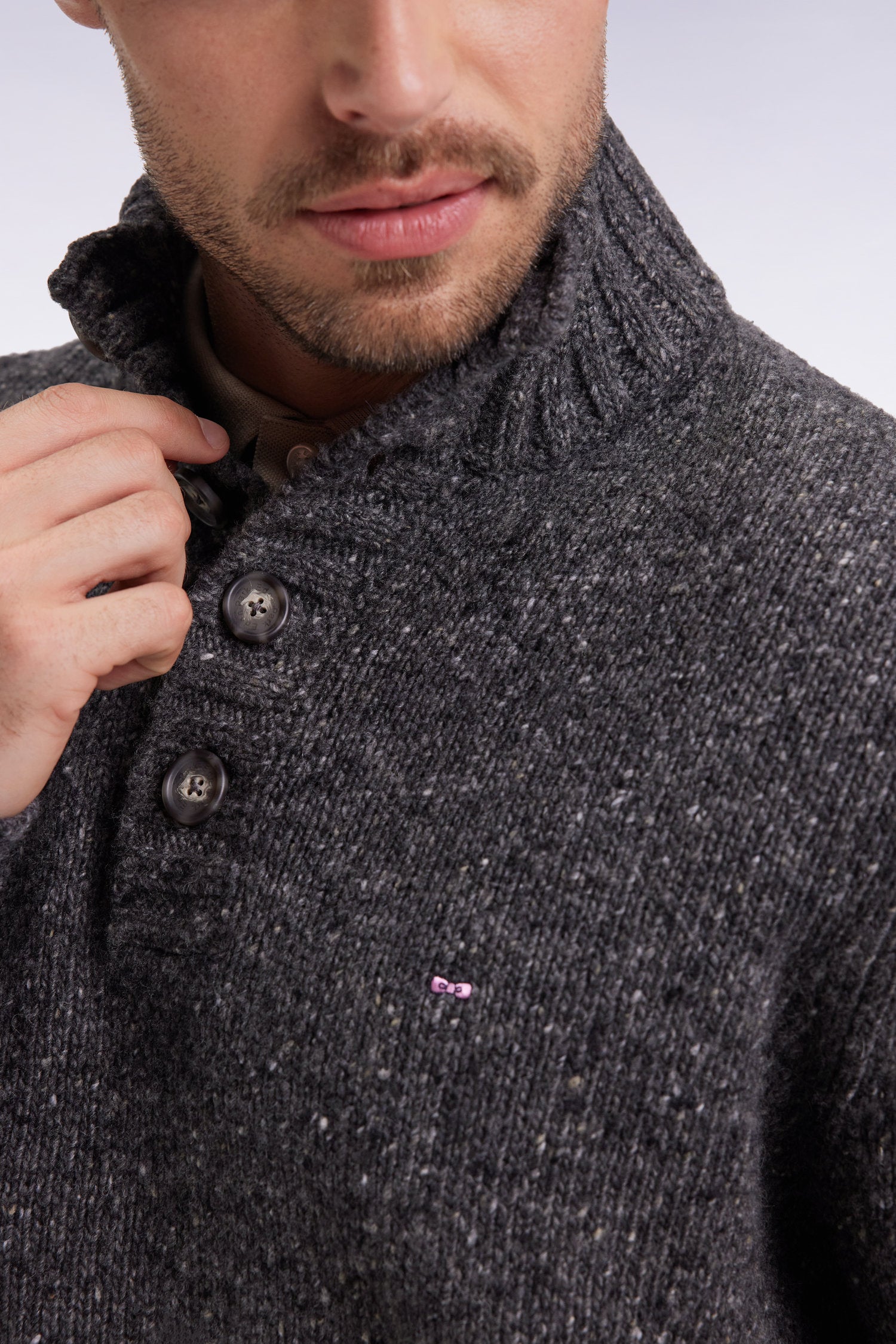 Véritable allié des jours froids, ce pull à col montant se distingue par sa maille épaisse, tricotée dans un mélange d’alpaga et de laine vierge pour une texture riche et authentique. Ce pull épais combine chaleur, douceur et élégance. Fermé par quatre boutons, doté d’un col côtelé et de finitions bords-côtes il atteste du soin porté à chaque détail comme à la sélection de nos matières. Le nœud papillon rose brodé sur la poitrine signe discrètement cette pièce intemporelle déclinée en beige ou en gris