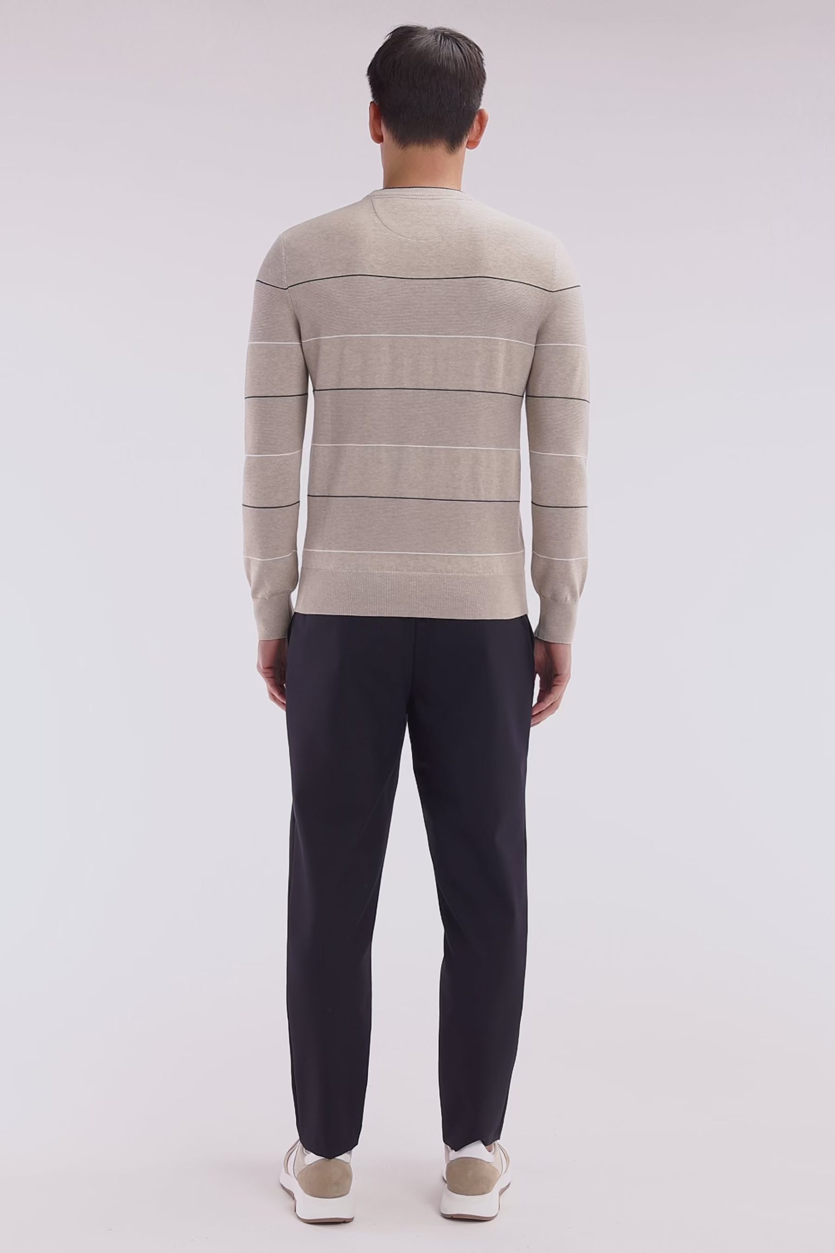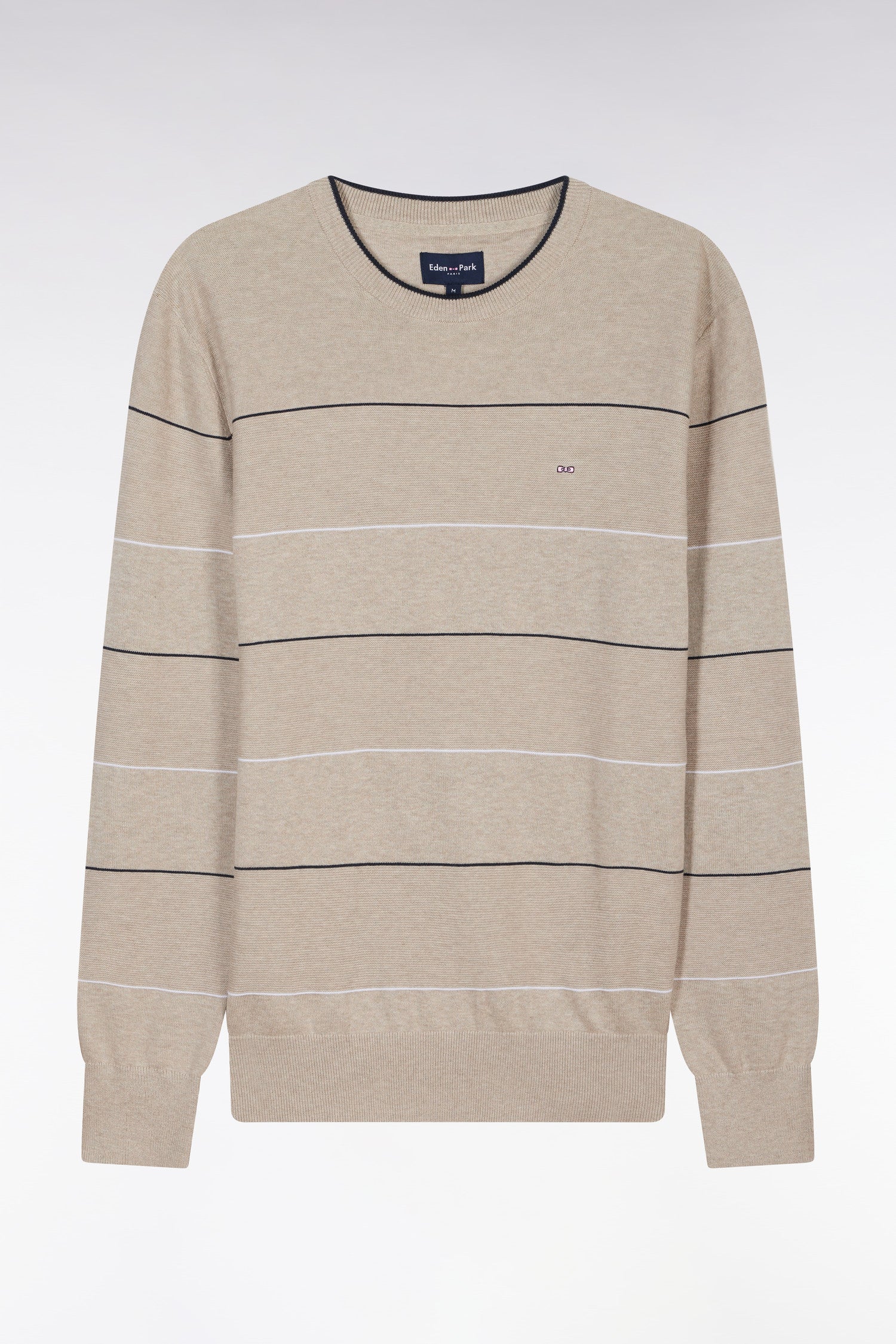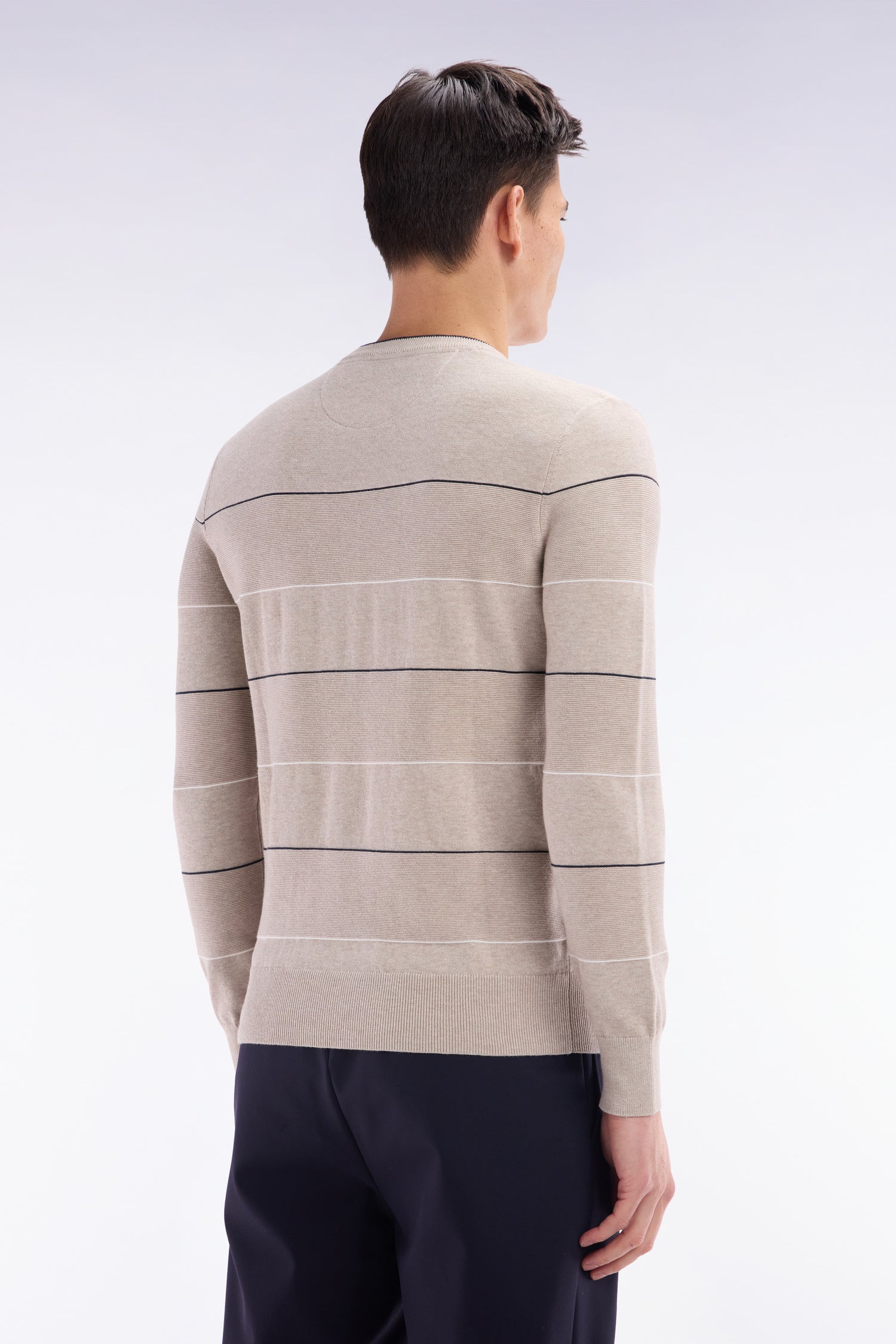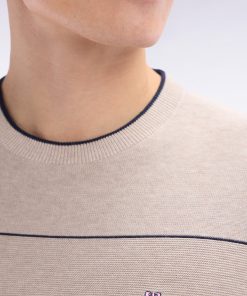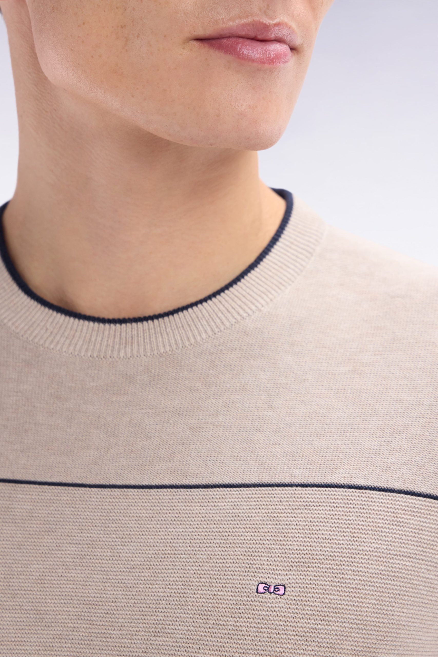 Notre pull homme à col rond se distingue par son jeu subtil de textures. Son tricotage chiné alterne des points jersey en deux styles distincts, créant un effet rayé élégant, chaque rayure étant soulignée par un liseré contrasté. Le col est orné d’un fin liseré contrasté et la poitrine arbore la broderie emblématique du nœud papillon Eden Park. Ce pull est disponible dans les quatre coloris intemporels de la ligne printemps-été Sporting Club : gris, bleu, beige ou blanc.