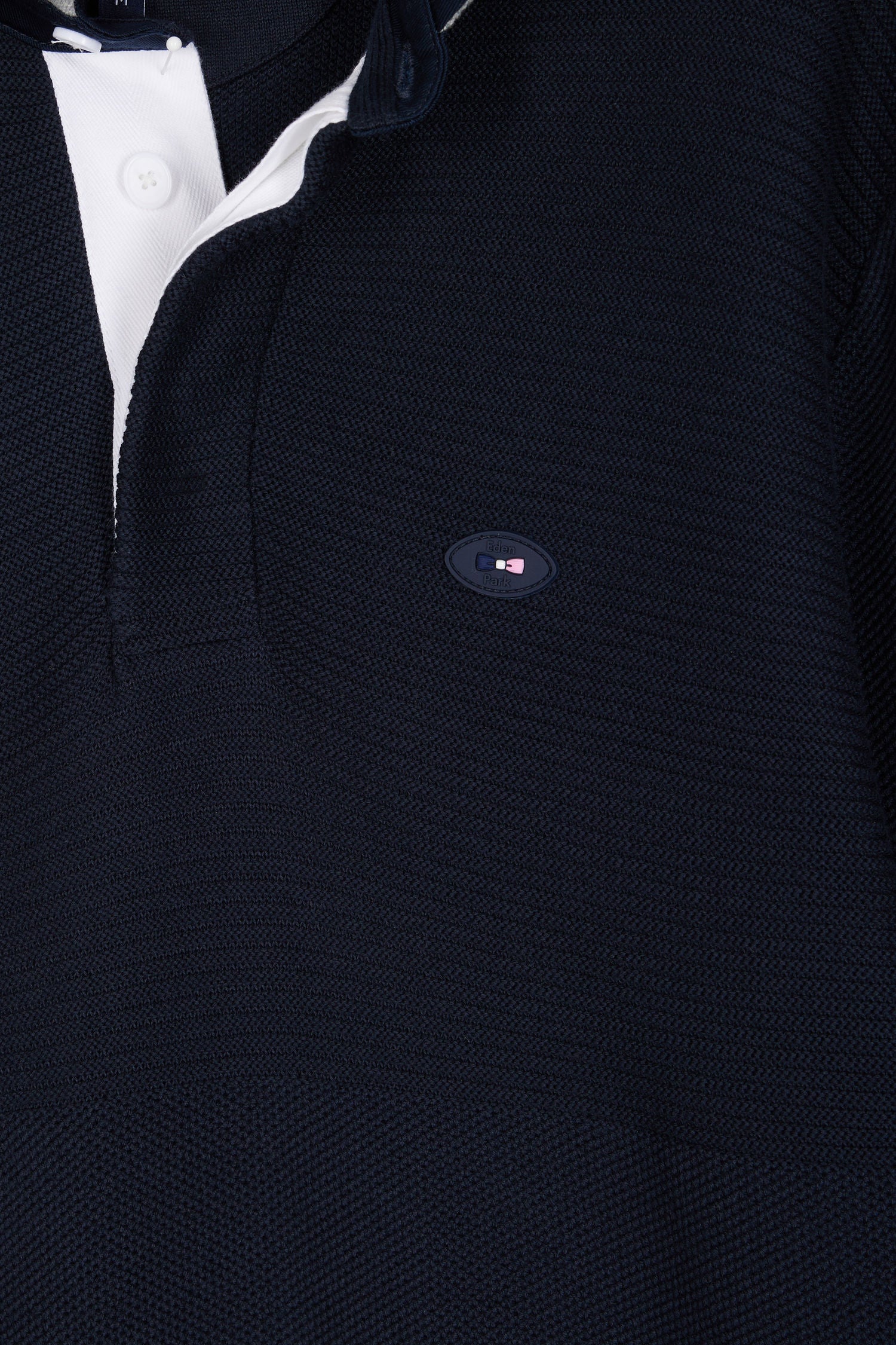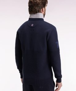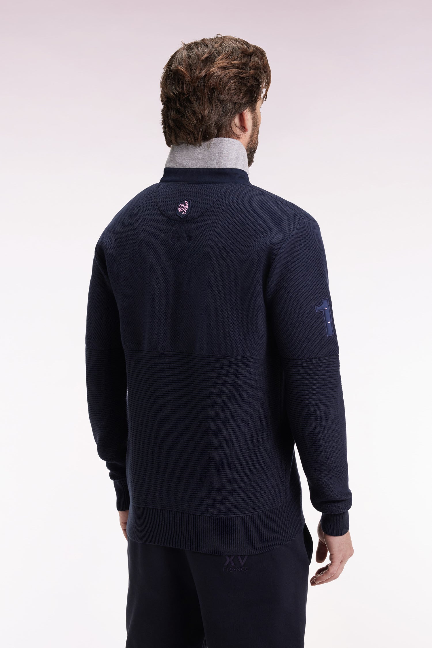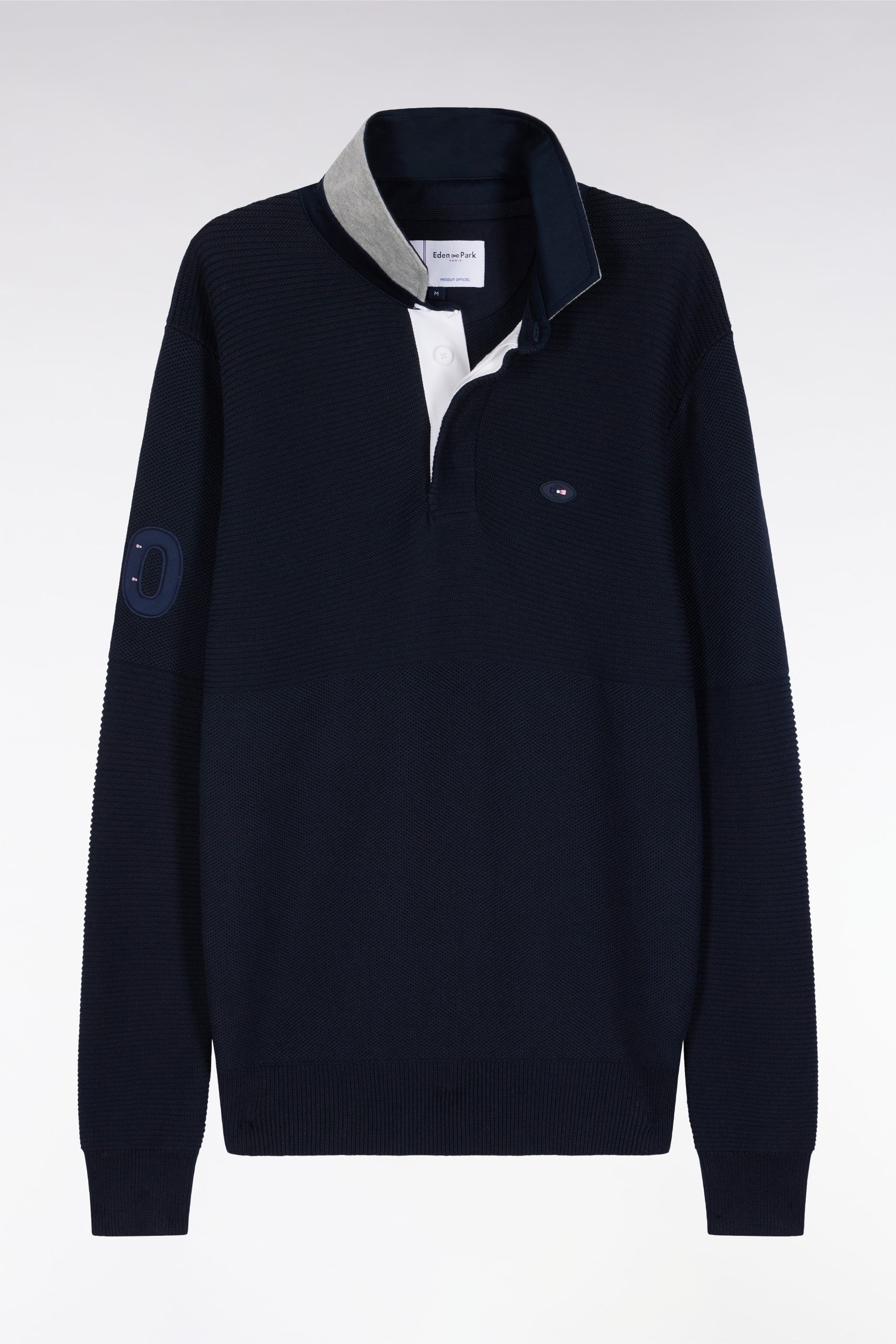 L’élégance sportive de ce pull à col montant zippé est entièrement inspiré de l’univers du rugby, pilier des origines de notre maison de mode française. Confectionné en coton pur en alternance de point nid d’abeille et de point Ottoman, ce pull réalisé avec le XV de France joue sur les textures pour affirmer son caractère. L’intérieur de col tricolore, la broderie 10 sur la manche et le badge en silicone Eden Park signent cette pièce unique
