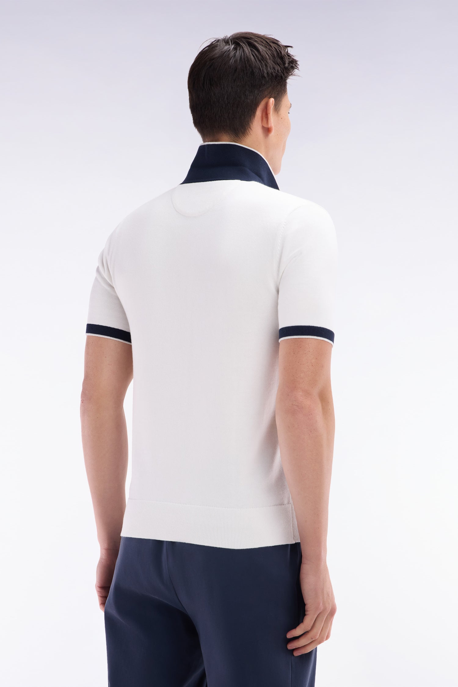 Ce pull à manches courtes, tricoté en maille envers, revisite le polo avec une touche de raffinement. Son col en coton milano, orné d’un fin liseré contrasté, et ses bordures de manches assorties confèrent une allure sophistiquée à cette pièce tendance et intemporelle à la fois. Les manches et le col sont finis en bord-côtes pour un style parfaitement ajusté. Disponible dans les quatre coloris de la collection Sporting Club.