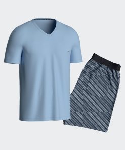 Un T-shirt manches courtes en coton uni marine ou ciel et un short taille élastiquée imprimé d’un motif graphique bordeaux ou bleu exclusif à notre Maison composent ce pyjama homme. Un ensemble de nuit parfait pour un style à la fois décontracté et élégant.