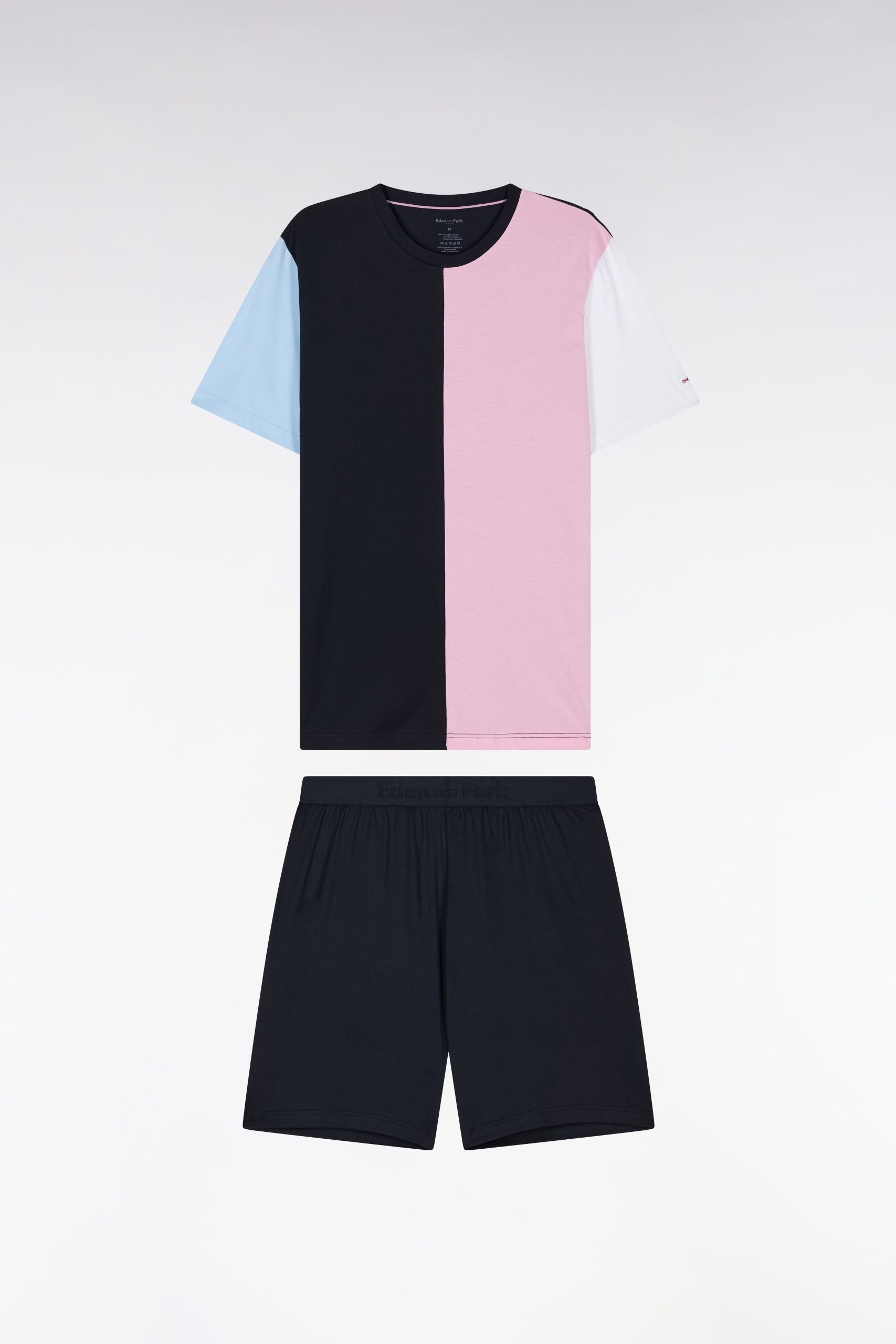 Inspiré de nos pièces coupées-cousues, ce pyjama homme en propose une version confortable pensée pour votre sommeil. Cet ensemble pyjama comprend un T-shirt manches courtes colorblock et un short à la taille élastiquée, tous deux réalisés dans un jersey de coton de haute qualité.