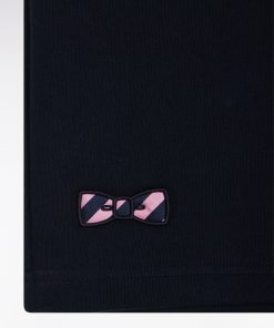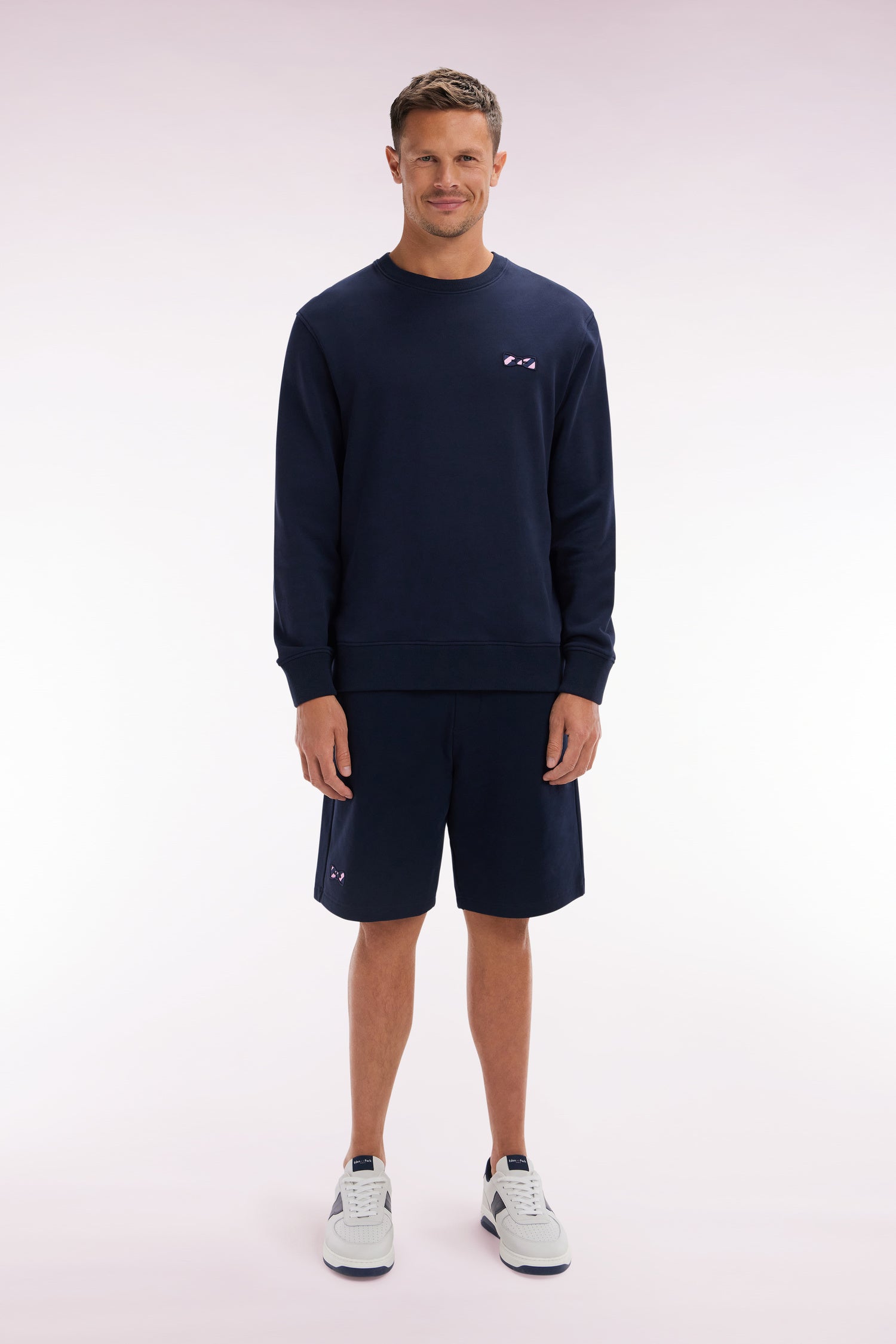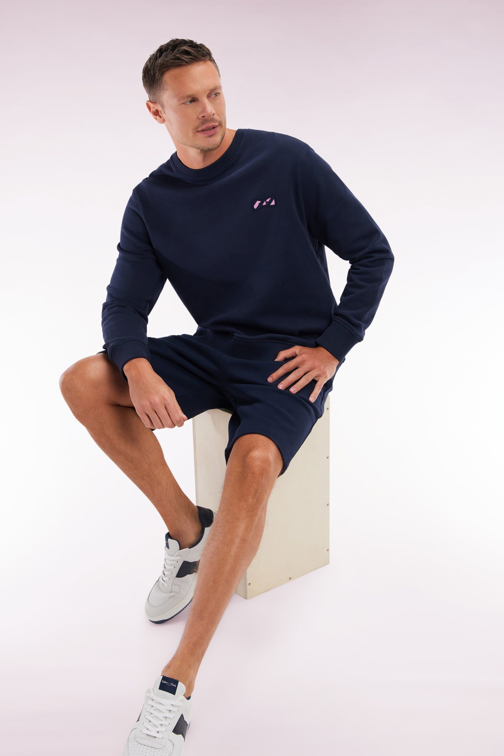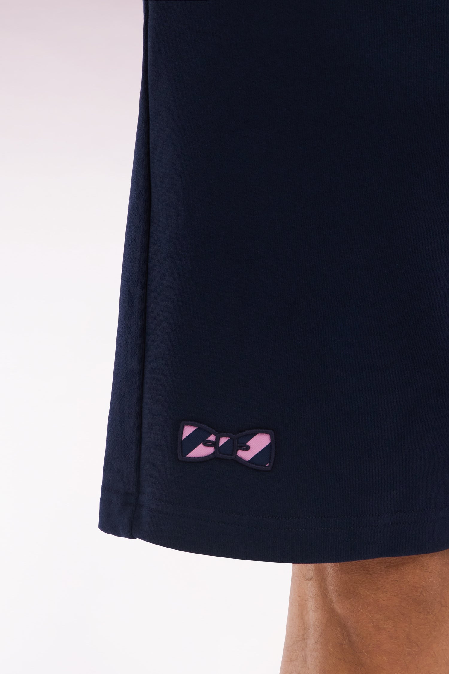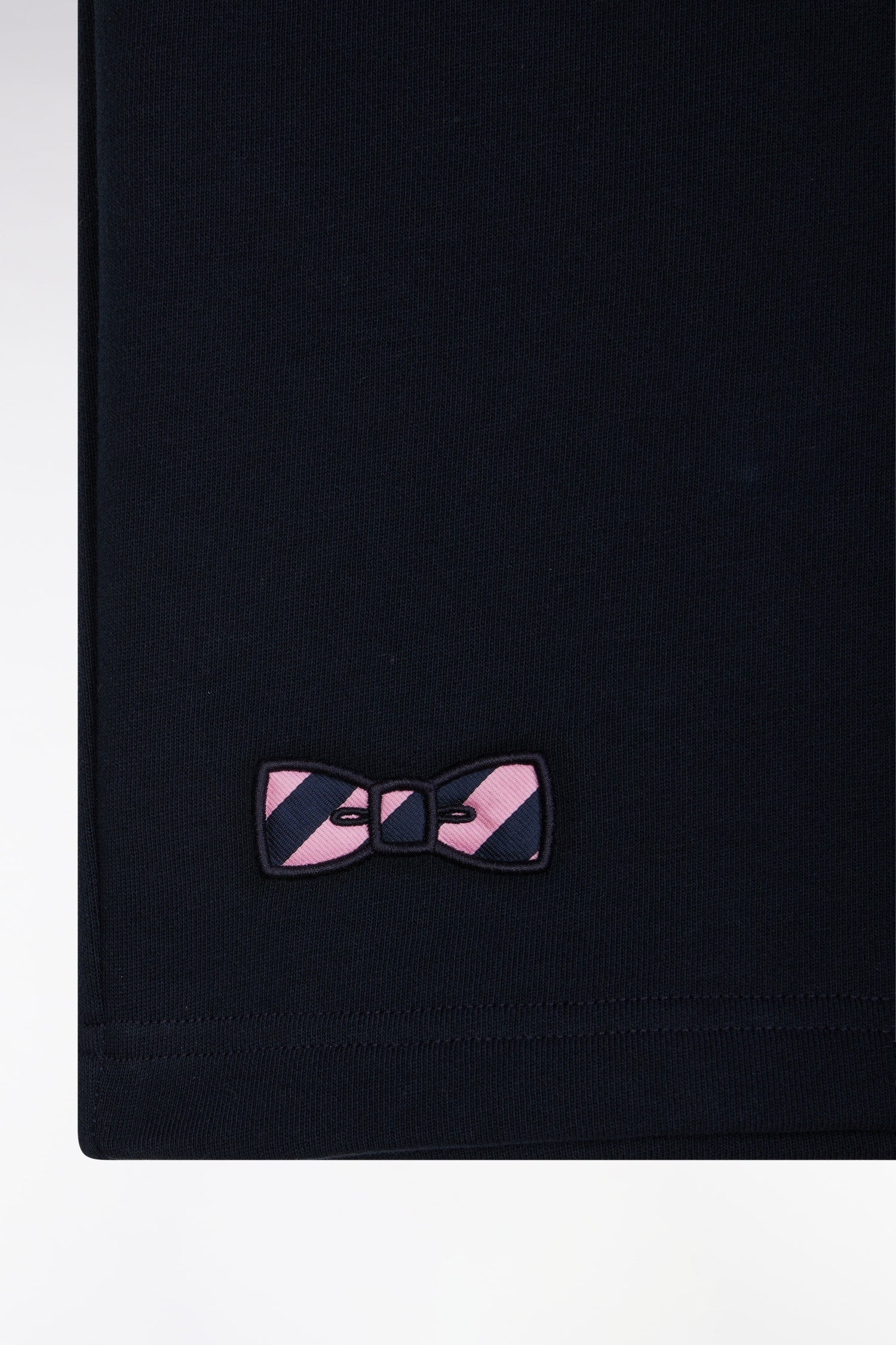 Avec ses cordons de serrage rayés, rappel de sa broderie nœud papillon cerclée, ce short en molleton coton apporte une note graphique aux silhouettes de la saison estivale. Proposé en marine ou en bleu ciel, ce modèle s’accorde parfaitement aux pièces et accessoires imaginées par notre studio de création.
