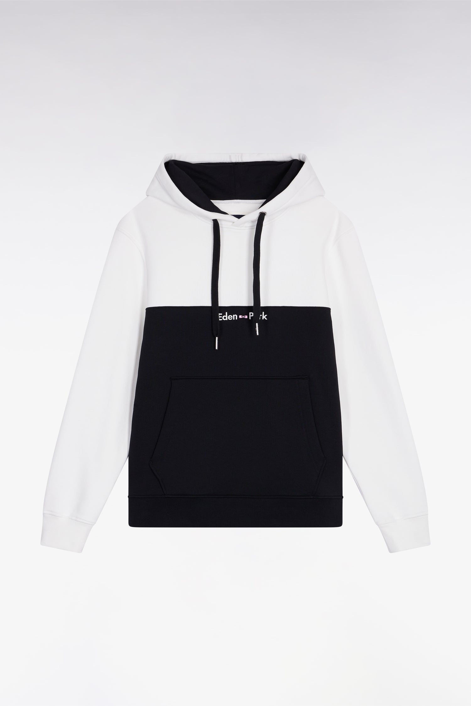 Avec sa coupe droite et son molleton gratté doux, ce sweatshirt bicolore marine et rose, ciel ou blanc incarne l’essence du confort selon notre Maison. La broderie Eden Park à l’avant affirme discrètement son identité, tandis que les finitions en métal argenté et les bords-côtes aux poignets et bas de pièce renforcent son allure soignée. Une pièce graphique à l’intérieur de capuche et cordons de serrage marine pour plus d’élégance