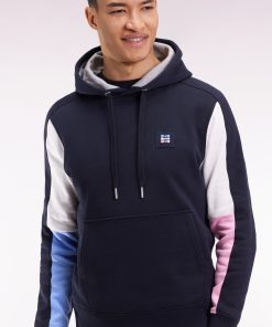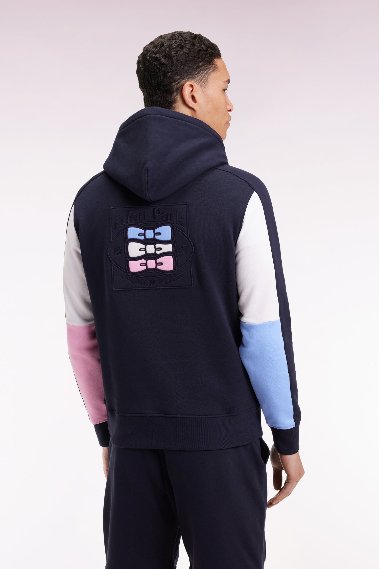 Ce sweatshirt tricolore à capuche en molleton gratté conjugue confort et esprit graphique. Son molleton légèrement épais offre une chaleur douce idéale pour le quotidien, tandis que les découpes contrastées aux manches et la capuche doublée en coloris gris ou ciel dynamisent la silhouette masculine. Dans le dos, une broderie aux incrustations de jersey apporte une touche sport-chic à ce sweatshirt pensé pour suivre votre rythme de vie. Des codes discrets mais distinctifs, pour ceux qui savent lire entre les lignes d’un vestiaire travaillé, équilibre parfait entre sportivité et allure urbaine