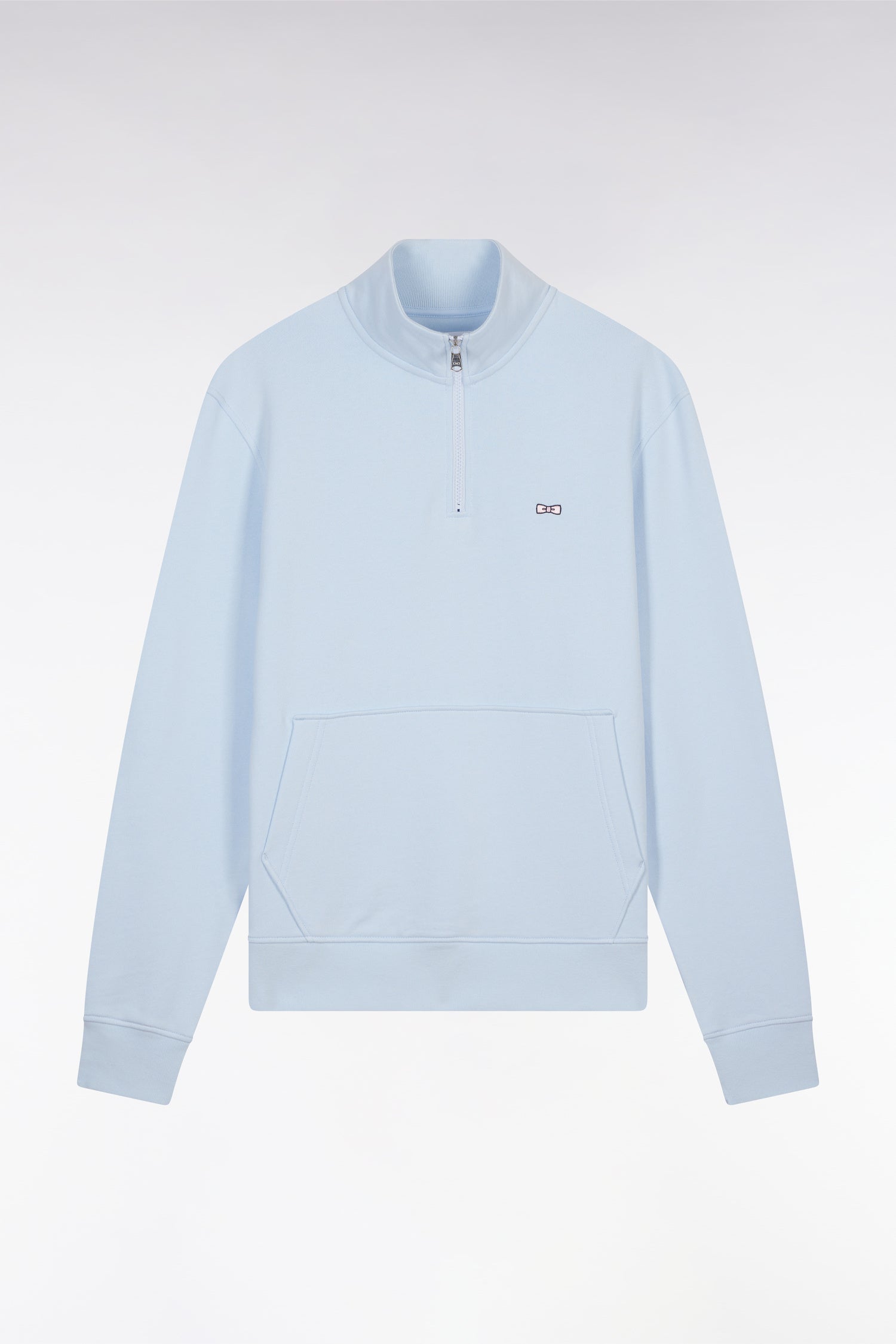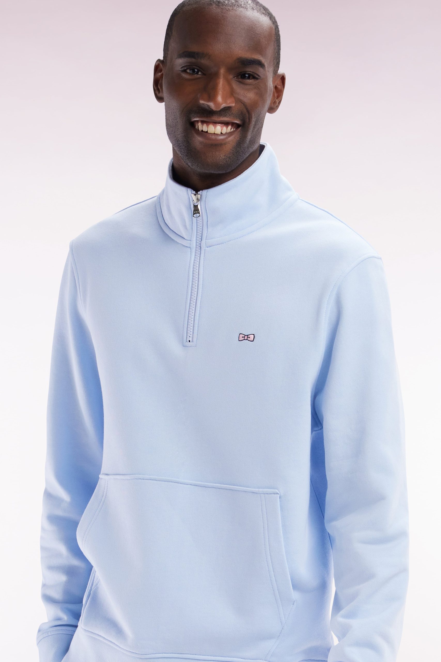 Ce sweatshirt à col camionneur zippé en molleton de coton doux allie confort et style avec sa coupe droite et sa poche kangourou pratique. L’emblème nœud papillon brodé sur la poitrine avec un fil rose apporte une touche d’élégance distinctive à ce sweatshirt à col montant. Disponible en quatre coloris, cette pièce offre une allure moderne et décontractée en toutes occasions.