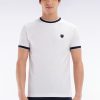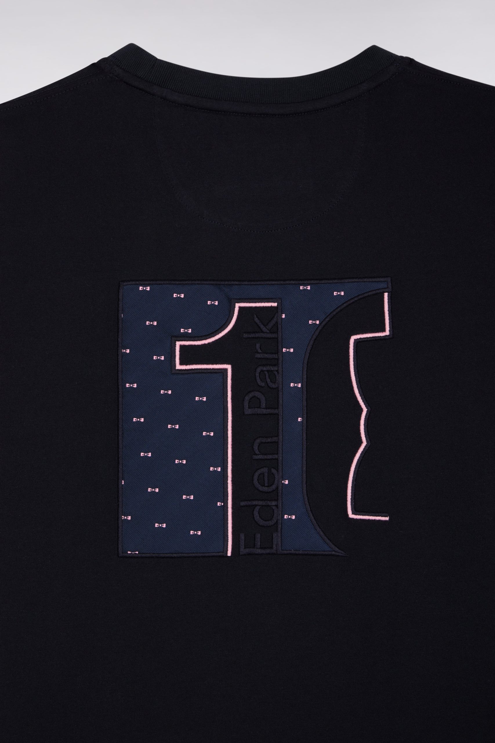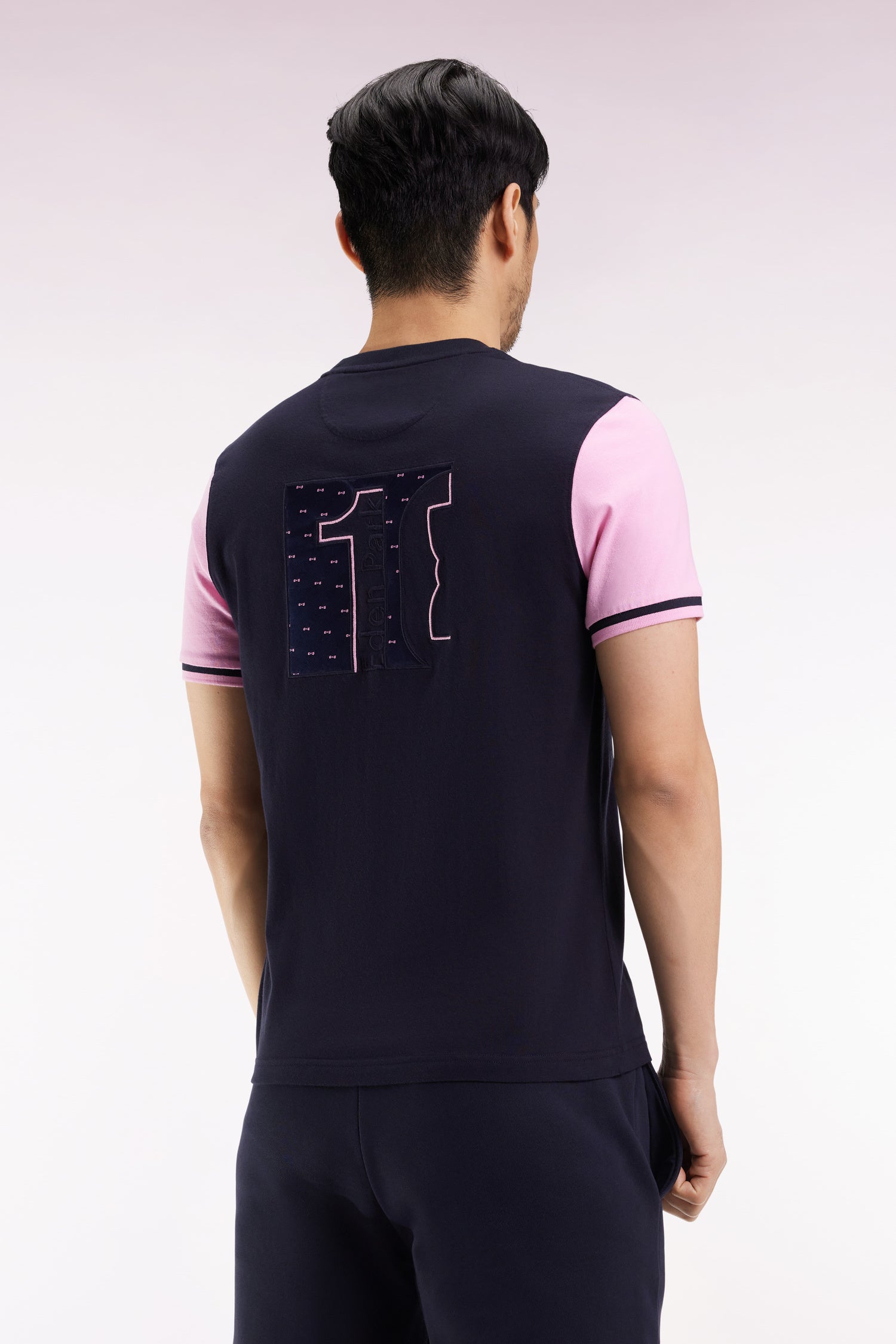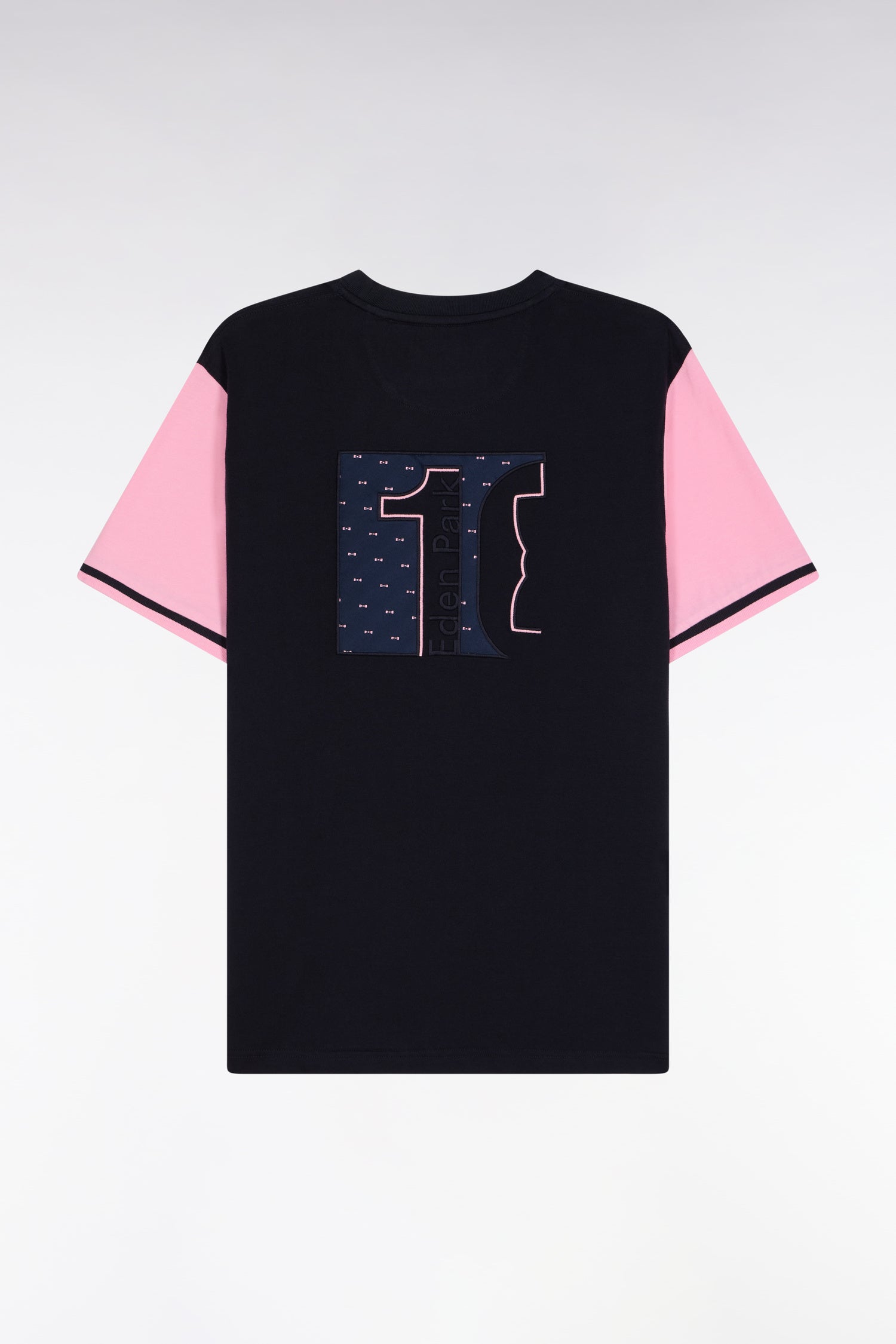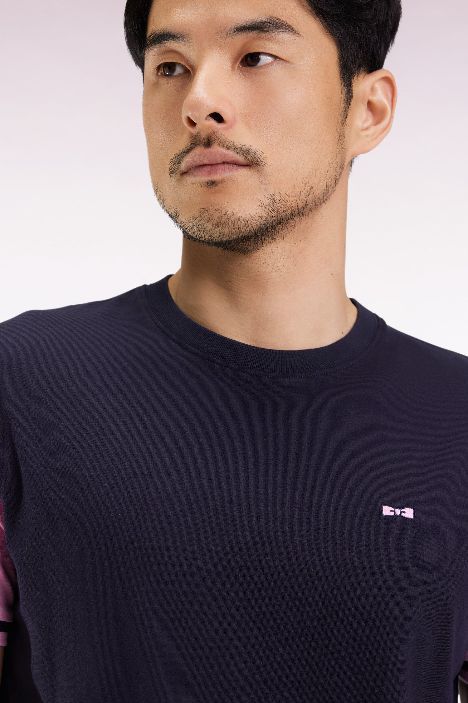 Ce T-shirt en jersey bicolore comporte des manches courtes roses soulignées par un bord en bords-côtes marine pour dynamiser la silhouette. Dans le dos, une broderie exclusive avec incrustations de tissu cravate à motifs nœuds papillon affirme le caractère distinctif de ce modèle portant fièrement les couleurs Eden Park. L’encolure en bords-côtes plats et la bande de propreté intérieure, réalisée dans le même tissu cravate imprimé, témoignent d’une attention portée aux moindres détails