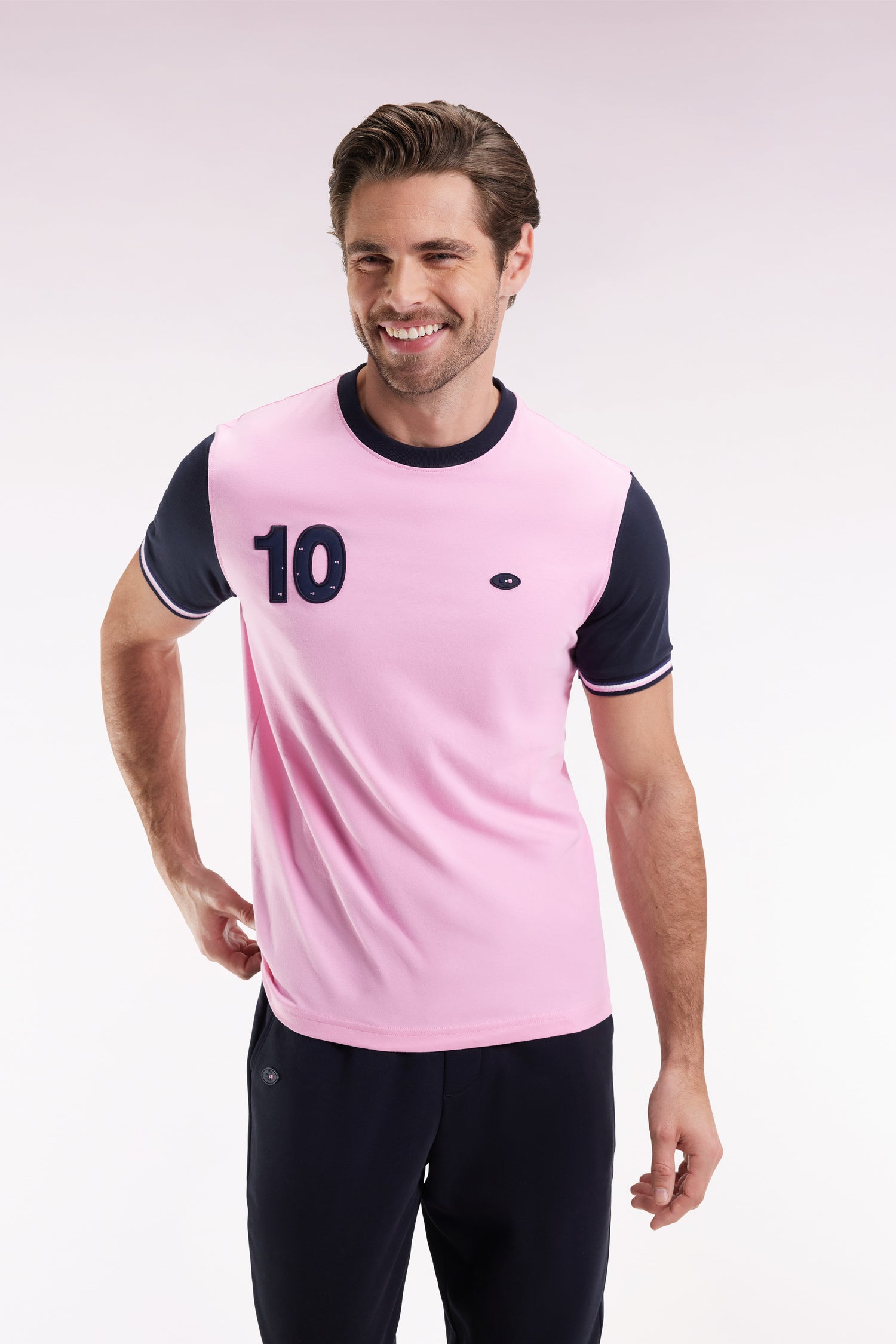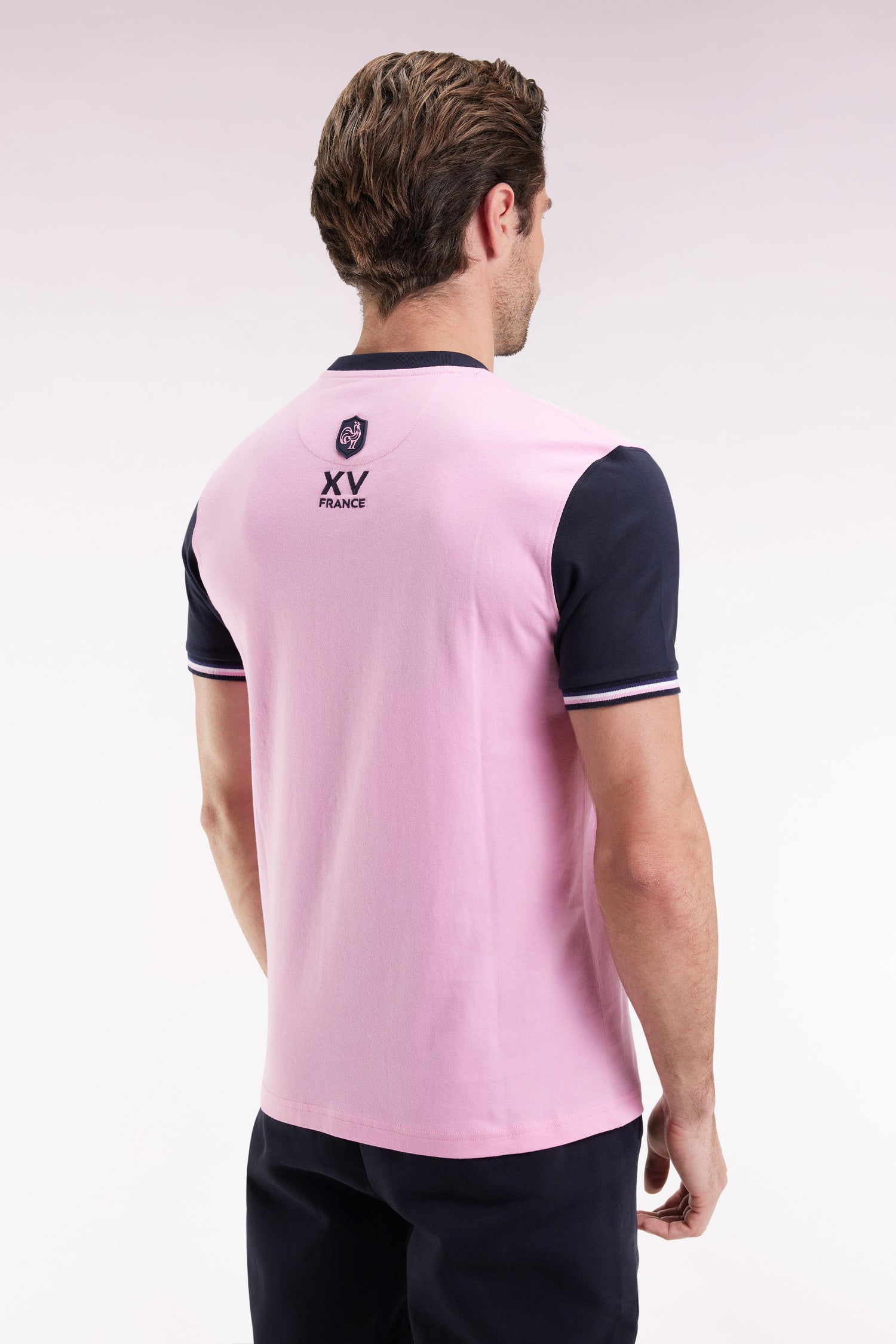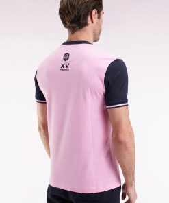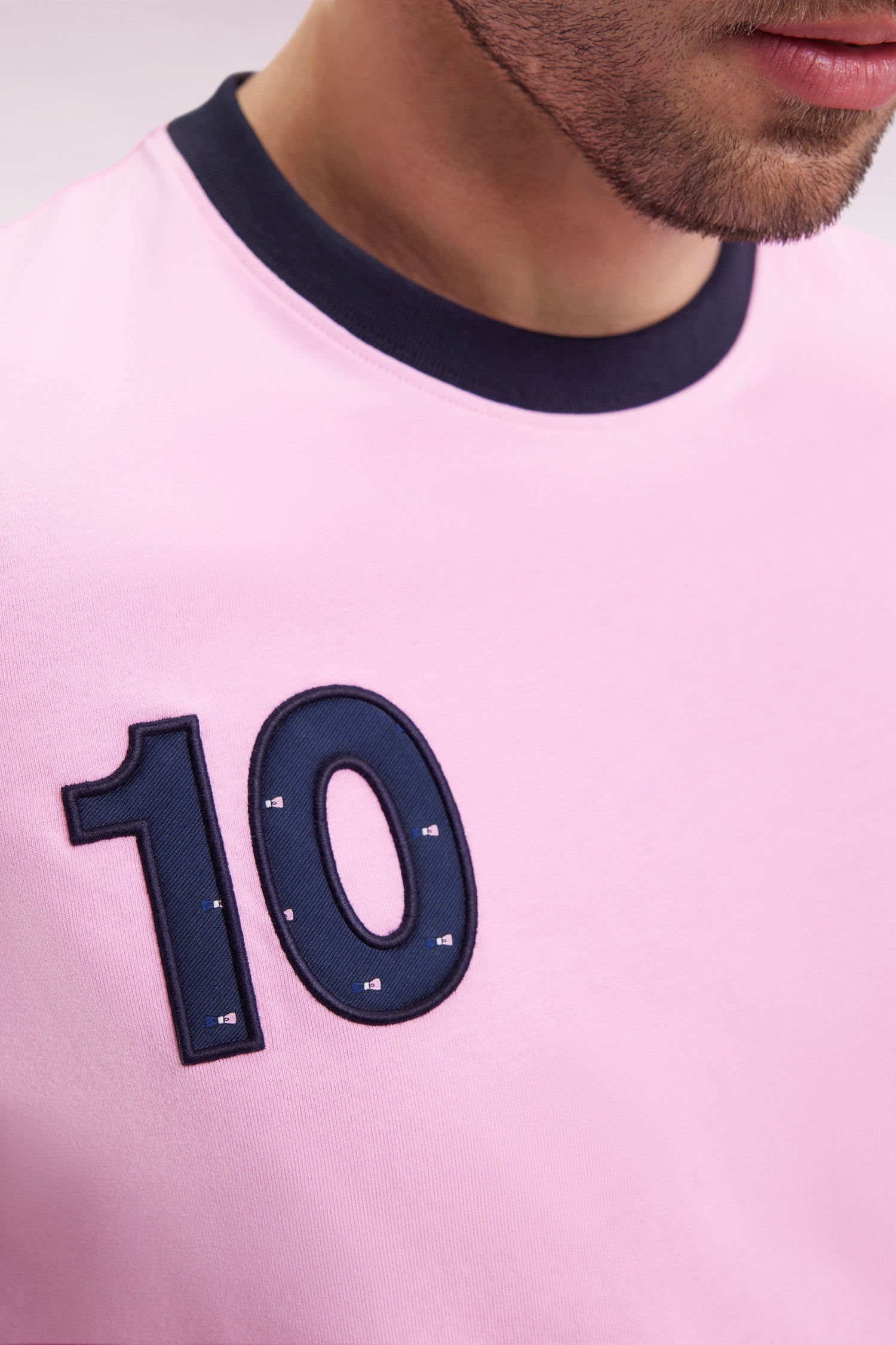 Affichez votre passion pour le rugby avec ce T-shirt en coton bicolore confectionné avec le XV de France masculin. En rose ou en marine, ce T-shirt à manches courtes se dote de bordures de manches en bords-côtes tricolores, d’une encolure ronde contrastée et de deux détails signature : un écusson nœud papillon brodé sur la poitrine et le numéro 10, maillot historique de notre fondateur Franck Mesnel, dans une déclinaison sport-chic rehaussée de tissu cravate à motif nœud papillon, l’emblème de notre maison française. Un modèle idéal pour ne jamais passer inaperçu