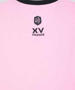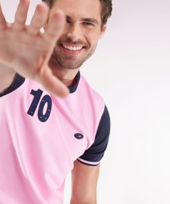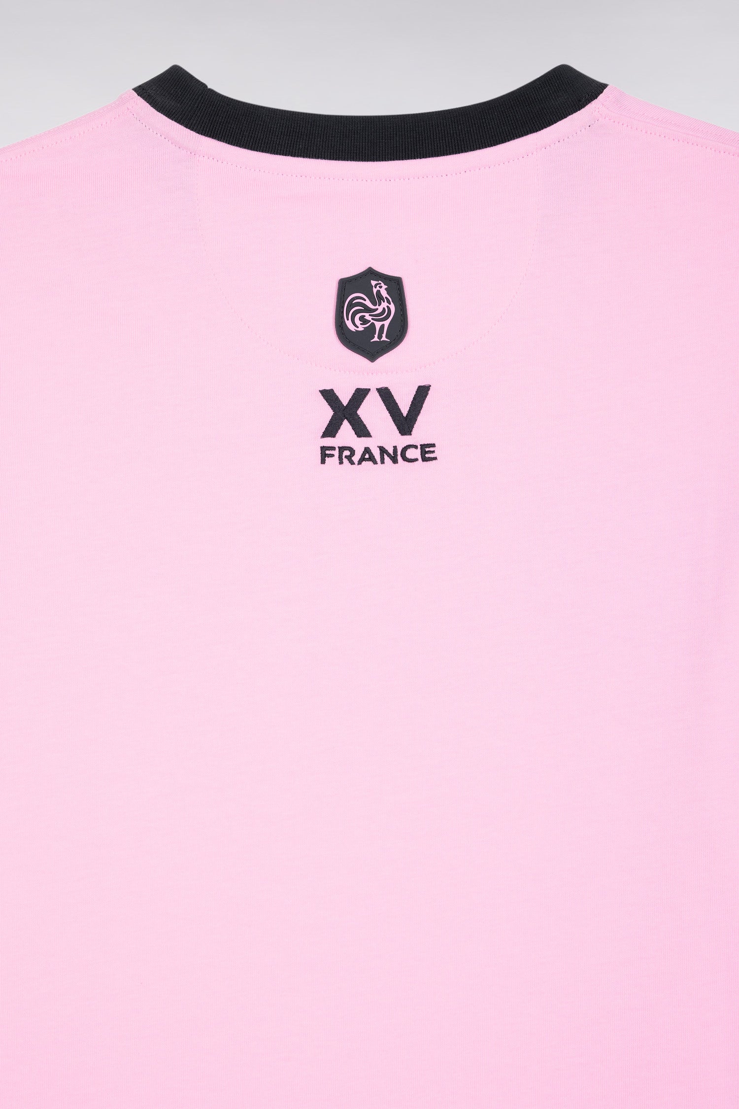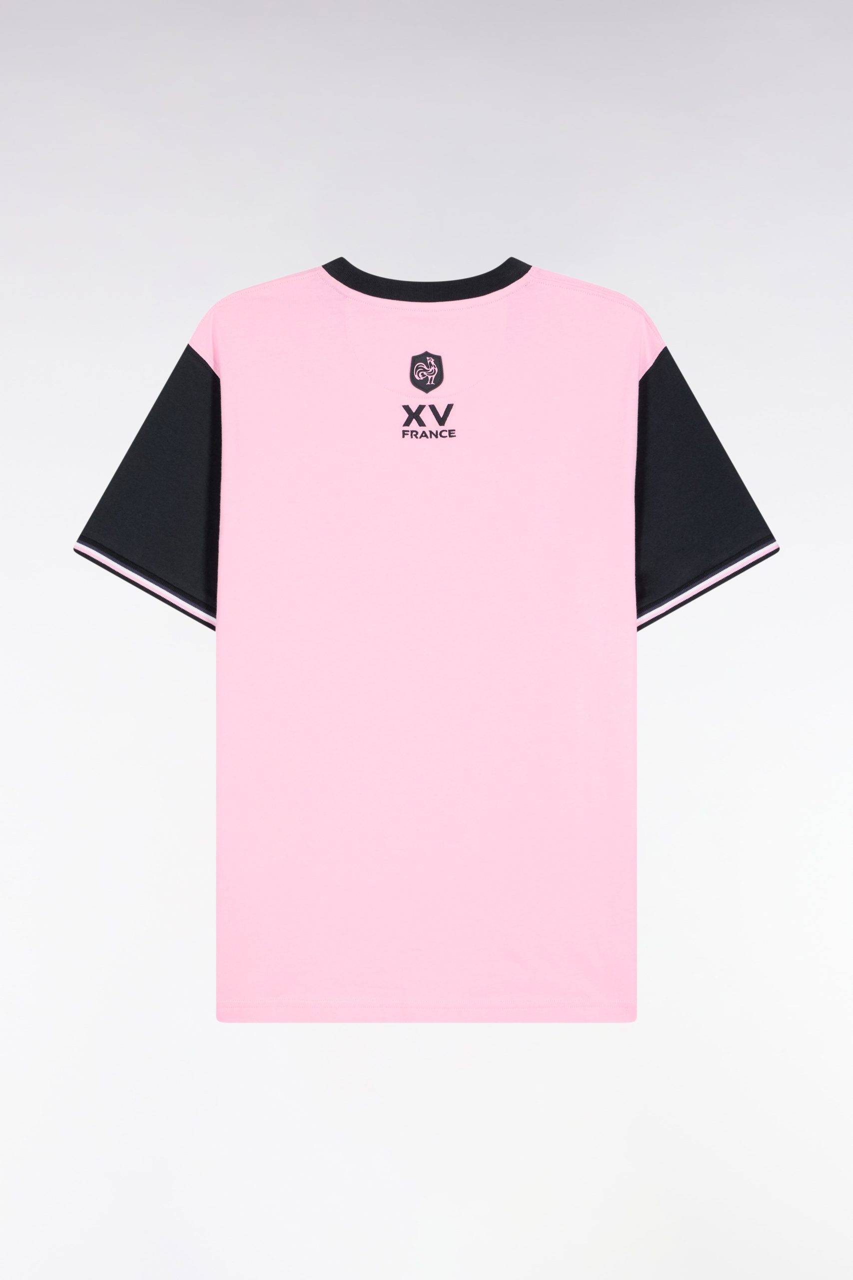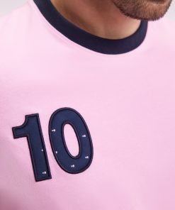 Affichez votre passion pour le rugby avec ce T-shirt en coton bicolore confectionné avec le XV de France masculin. En rose ou en marine, ce T-shirt à manches courtes se dote de bordures de manches en bords-côtes tricolores, d’une encolure ronde contrastée et de deux détails signature : un écusson nœud papillon brodé sur la poitrine et le numéro 10, maillot historique de notre fondateur Franck Mesnel, dans une déclinaison sport-chic rehaussée de tissu cravate à motif nœud papillon, l’emblème de notre maison française. Un modèle idéal pour ne jamais passer inaperçu