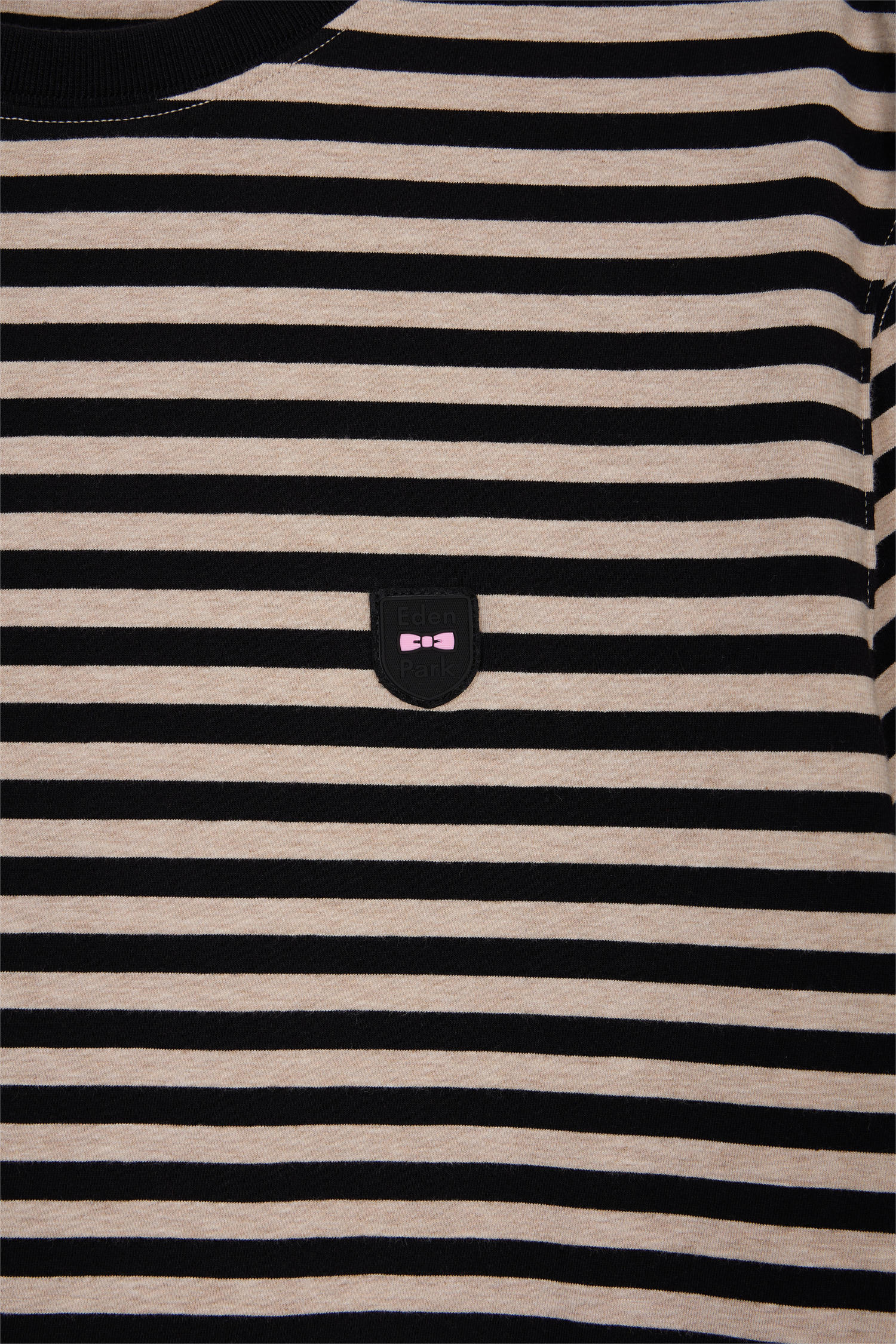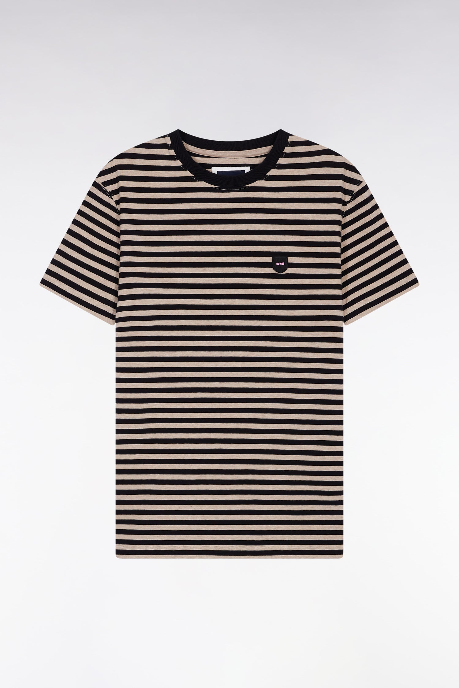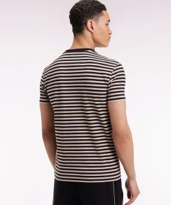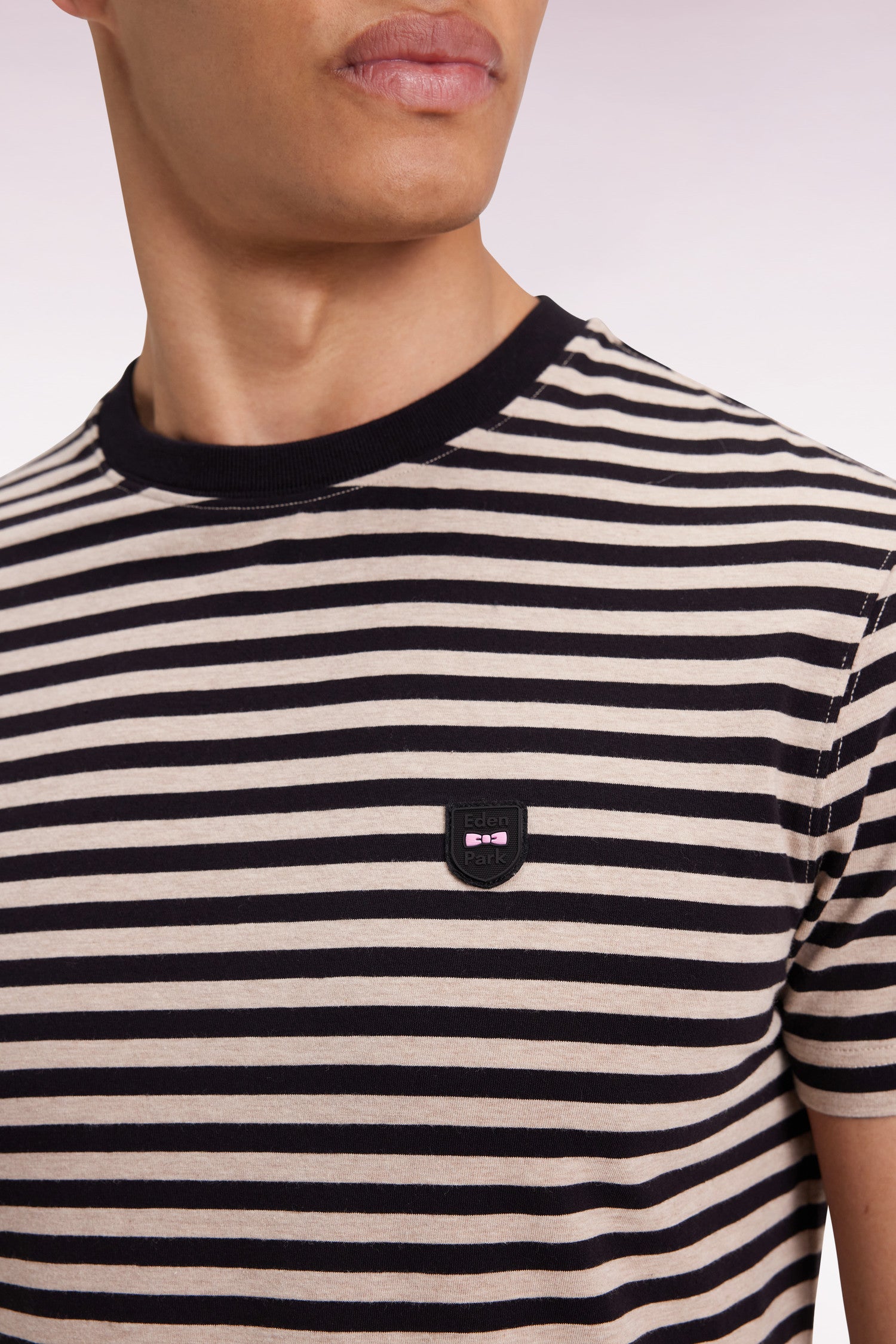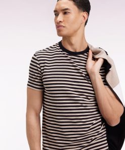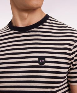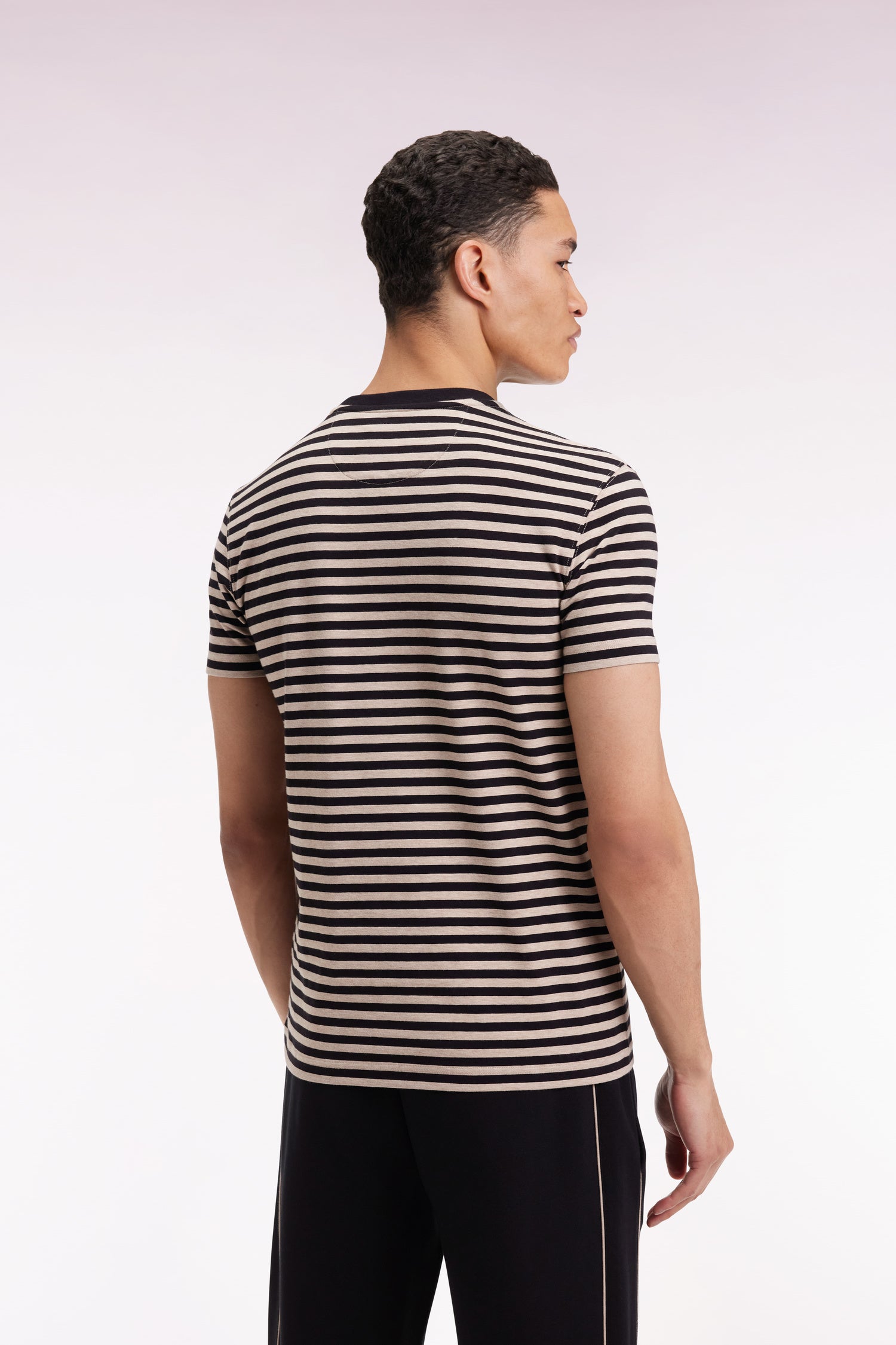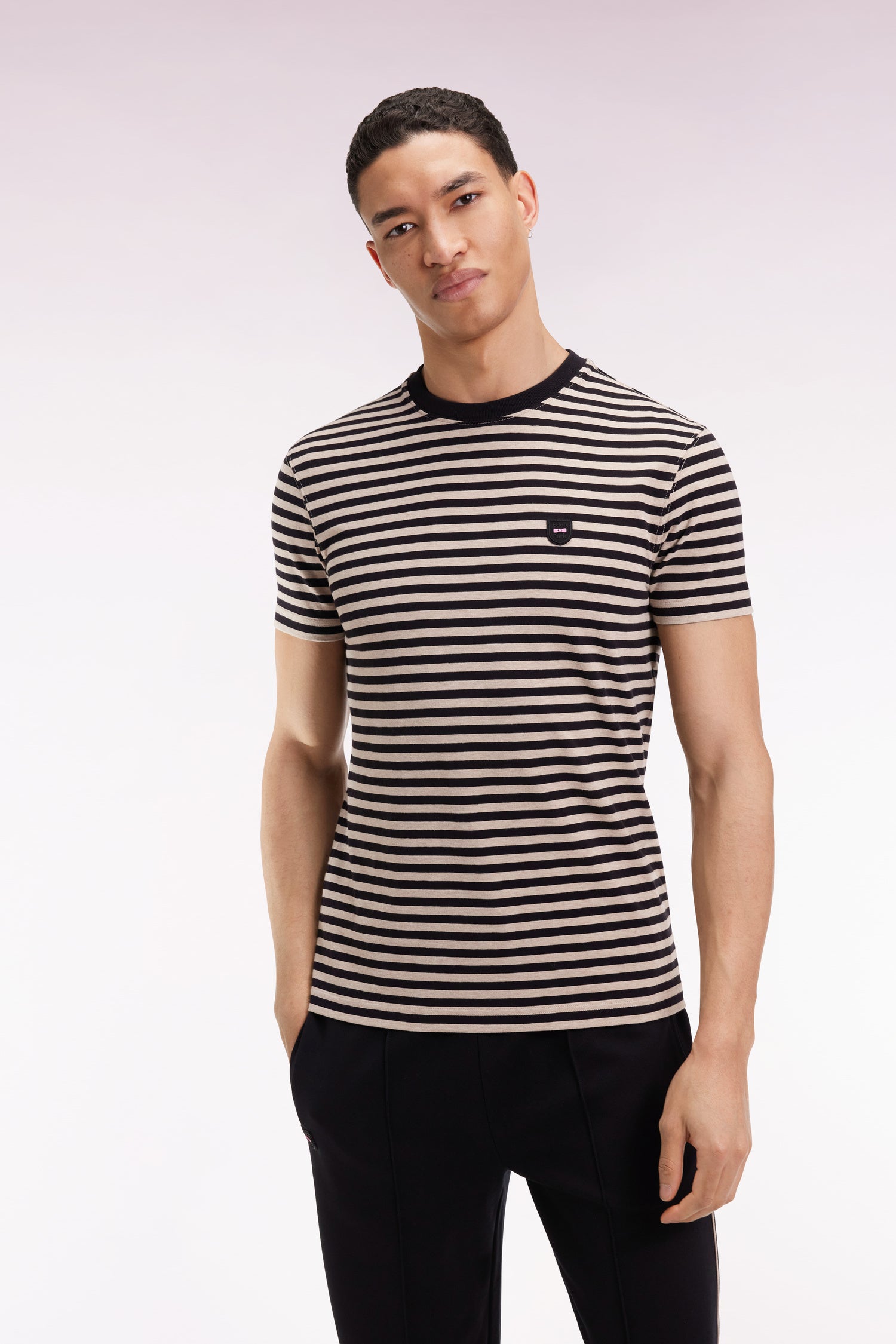 Pensé pour accompagner les mouvements avec fluidité, ce T-shirt en jersey de coton stretch revisite un essentiel du vestiaire masculin dans une version athlétique et raffinée à rayures horizontales. Sa coupe slim ajustée souligne la silhouette sans la contraindre, tandis que son col rond en bords-côtes contrastés assure une tenue durable. Un incontournable moderne doté de notre écusson signature