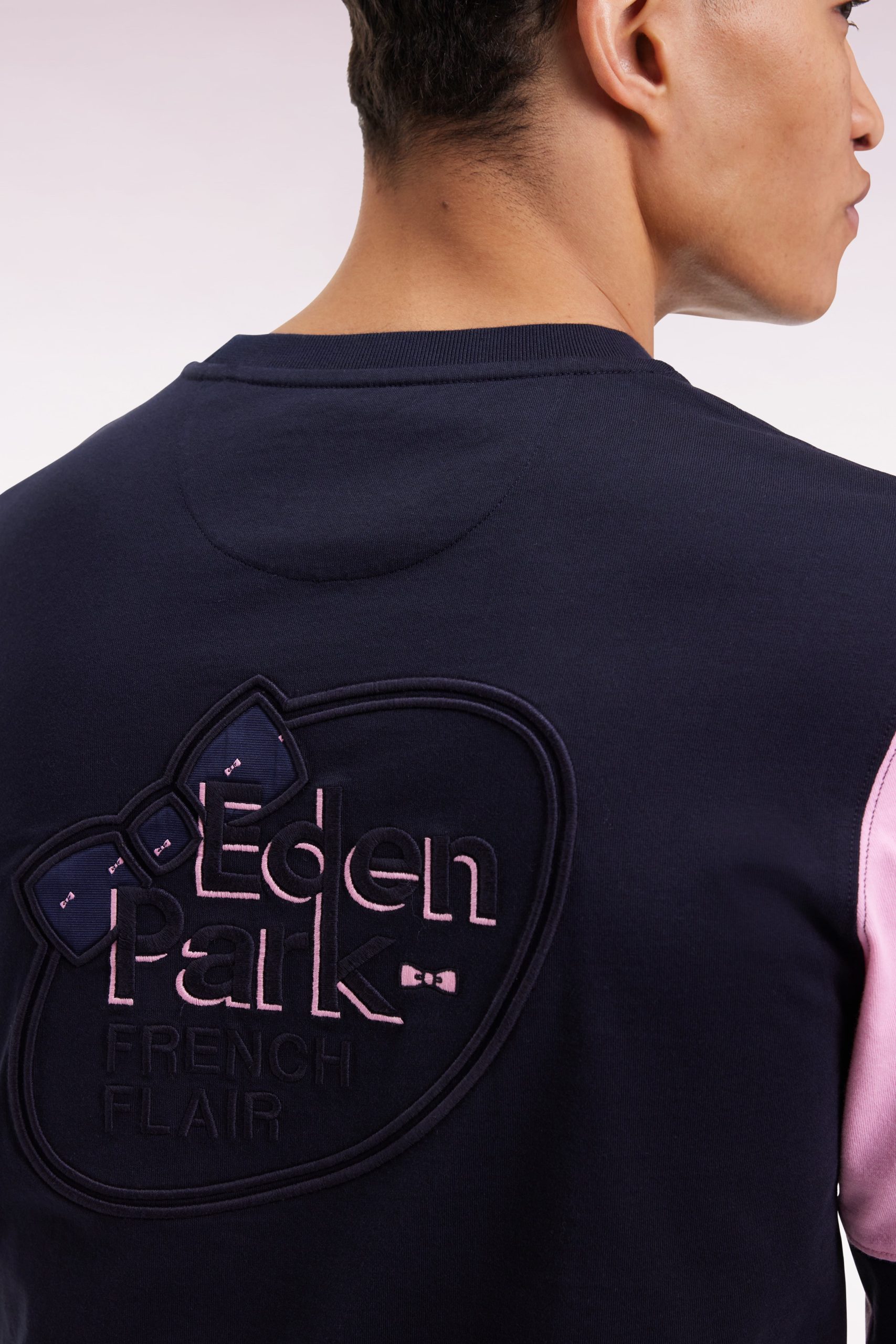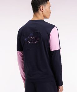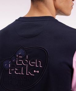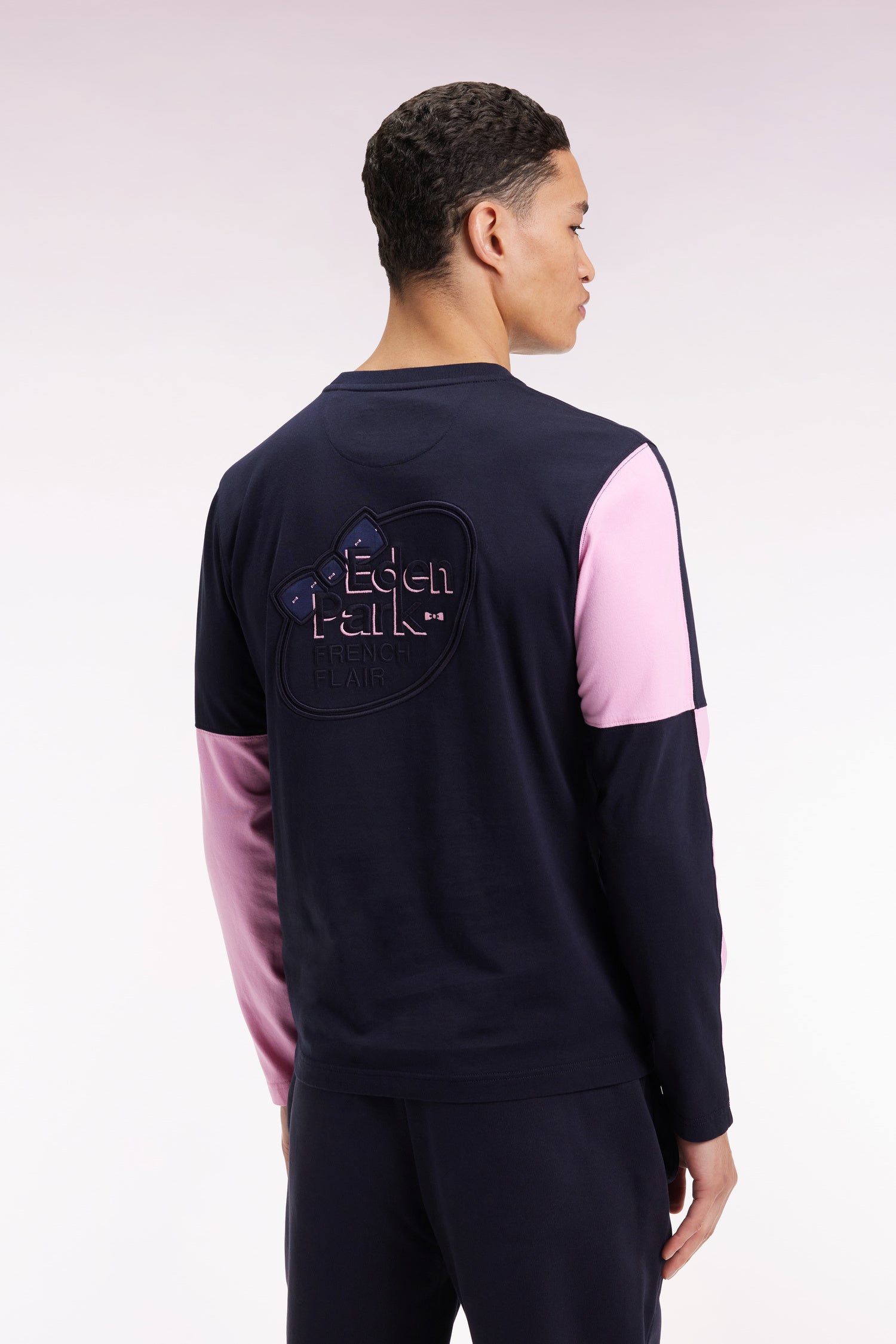 Ce T-shirt homme à manches longues en jersey de coton revisite l’esprit maillot de rugby dans une version graphique et contemporaine. Le jeu de colorblock en cadrans sur les manches, travaillé en camaïeux de bleu ou blanc et gris apporte rythme et contraste à la silhouette. Un modèle au style sport-chic affirmé, signé par sa broderie nœud papillon rose sur la poitrine