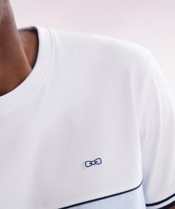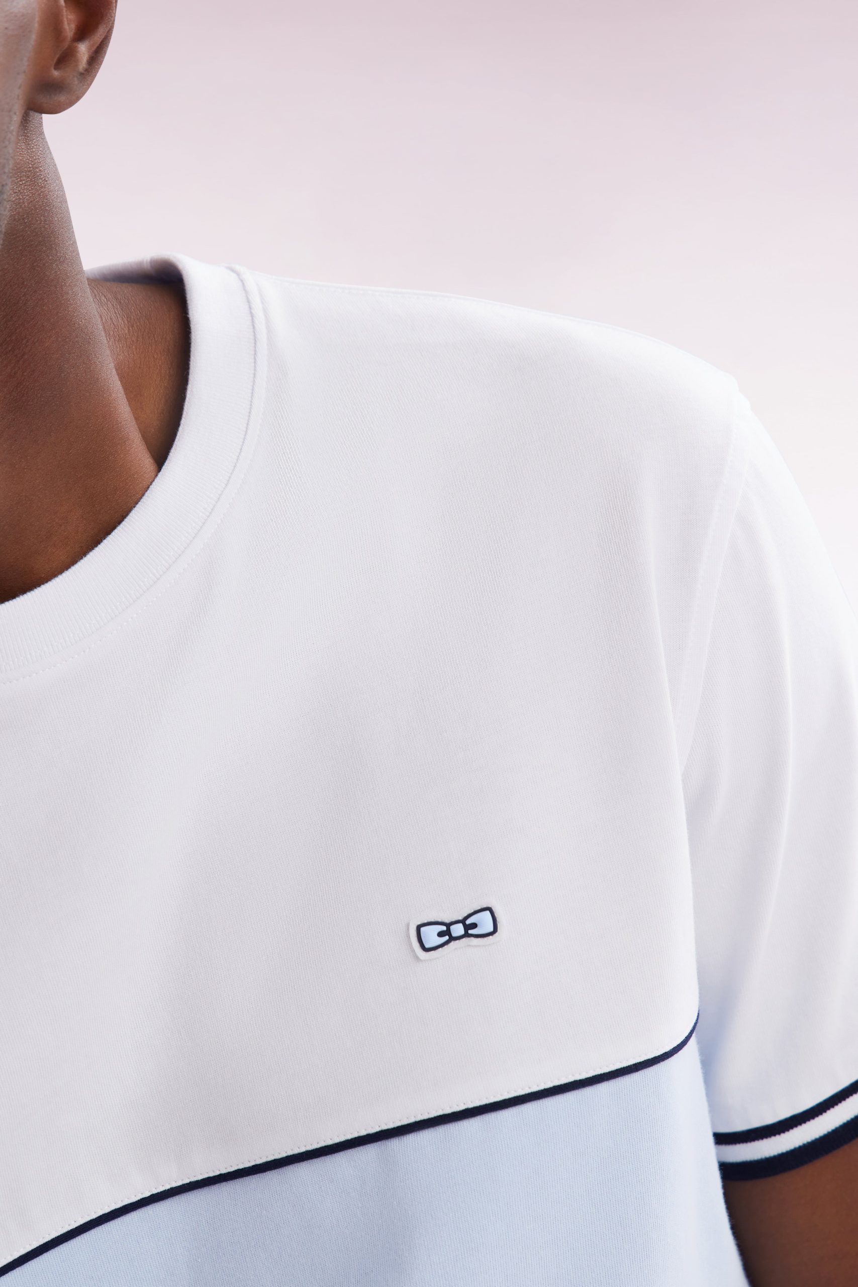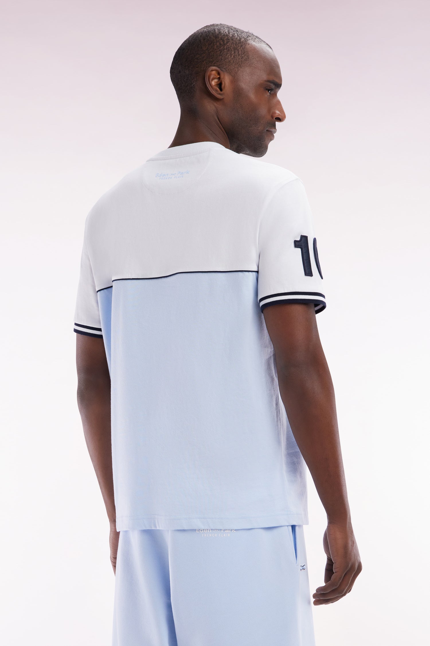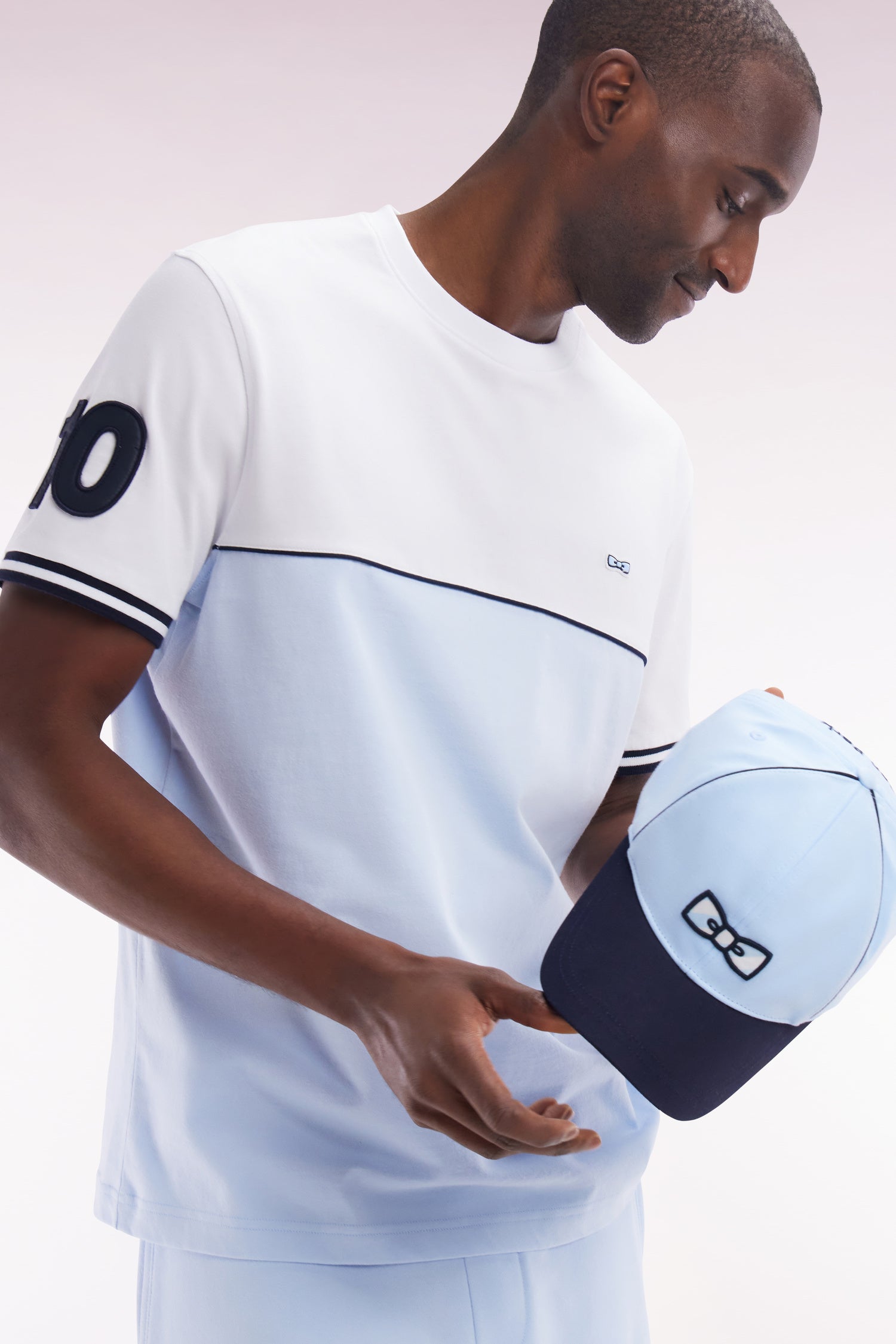Ce T-shirt bicolore en jersey de coton se décline en 4 coloris, offrant une élégance sportive et graphique. Ses détails soignés : bords-côtes rayés, passepoil, broderie nœud papillon sur la poitrine et écusson numéro 10 sur la manche, en font une pièce phare du vestiaire masculin.