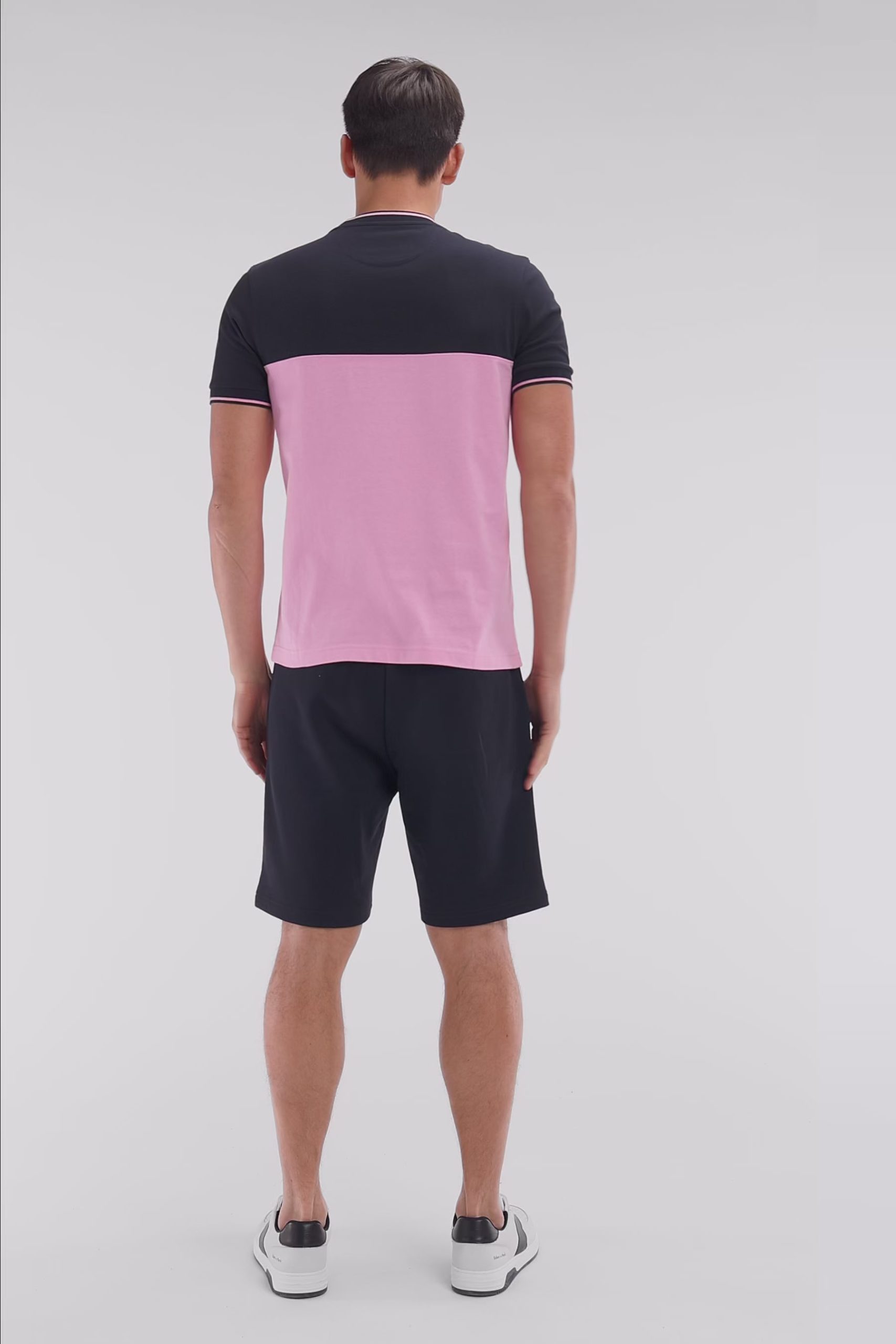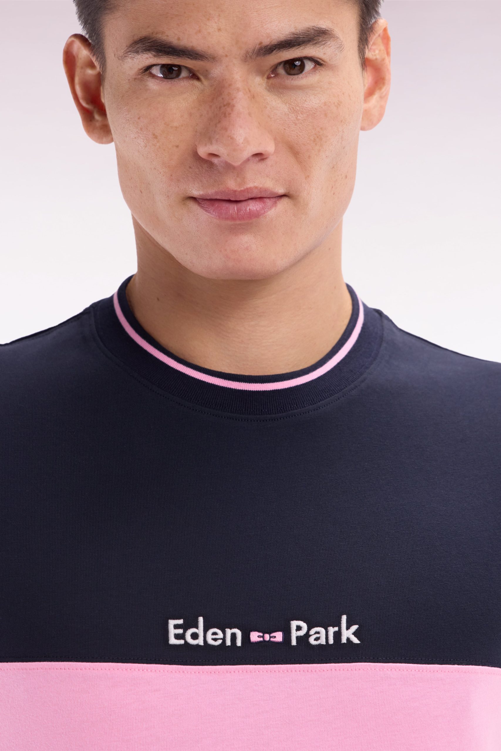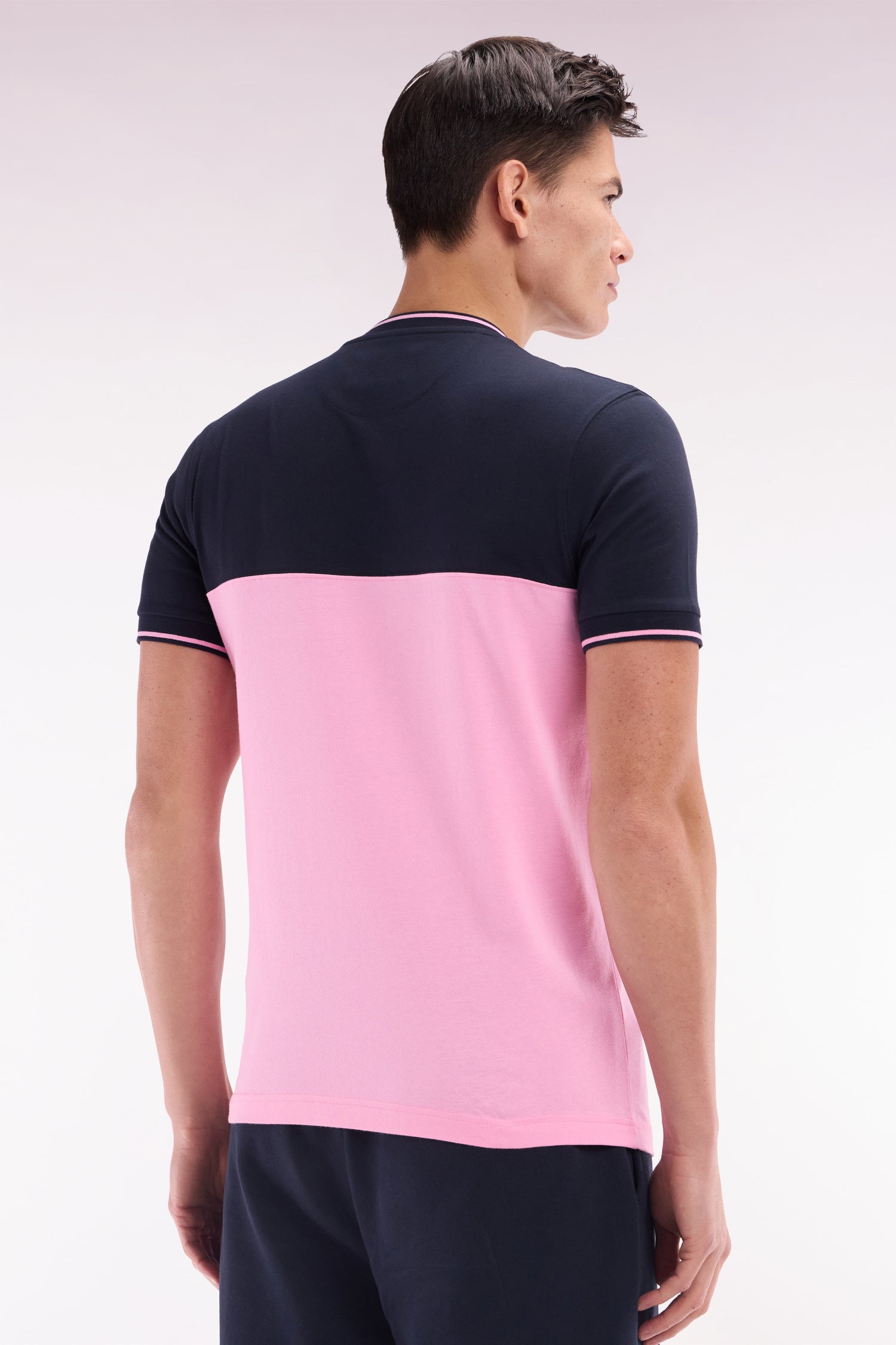 Ce T-shirt bicolore présente une broderie poitrine au nom de notre Maison, un détail qui s’ajoute à ses couleurs choisies dans nos codes emblématiques. Aux bordures de manches et à l’encolure, ce T-shirt en coton présente des bords-côtes subtilement rayés pour une touche sport-chic.