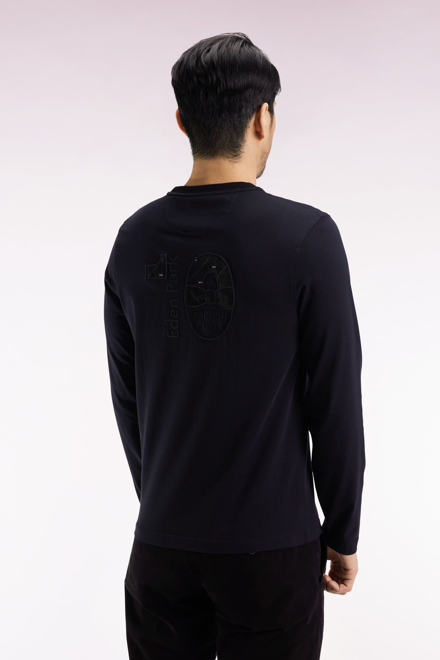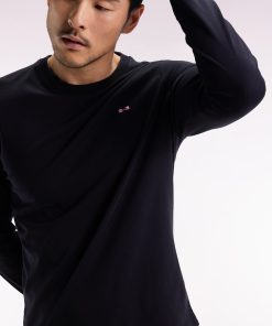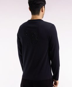 Essentiel du vestiaire masculin automne – hiver, ce T-shirt à manches longues en pur coton noir séduit par sa simplicité. Sa coupe droite et son col rond souligné de finitions bords-côtes assurent un confort de porté au quotidien, tandis que le noir profond rehausse son élégance discrète. À porter seul ou en superposition
