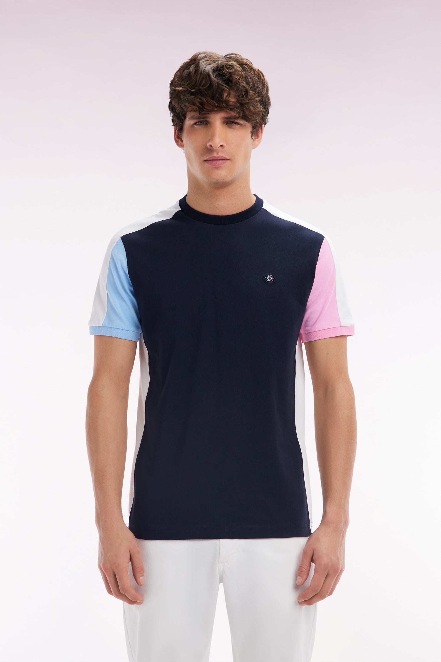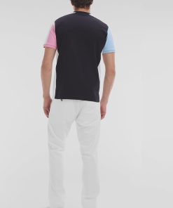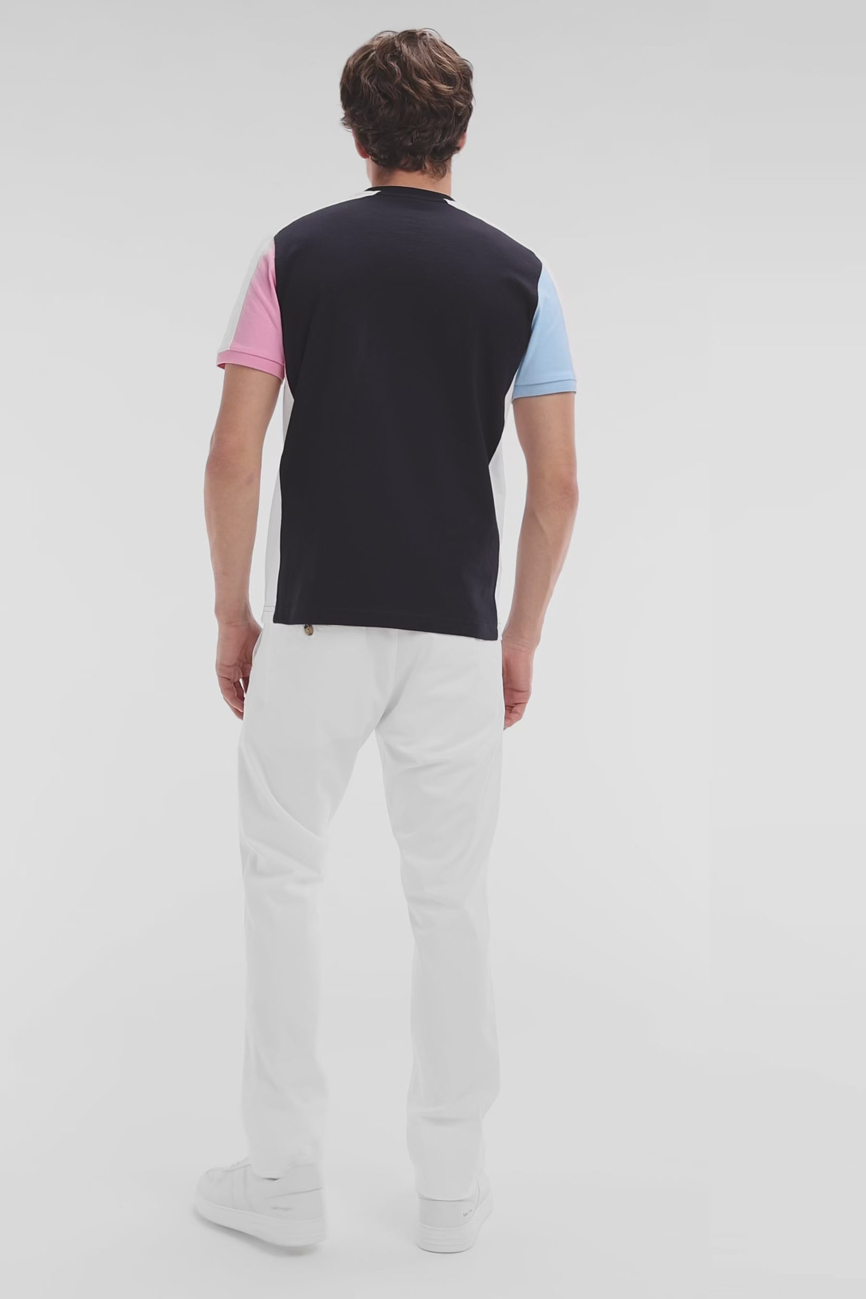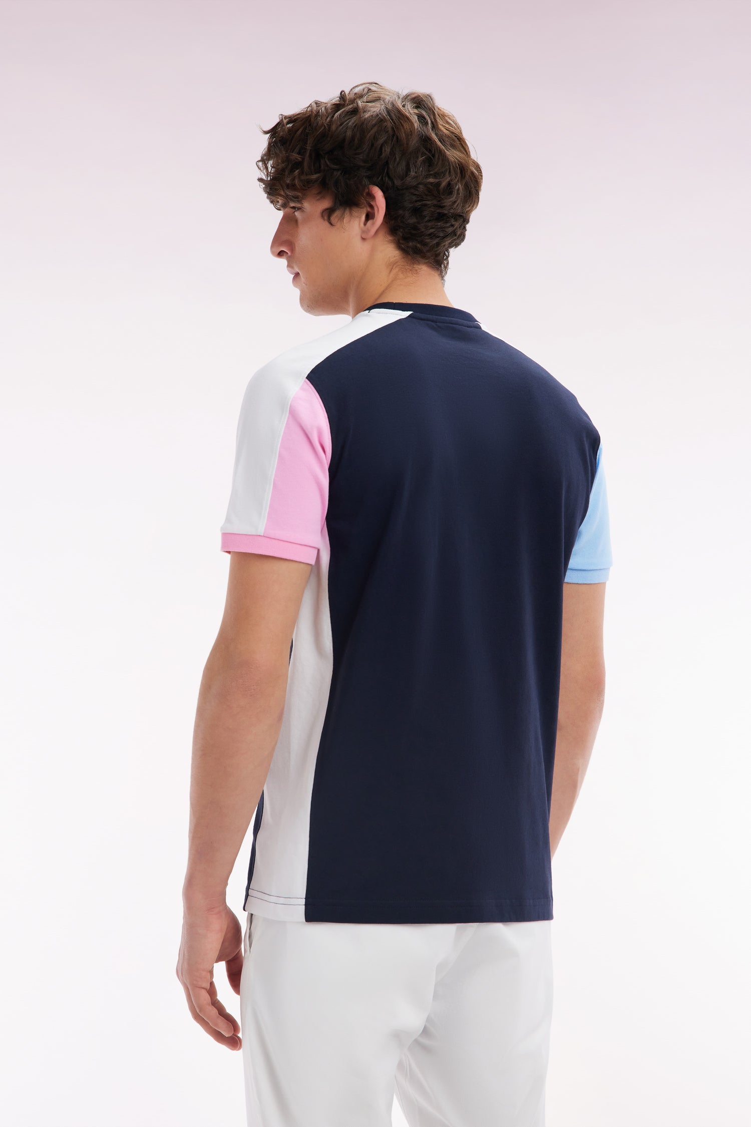 Ce T-shirt colorblock, emblématique des collections de la Maison, se décline sur une base marine ou blanche, agrémentée de détails bleu, blanc et rose. Son badge en silicône, en forme de ballon de rugby orné de notre nœud papillon, et ses découpes graphiques apportent une touche lumineuse et dynamique à la silhouette masculine.