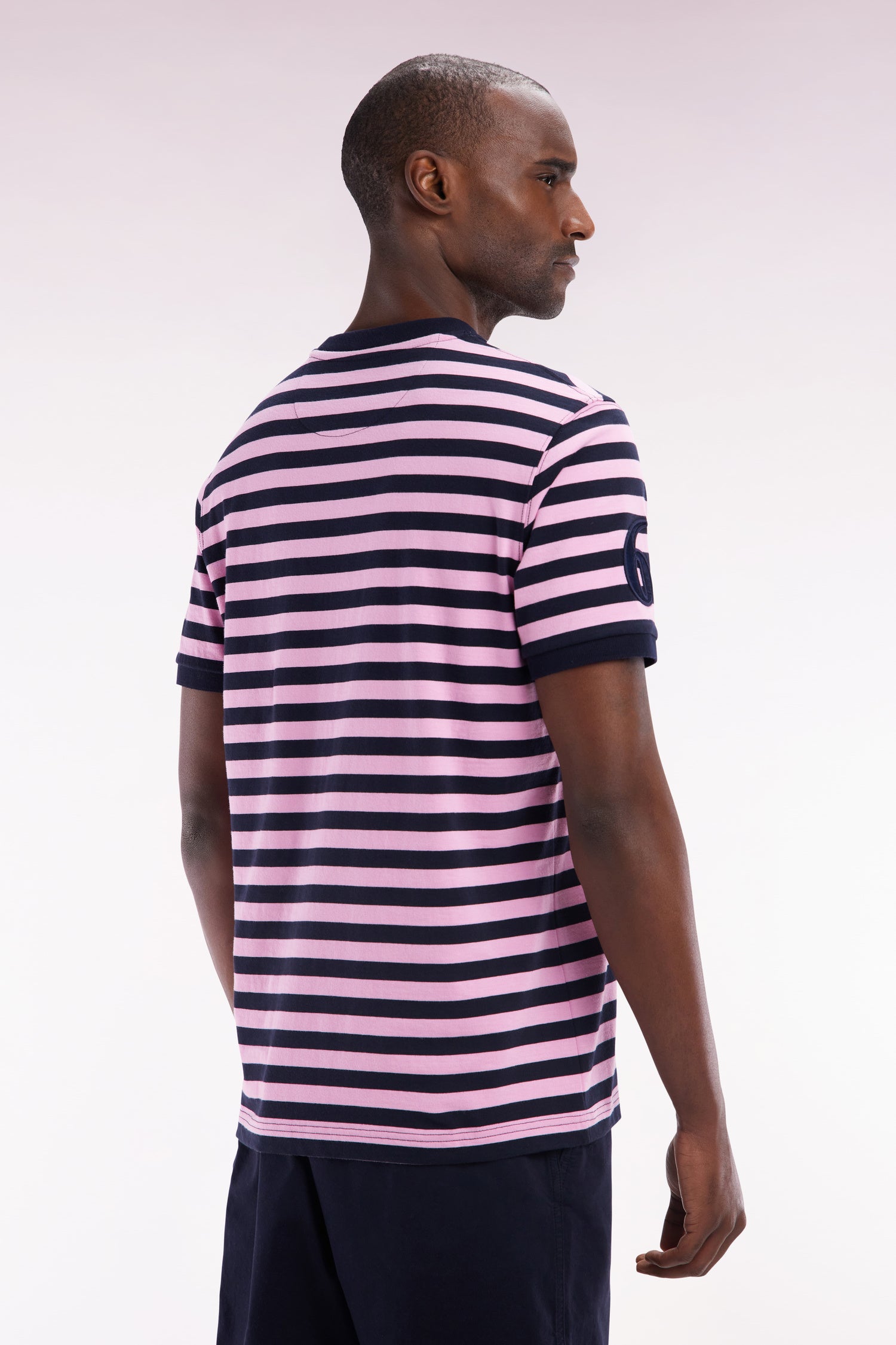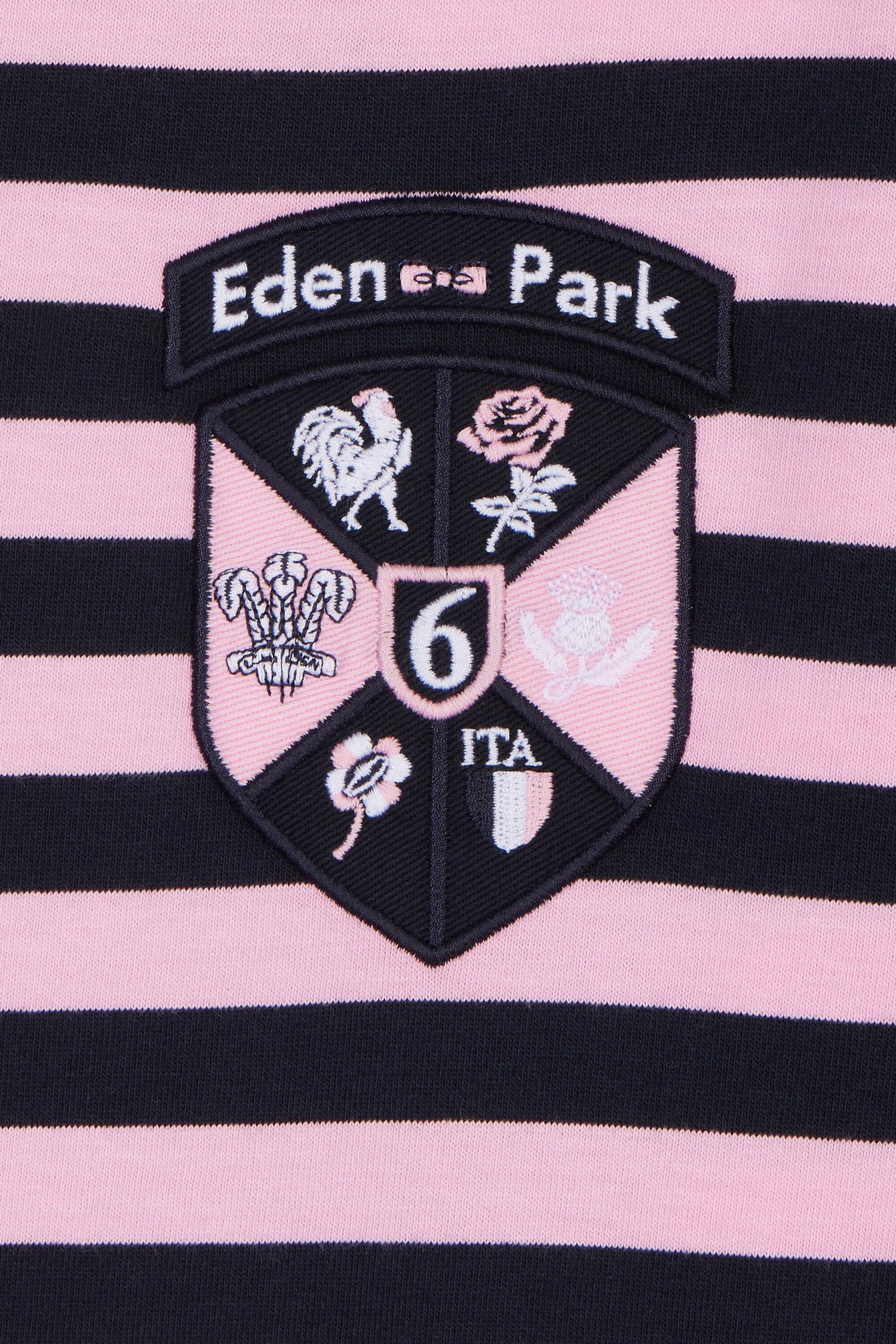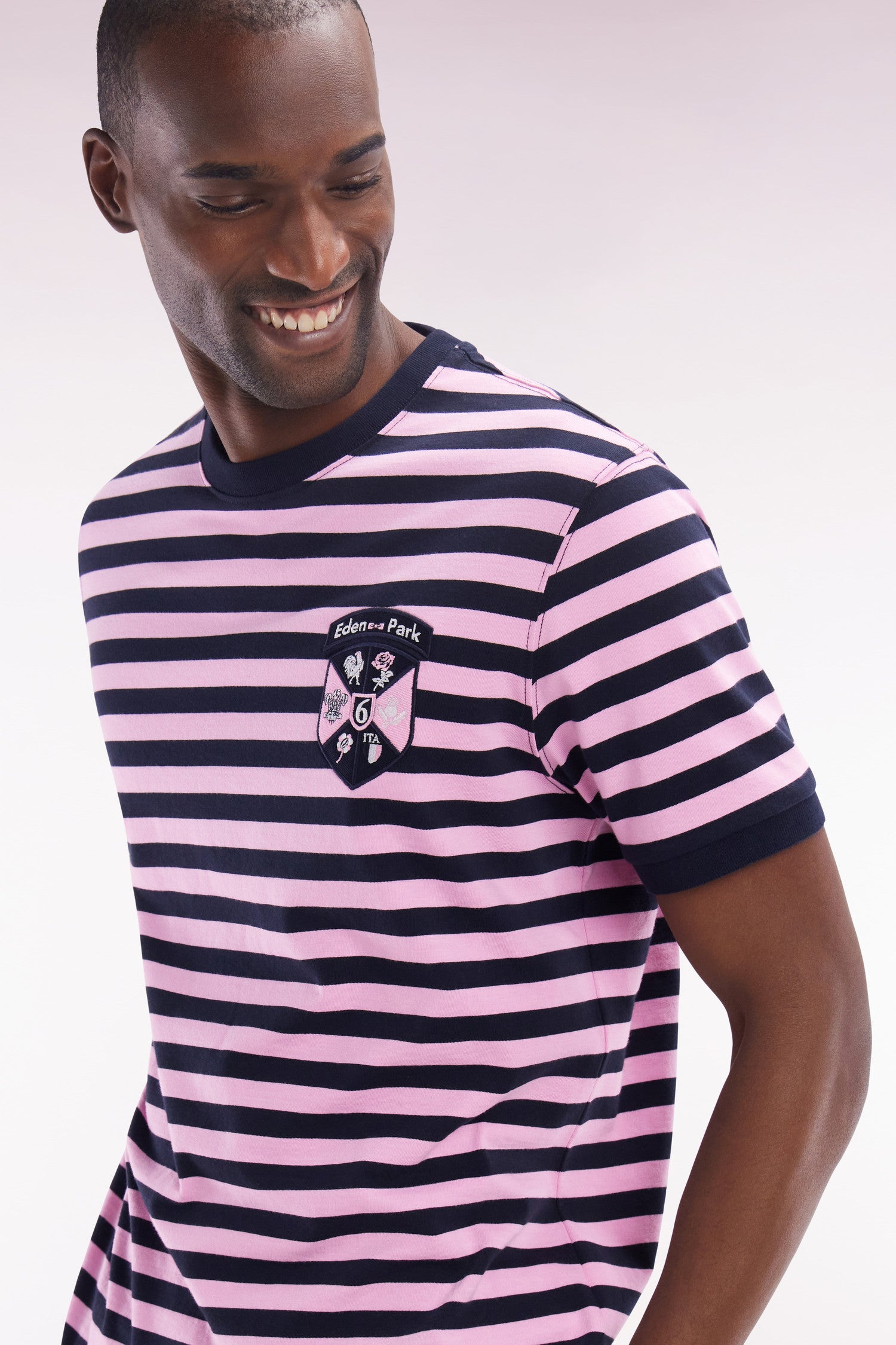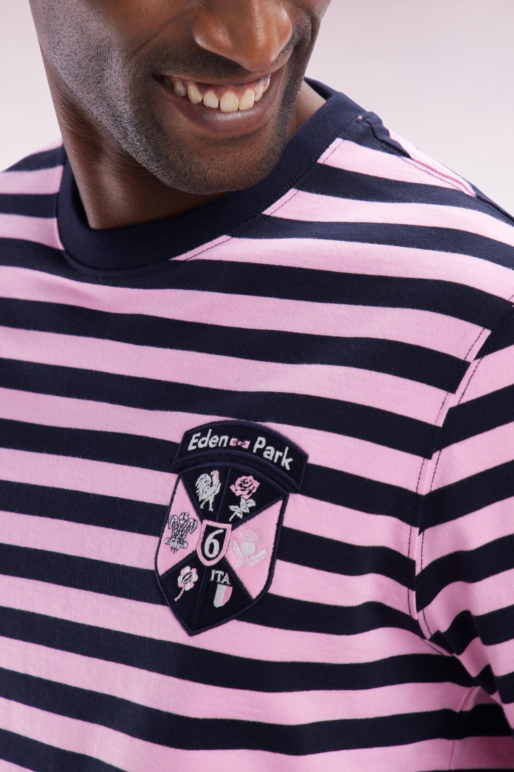 Ce t-shirt en jersey de coton à rayures bleu marine et rose intègre sans détours l’esprit rugby avec son écusson “6” brodé sur la manche, réhaussé par une application en nylon uni. Les bordures de manches et le col en bord-côtes tricoté à plat complètent son allure, tandis que l’écusson Six Nations brodé sur la poitrine lui confère un caractère authentique. Un modèle qui marie élégance et esprit sportif.