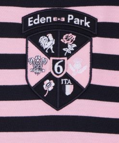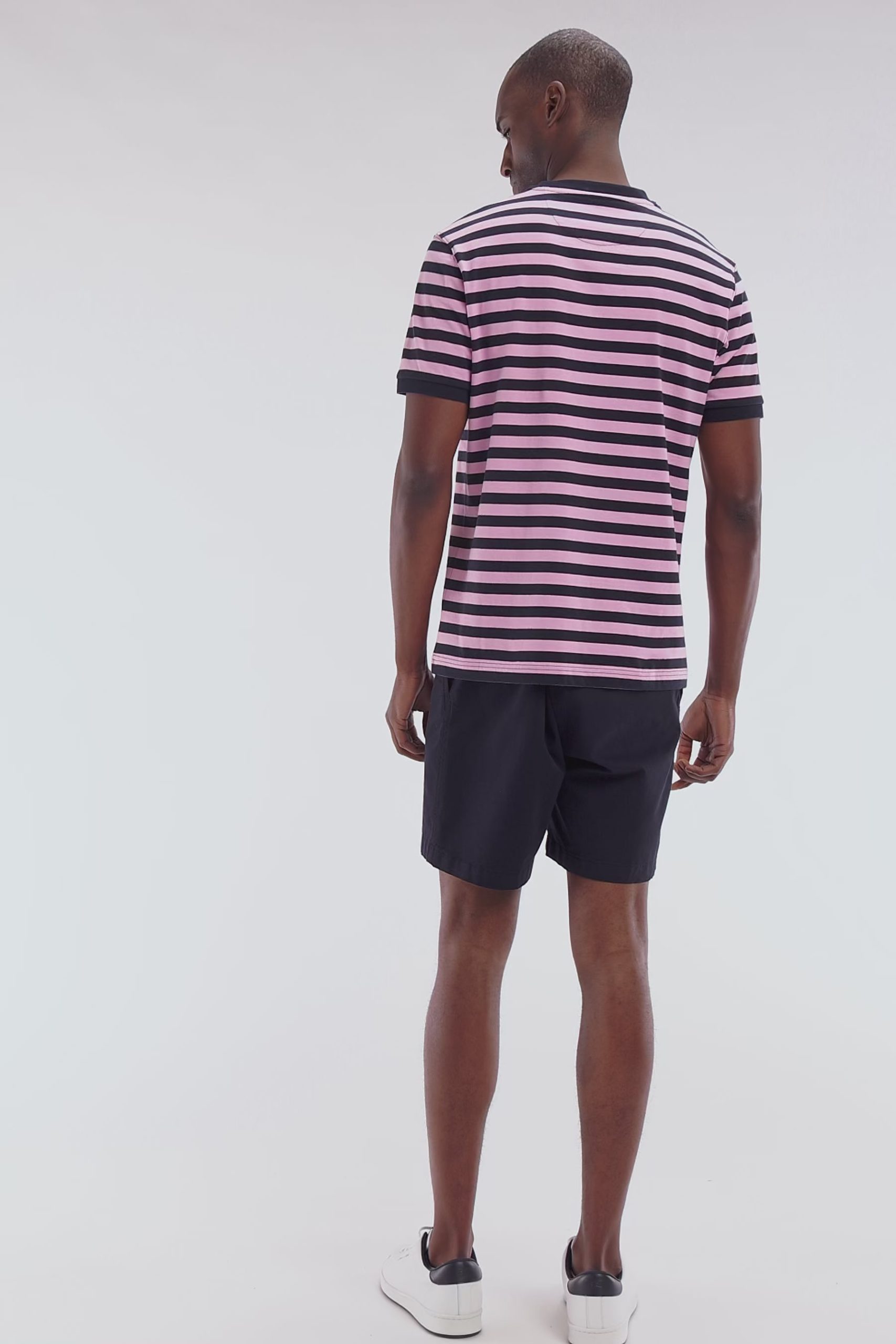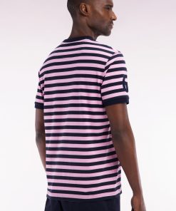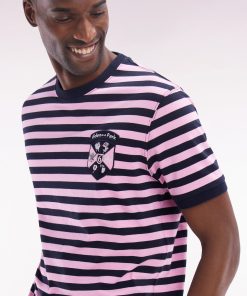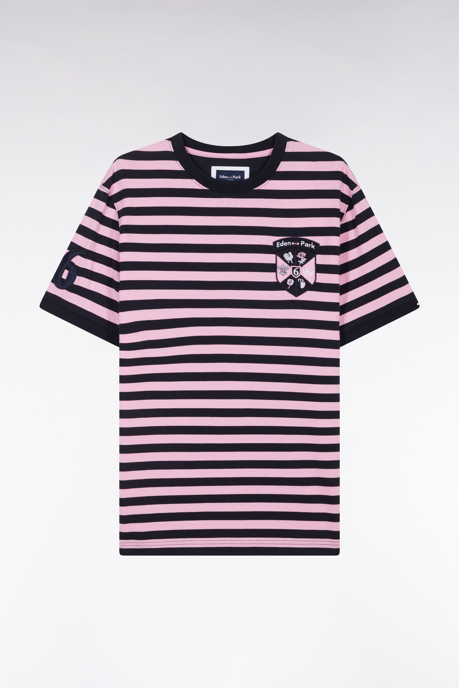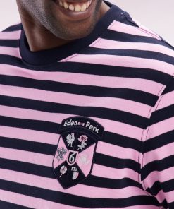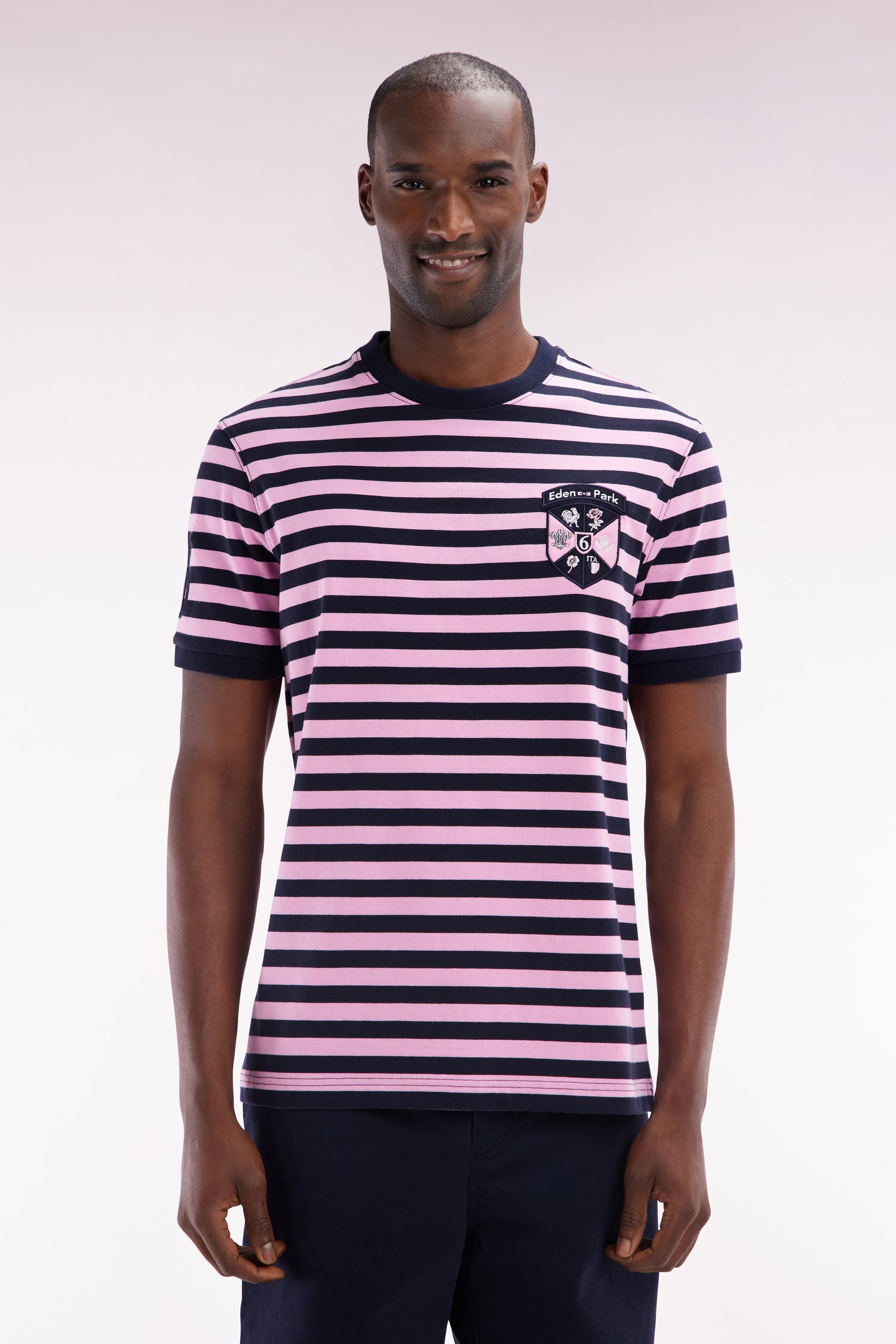 Ce t-shirt en jersey de coton à rayures bleu marine et rose intègre sans détours l’esprit rugby avec son écusson “6” brodé sur la manche, réhaussé par une application en nylon uni. Les bordures de manches et le col en bord-côtes tricoté à plat complètent son allure, tandis que l’écusson Six Nations brodé sur la poitrine lui confère un caractère authentique. Un modèle qui marie élégance et esprit sportif.